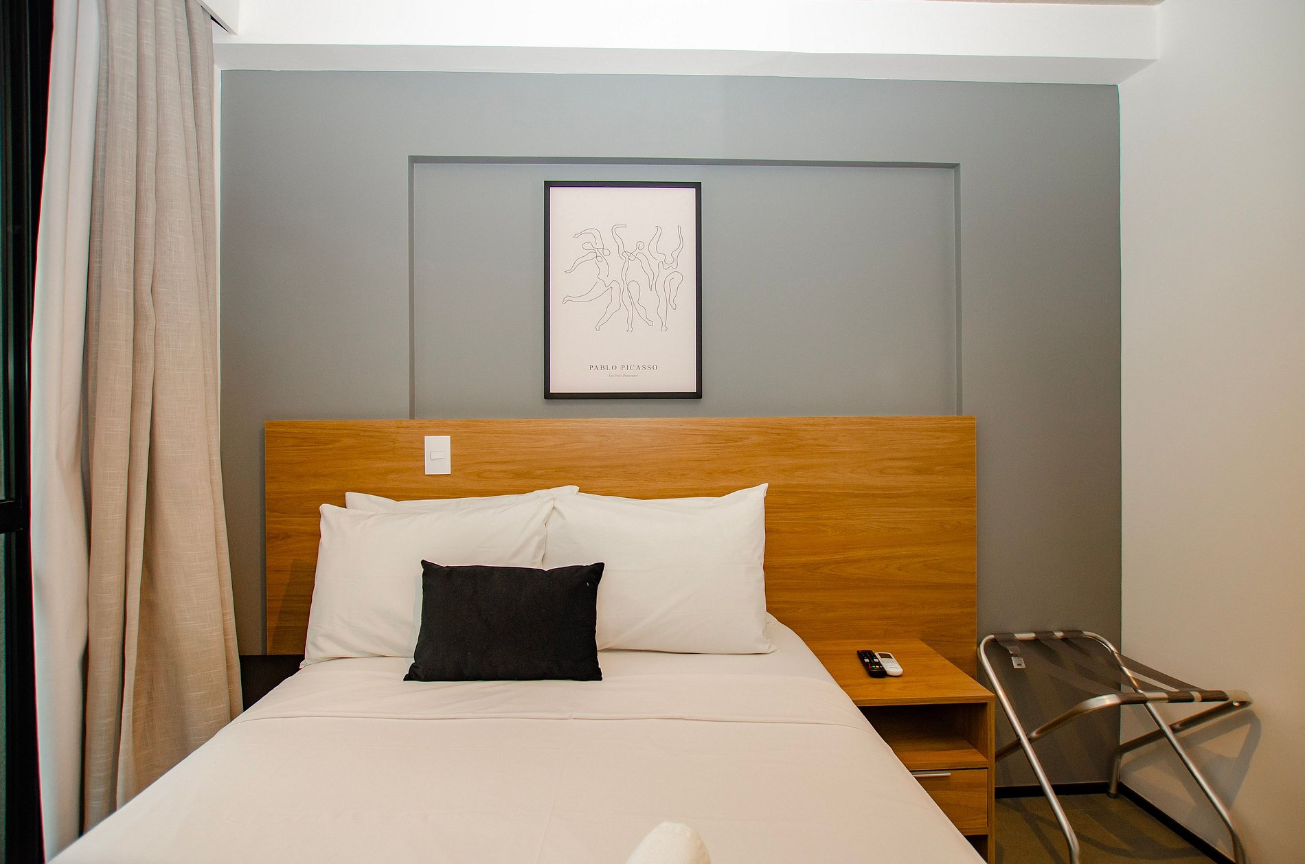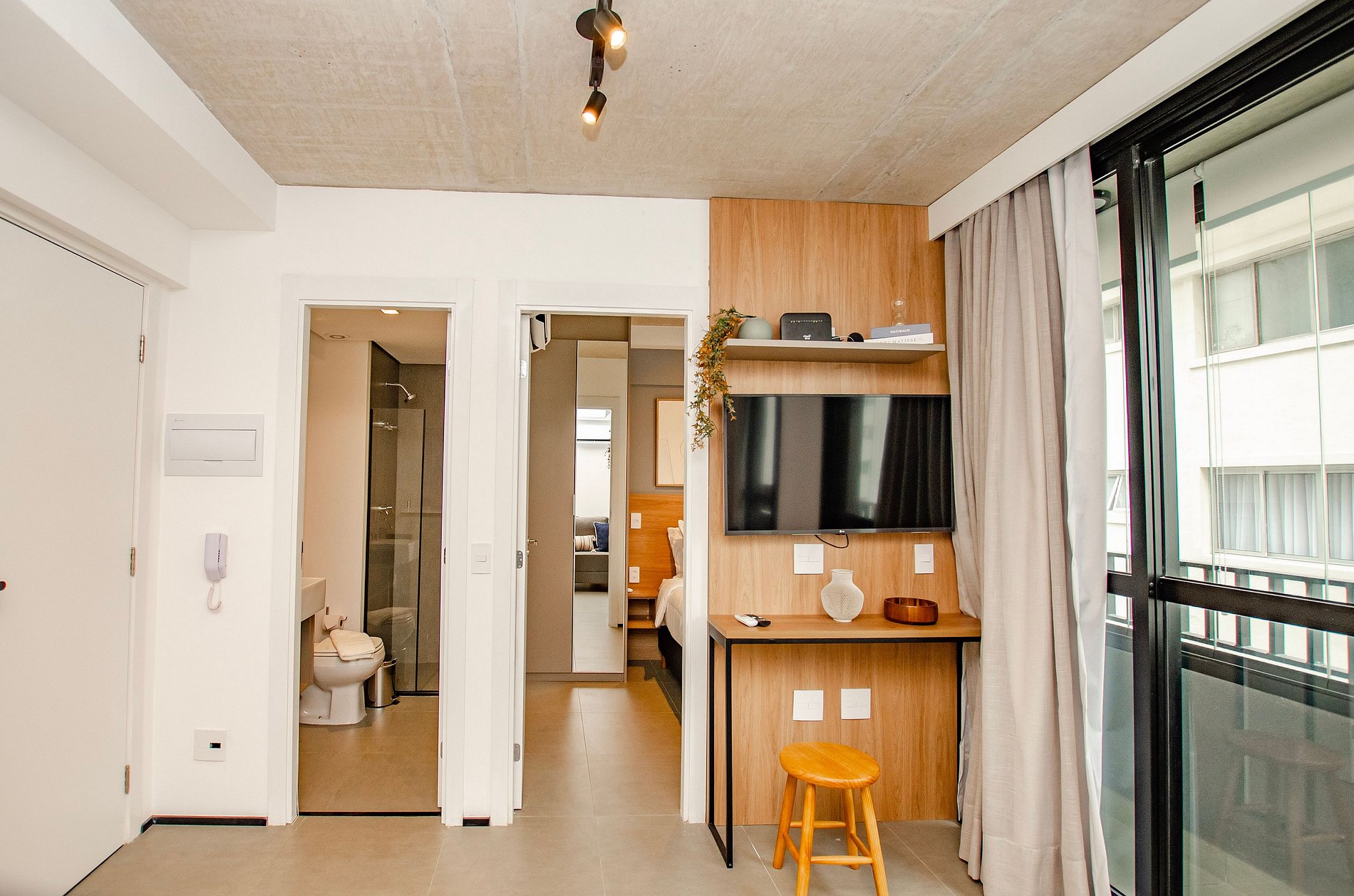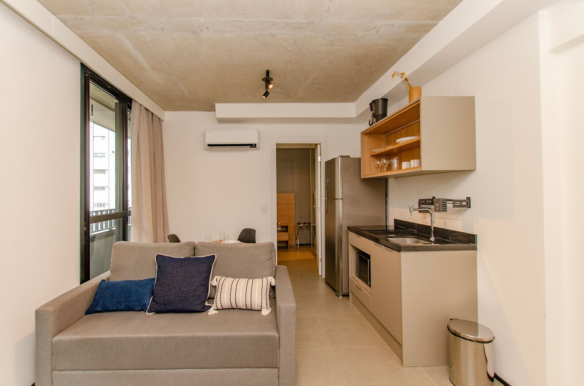 Sala: Sofá cama tamanho casal, ar-condicionado, cortina blackout e varanda.