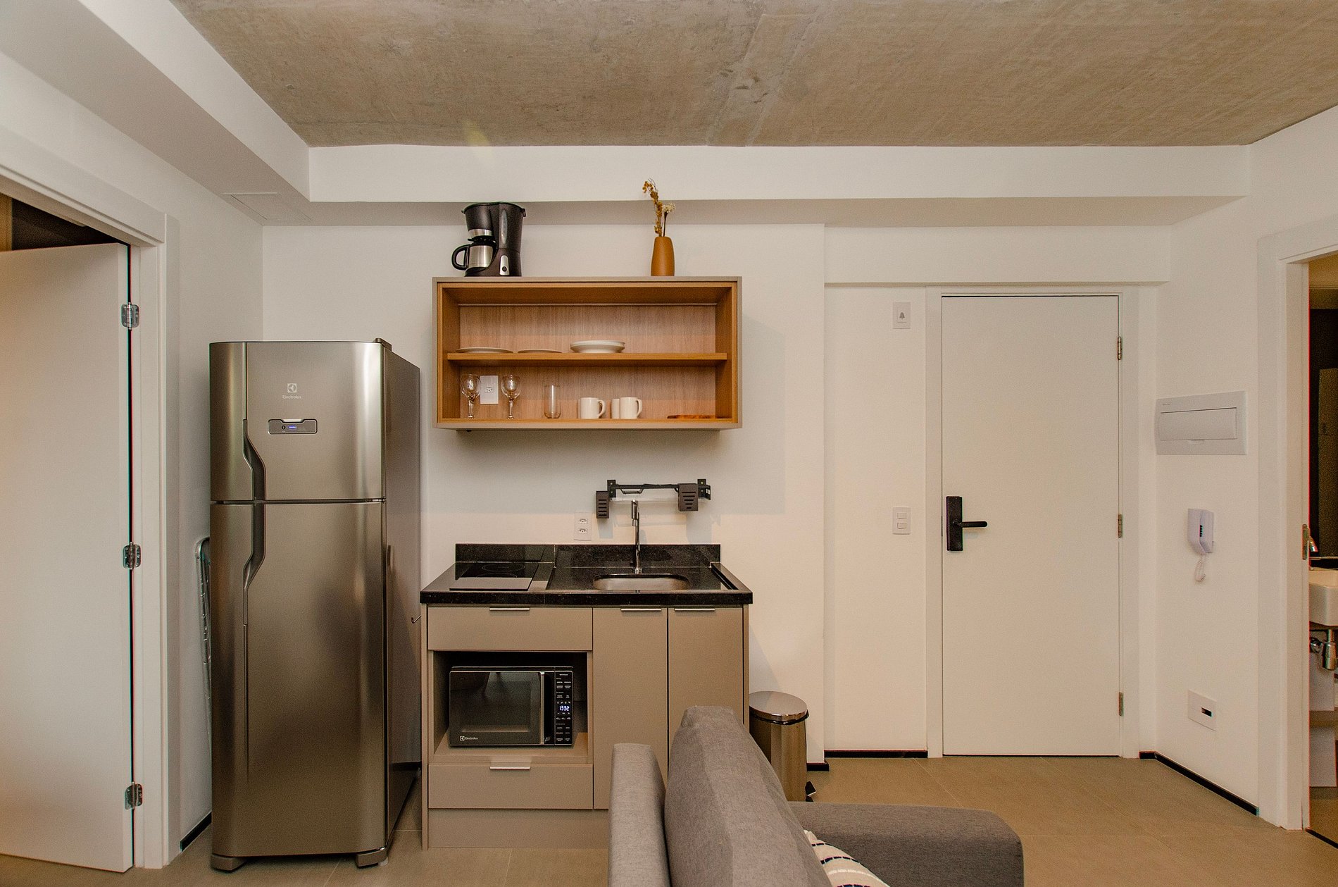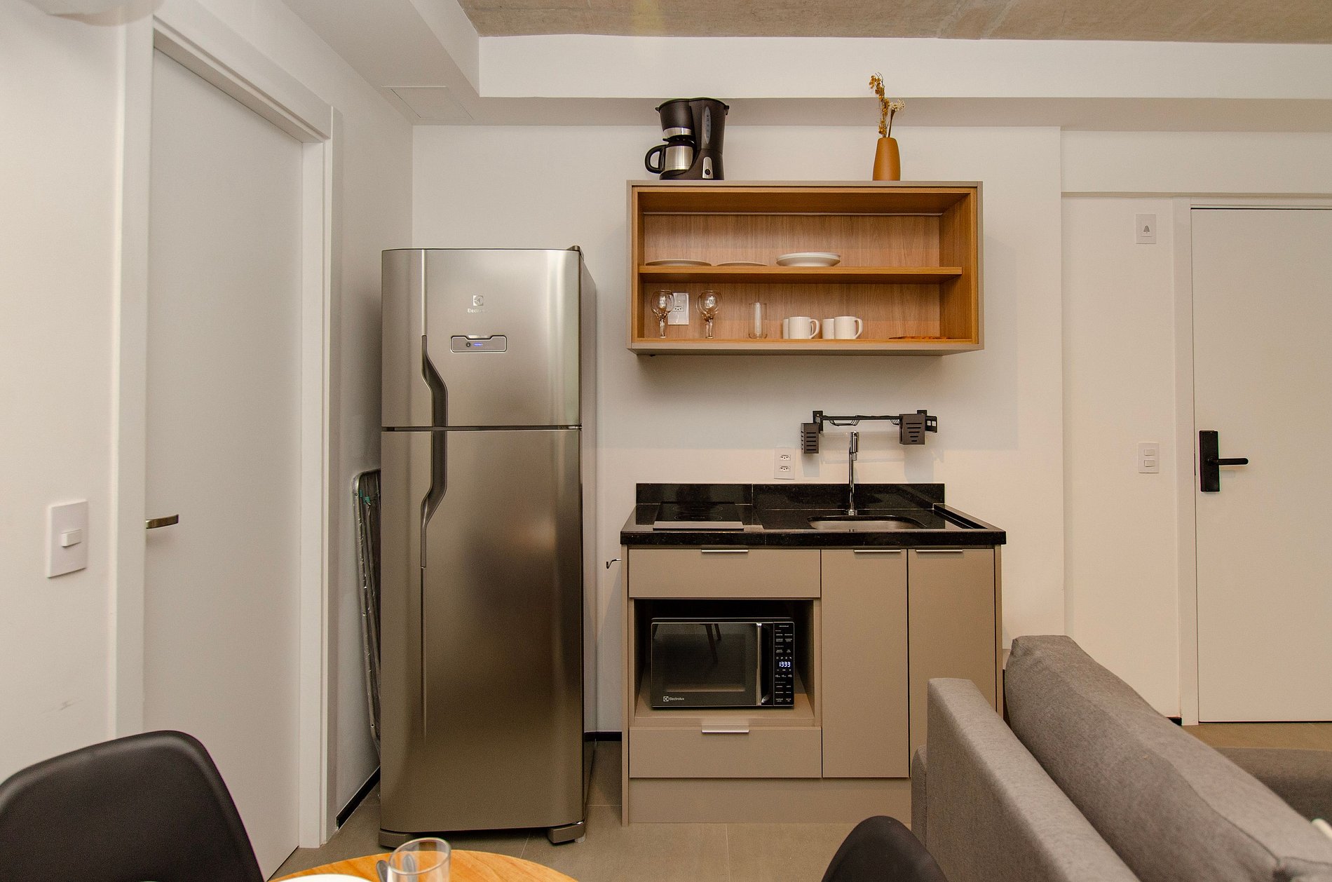 A cozinha equipada com itens básicos permite o preparo de pequenas refeições, garantindo mais autonomia no dia a dia.