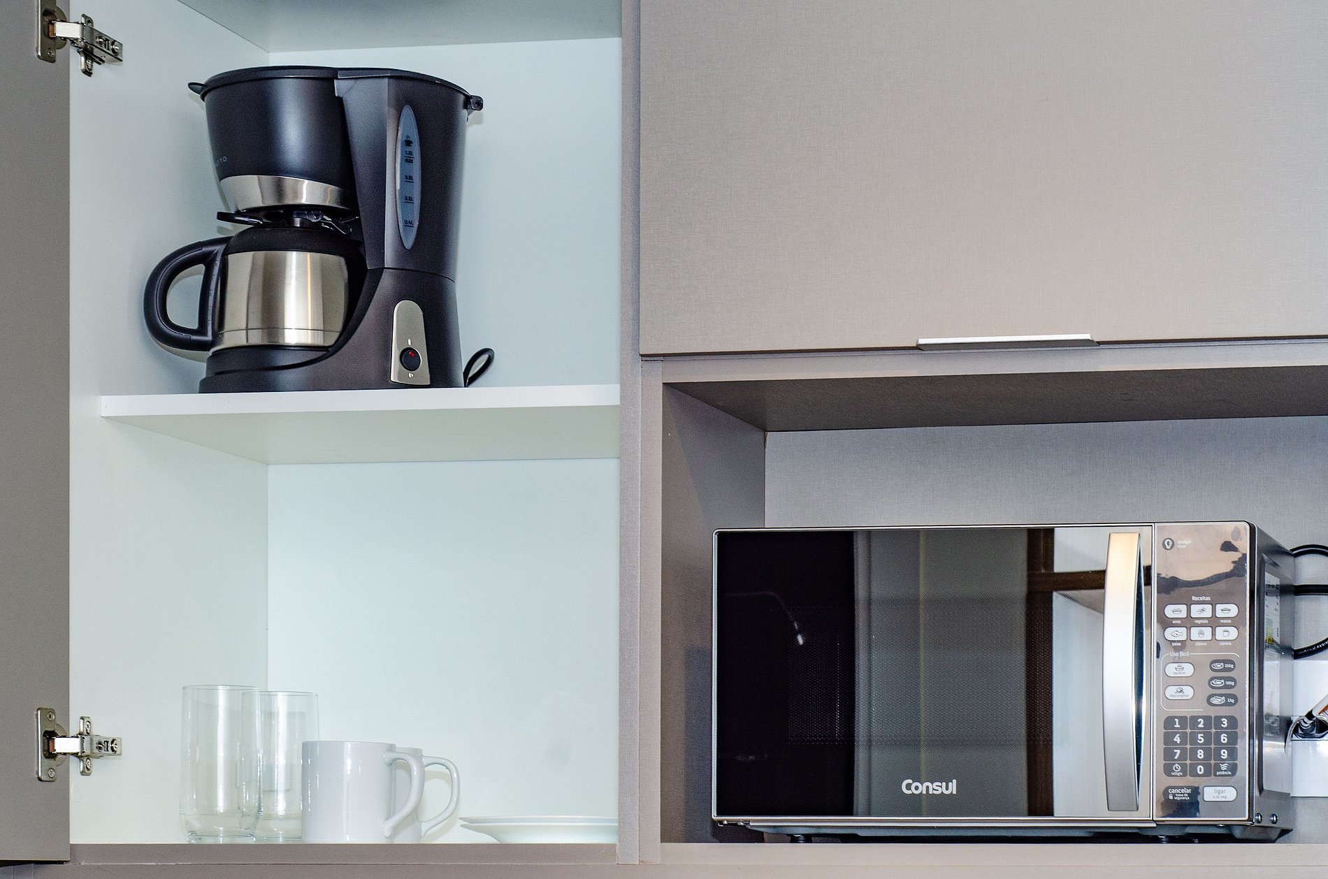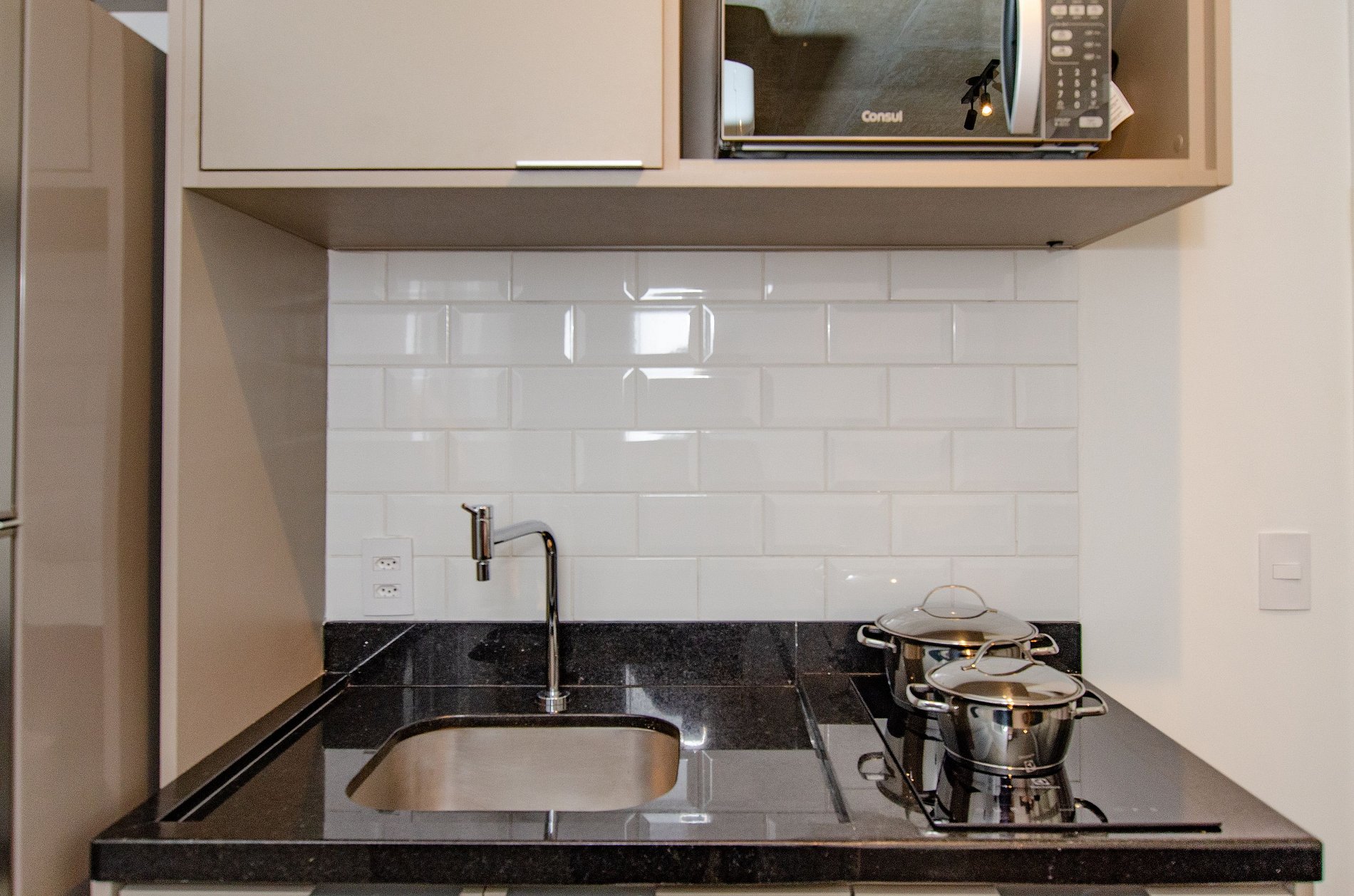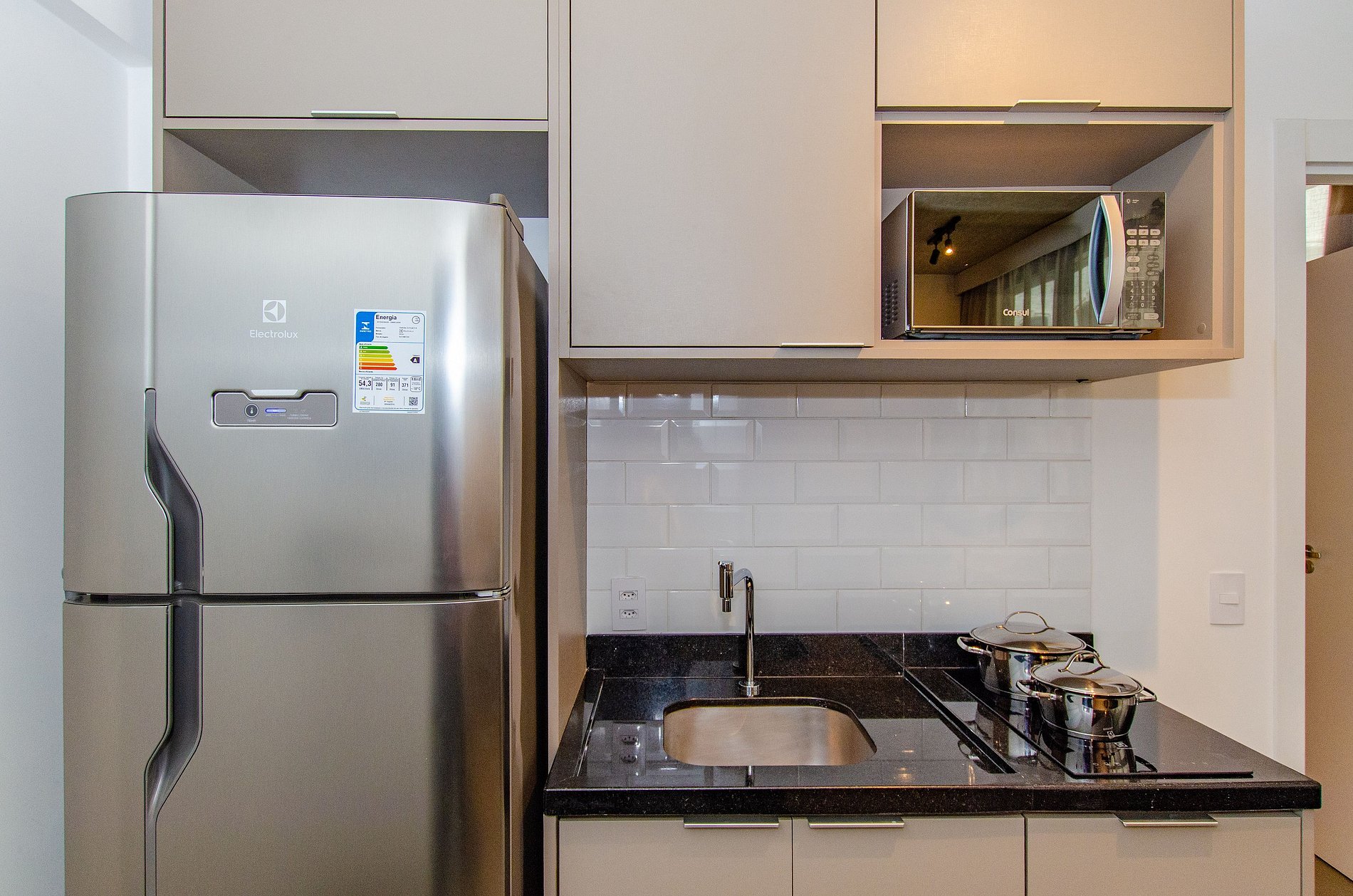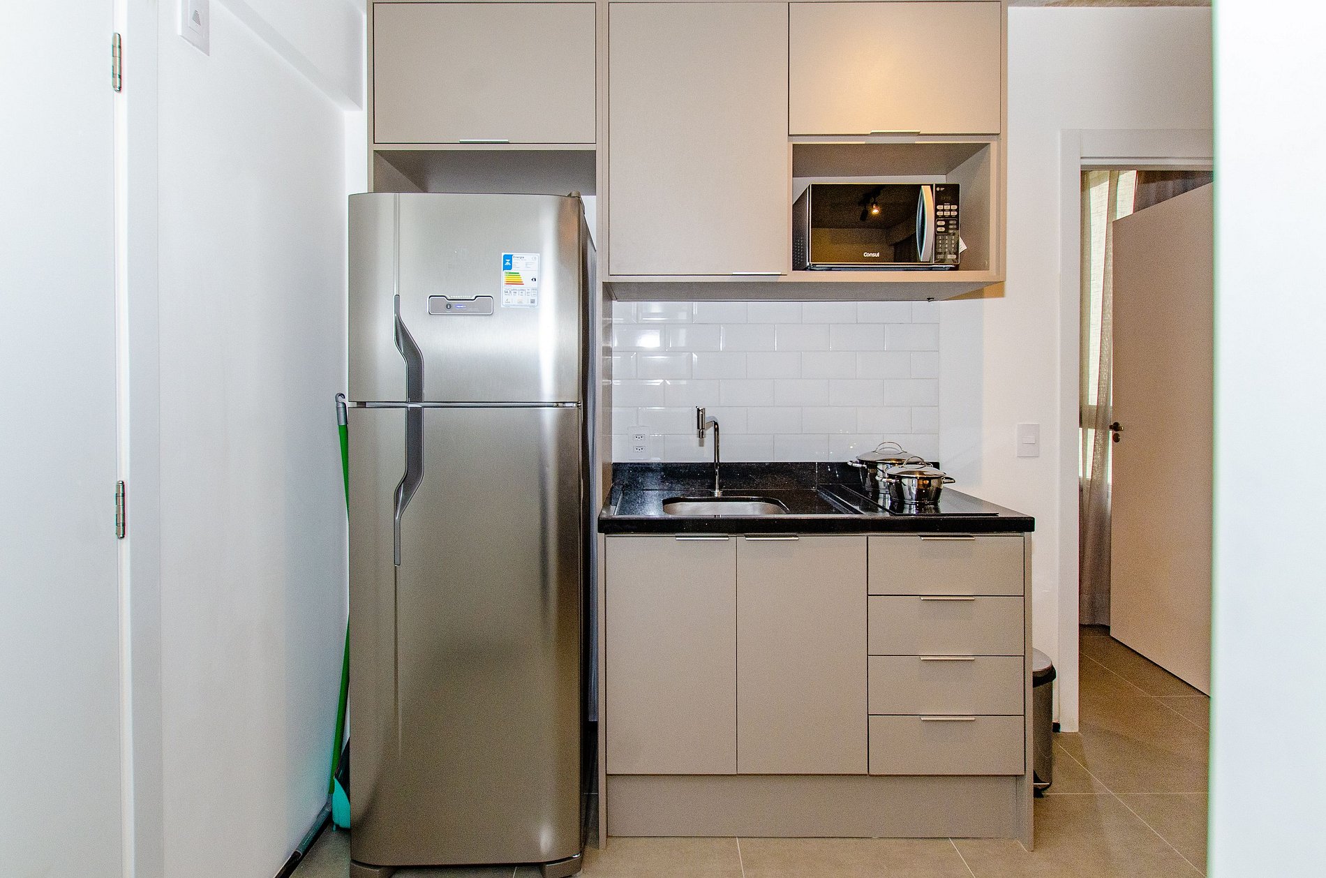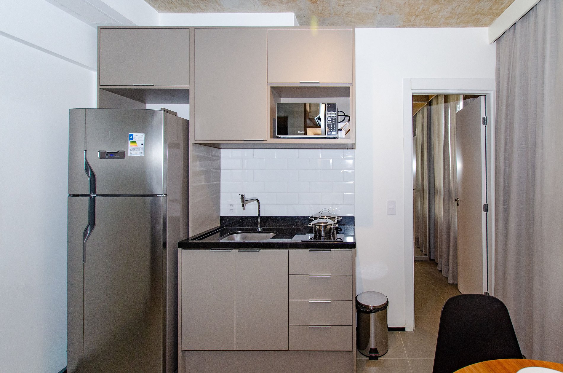 A cozinha equipada com itens básicos permite o preparo de pequenas refeições, garantindo mais autonomia no dia a dia.