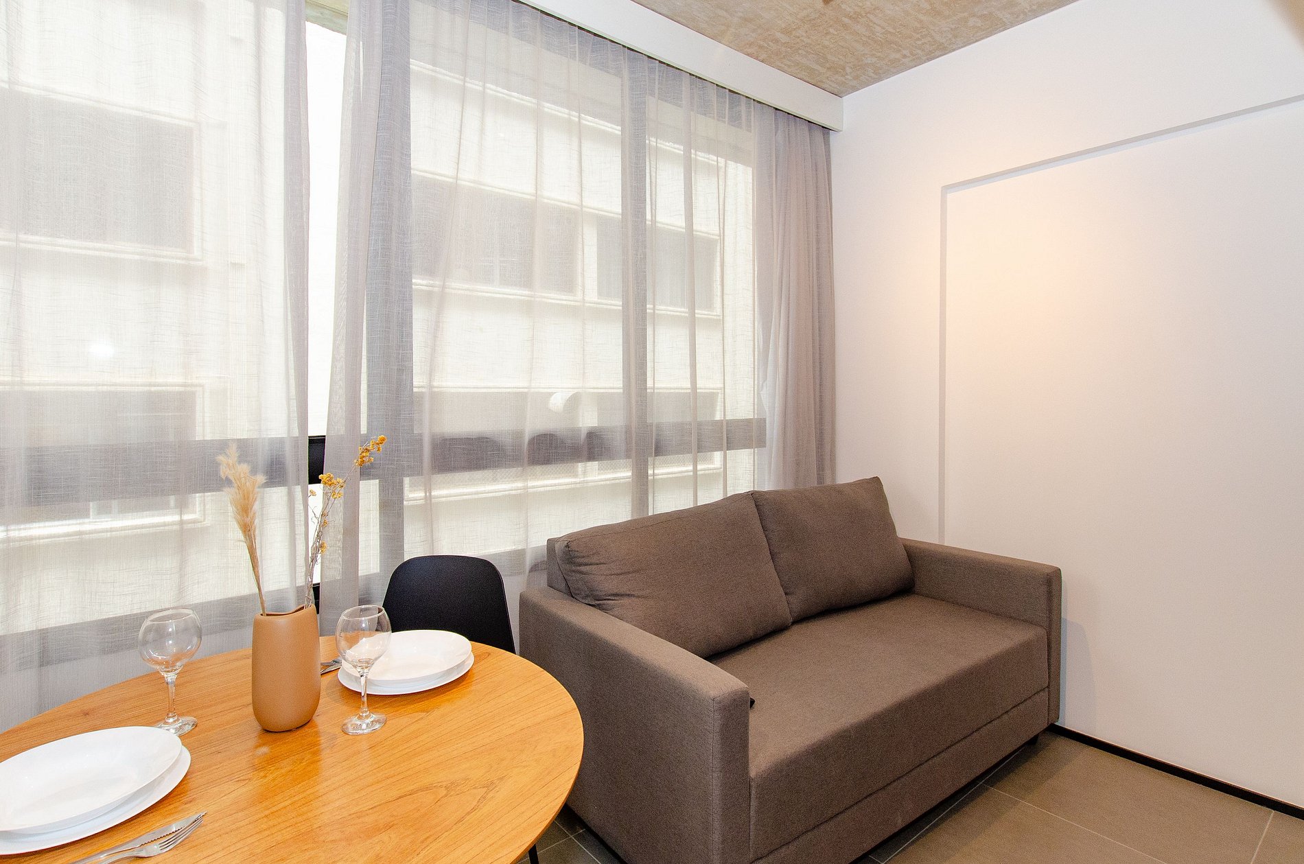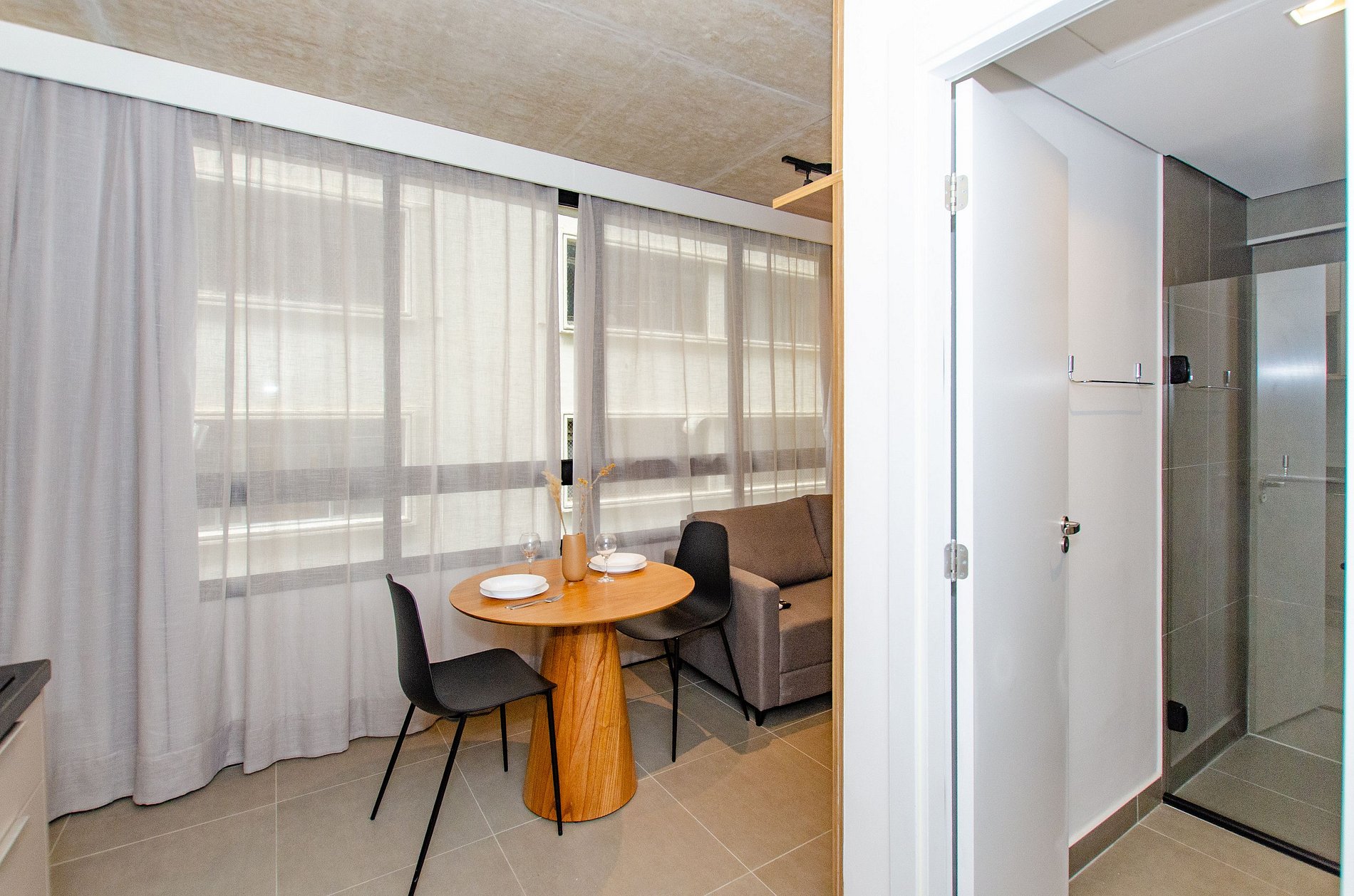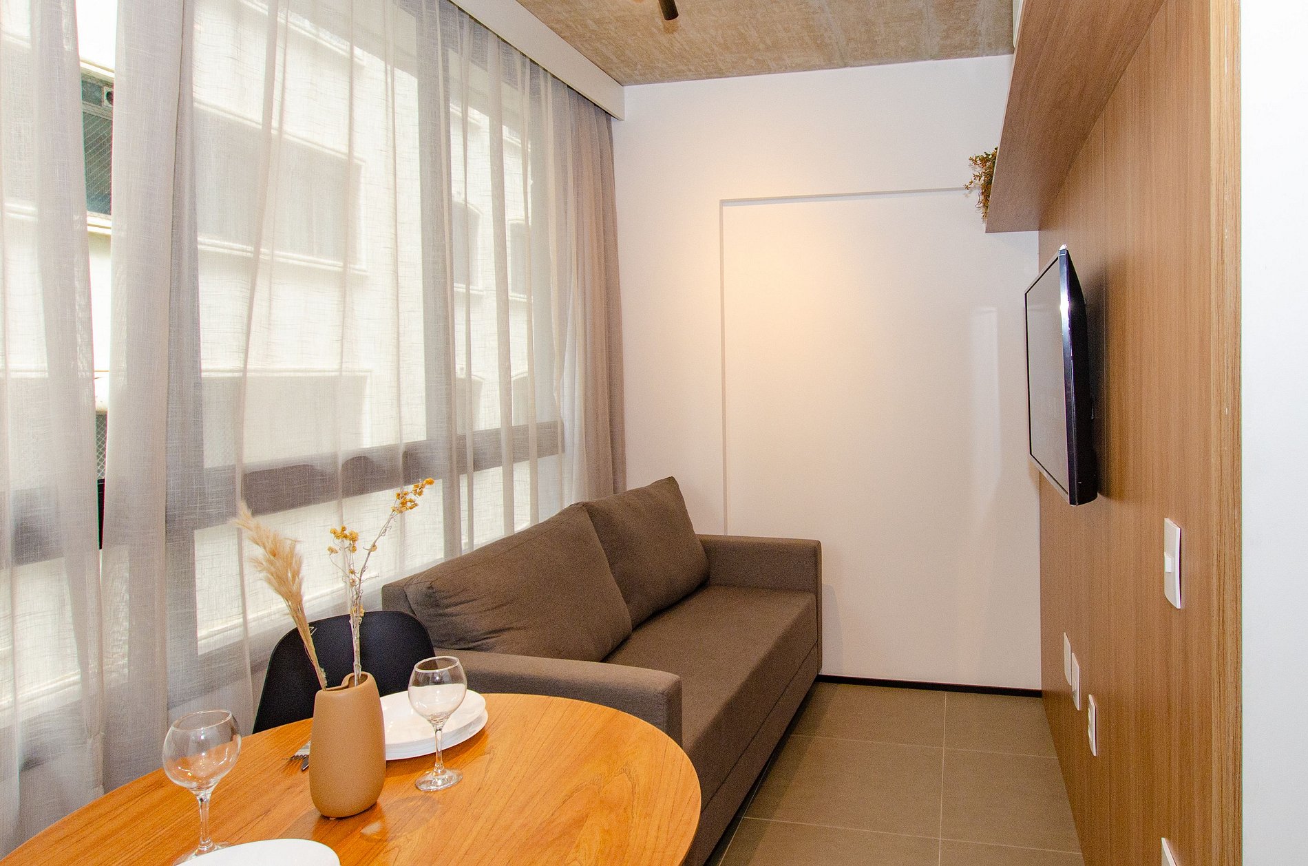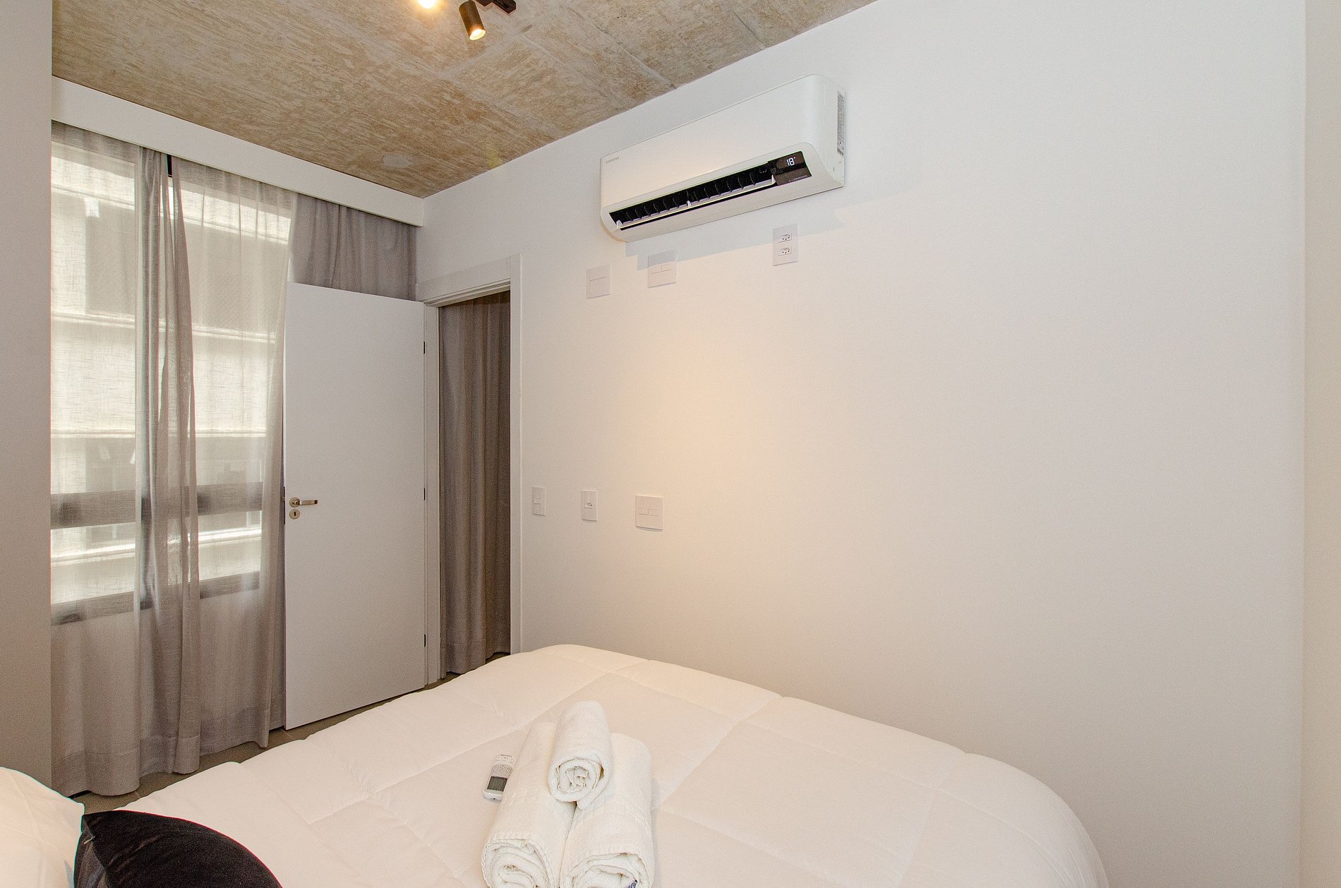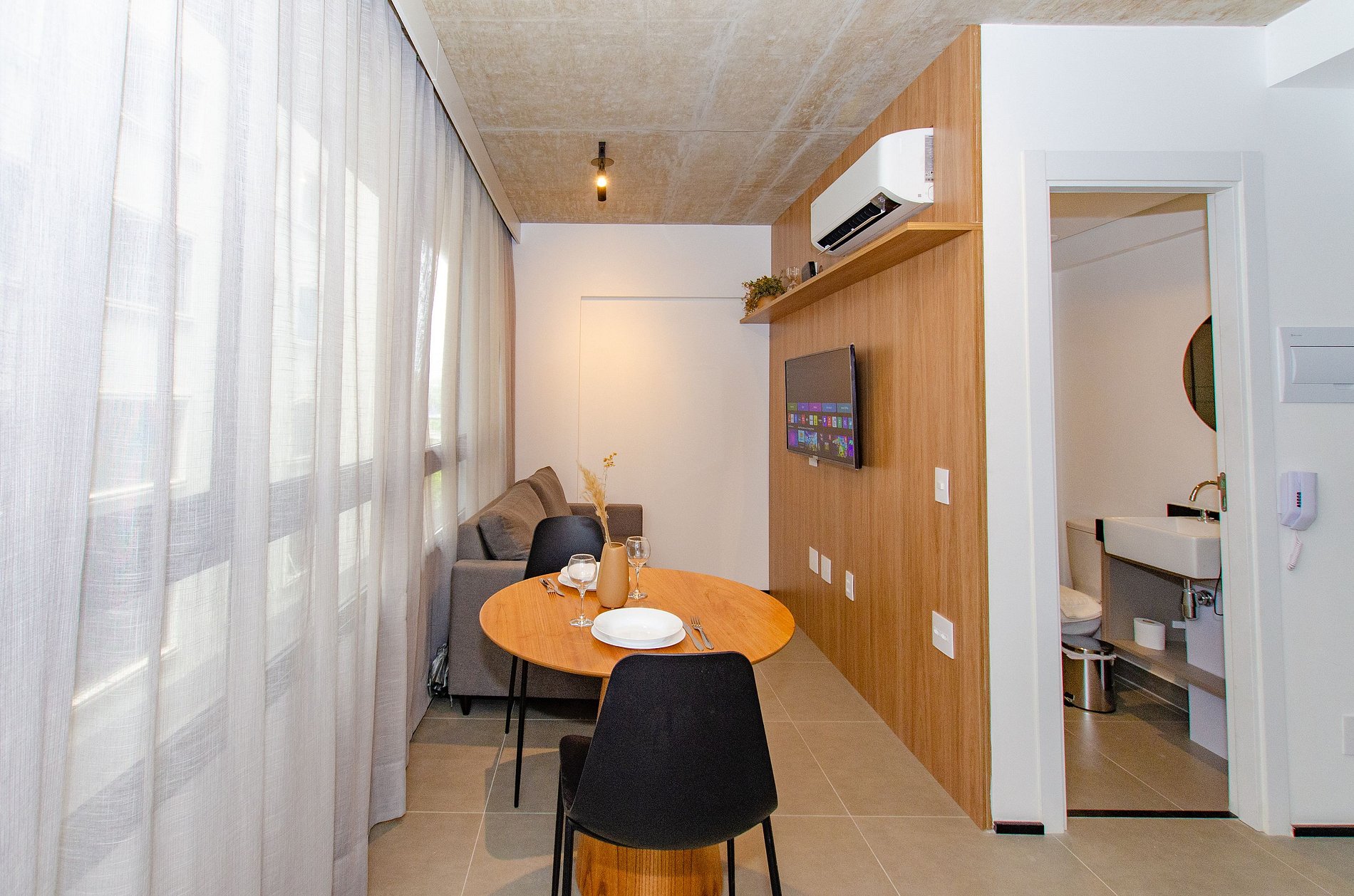 O apartamento também dispõe de ar-condicionado (somente refrigeração) e de janelas largas que deixam o ambiente mais agradável com a entrada de luz natural.