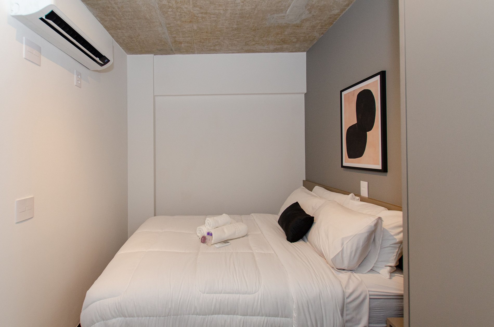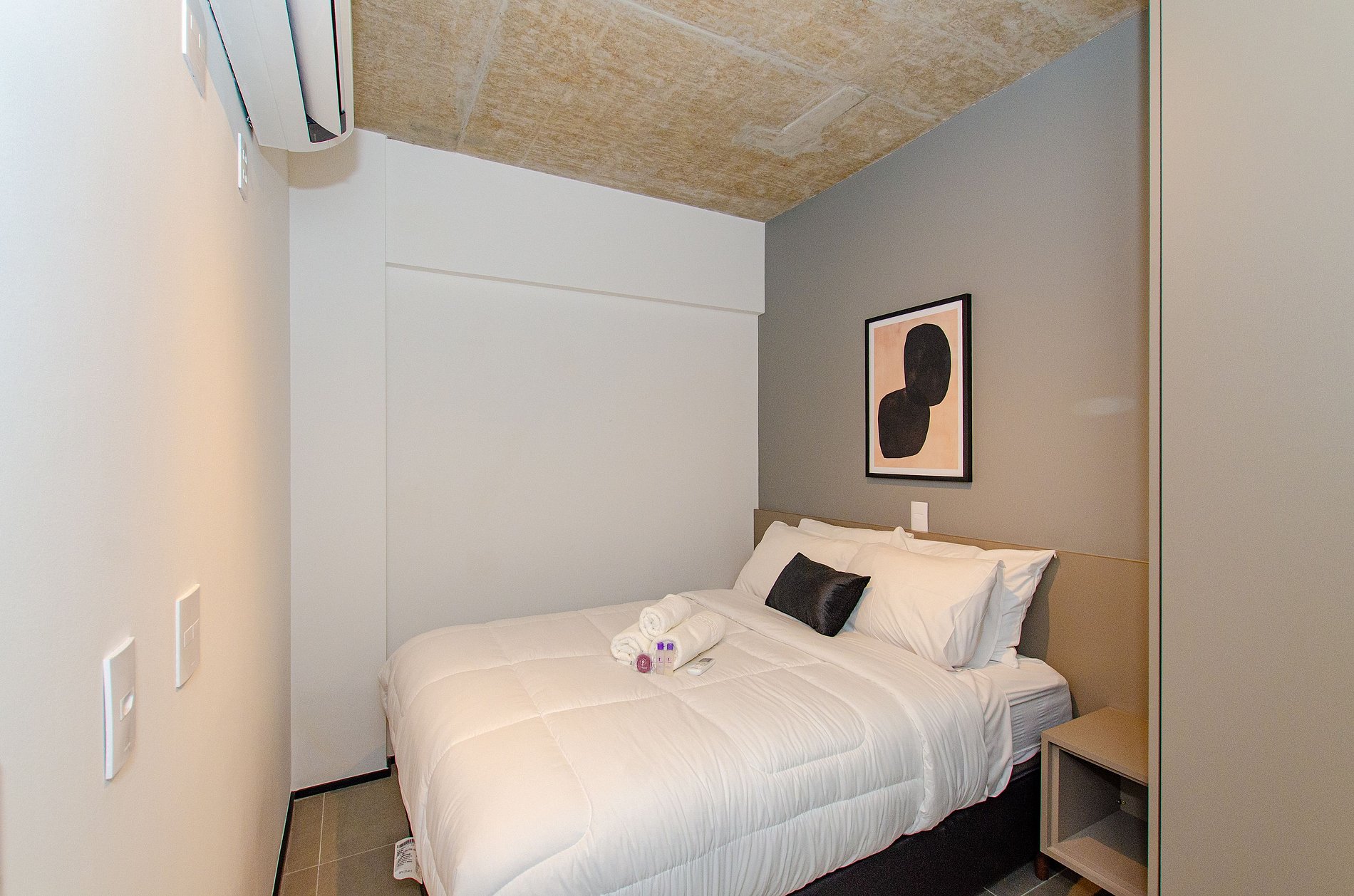 Acomodando até duas pessoas, o espaço oferece uma cama tamanho casal padrão e um enxoval de cama e banho fornecido no início da estadia, sem trocas ou reposições.