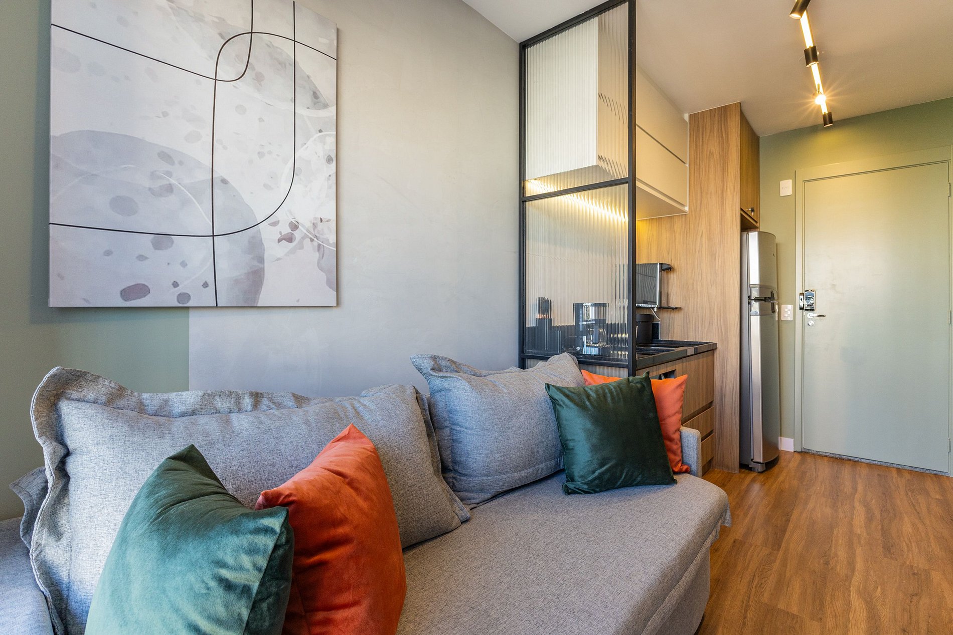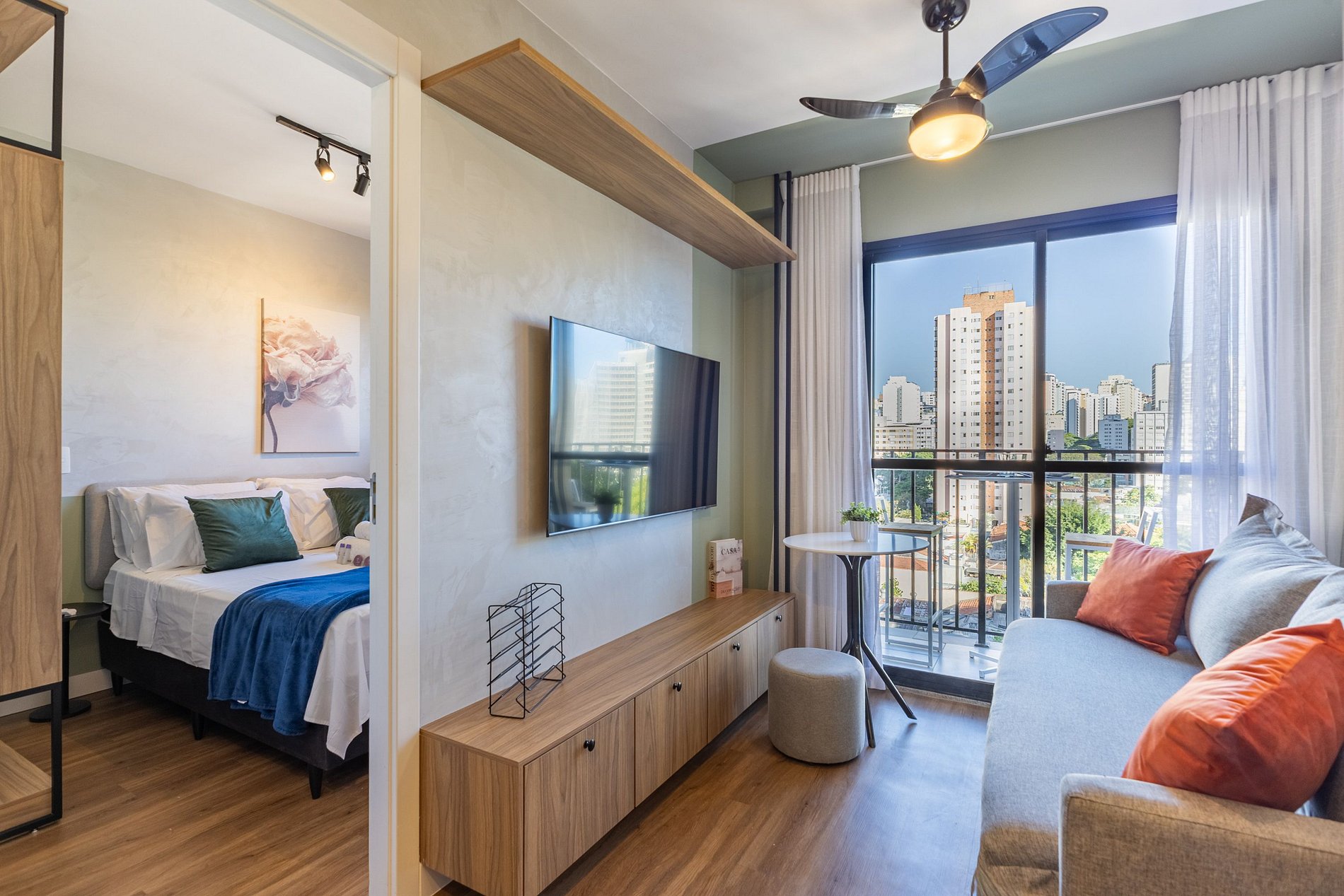 Studio moderno, iluminado e decorado com cuidado para oferecer uma estadia confortável e funcional. O espaço conta com uma cama aconchegante, sala integrada com Smart TV, varanda com vista aberta e cozinha equipada com itens essenciais para o dia a dia. O banheiro é amplo e possui chuveiro de alta pressão.