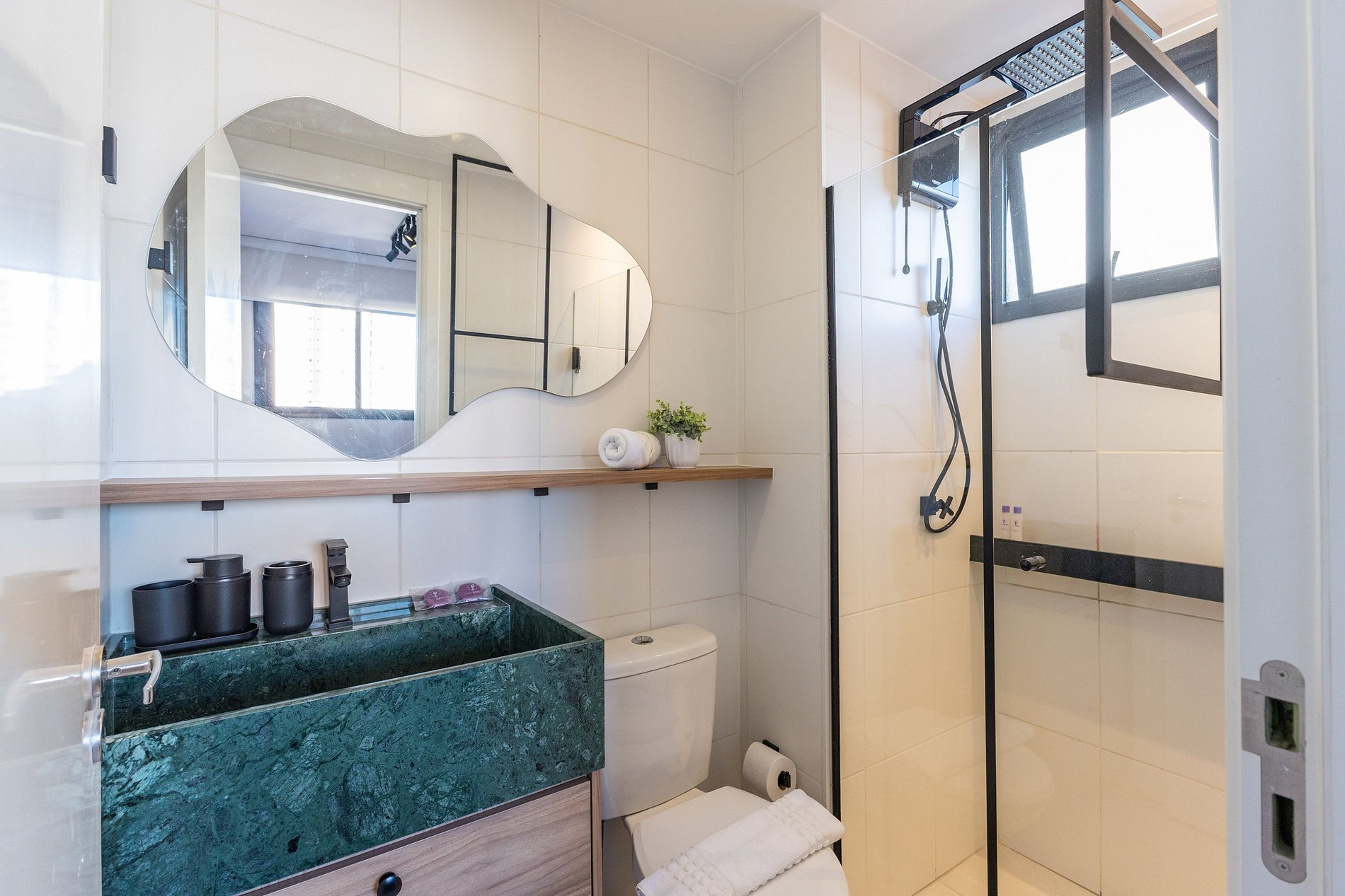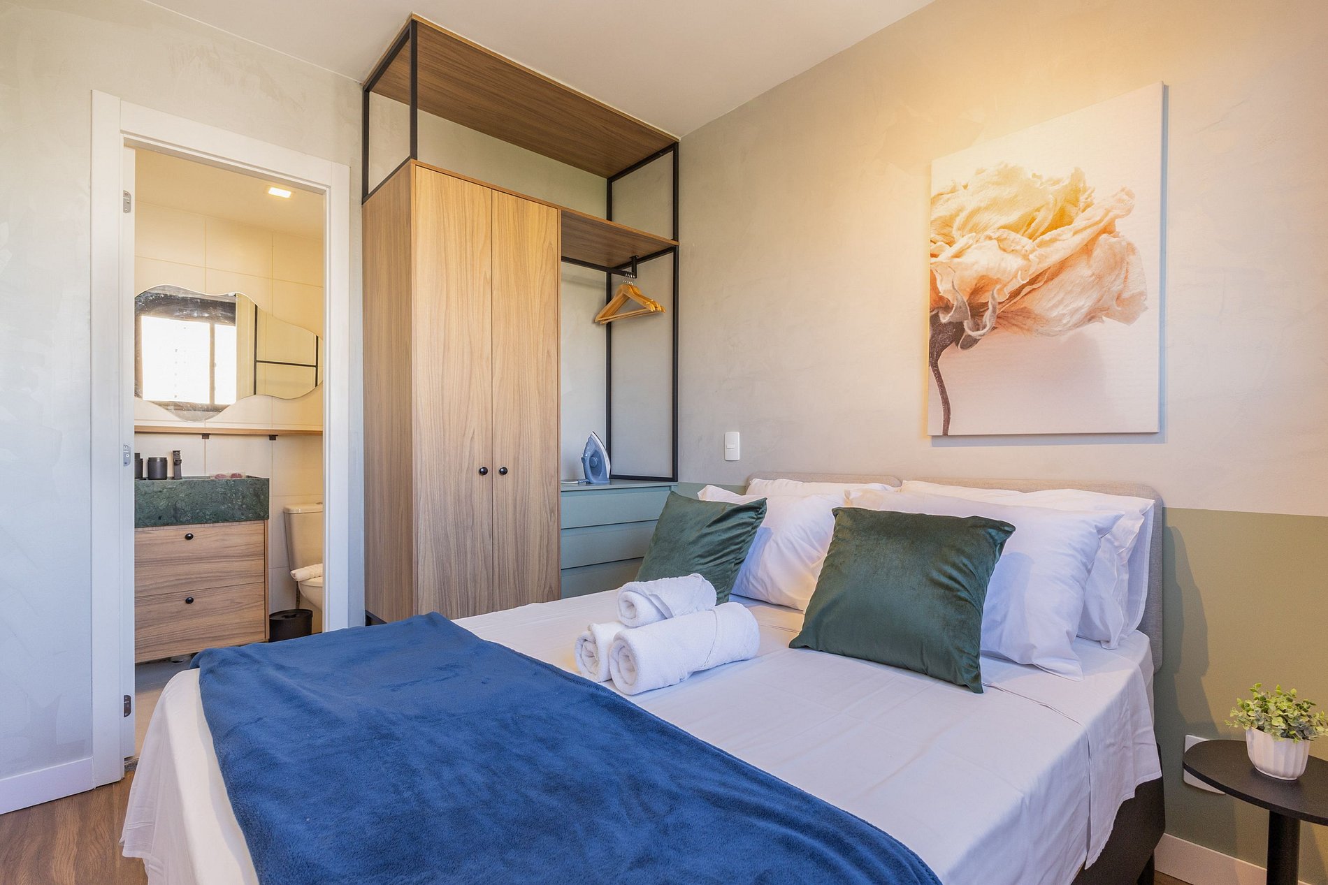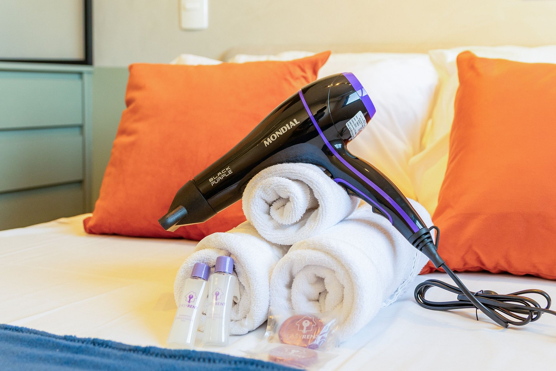 Fornecemos enxoval inicial de cama e banho, sem trocas ou reposições durante a estadia.