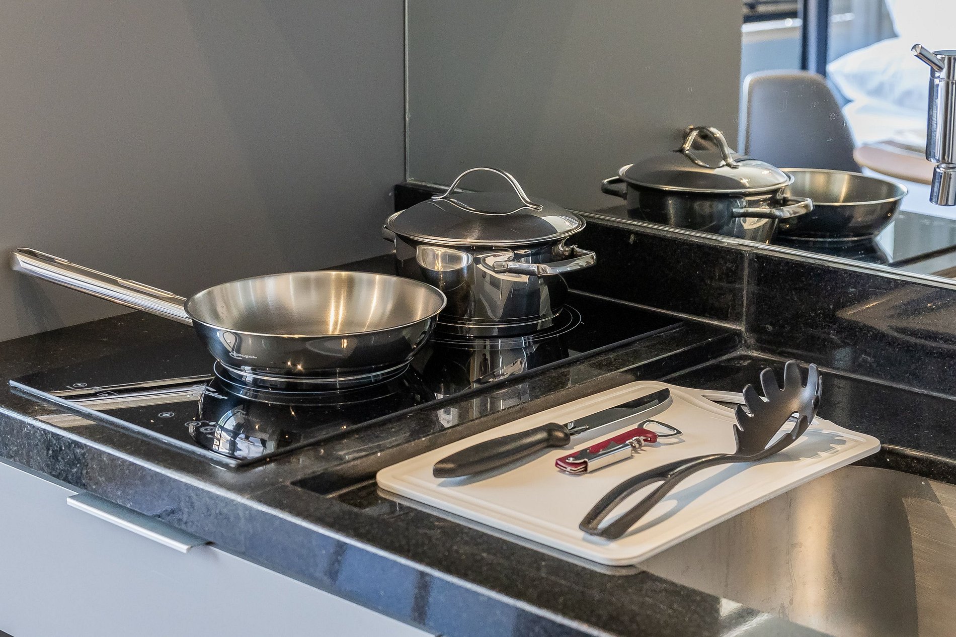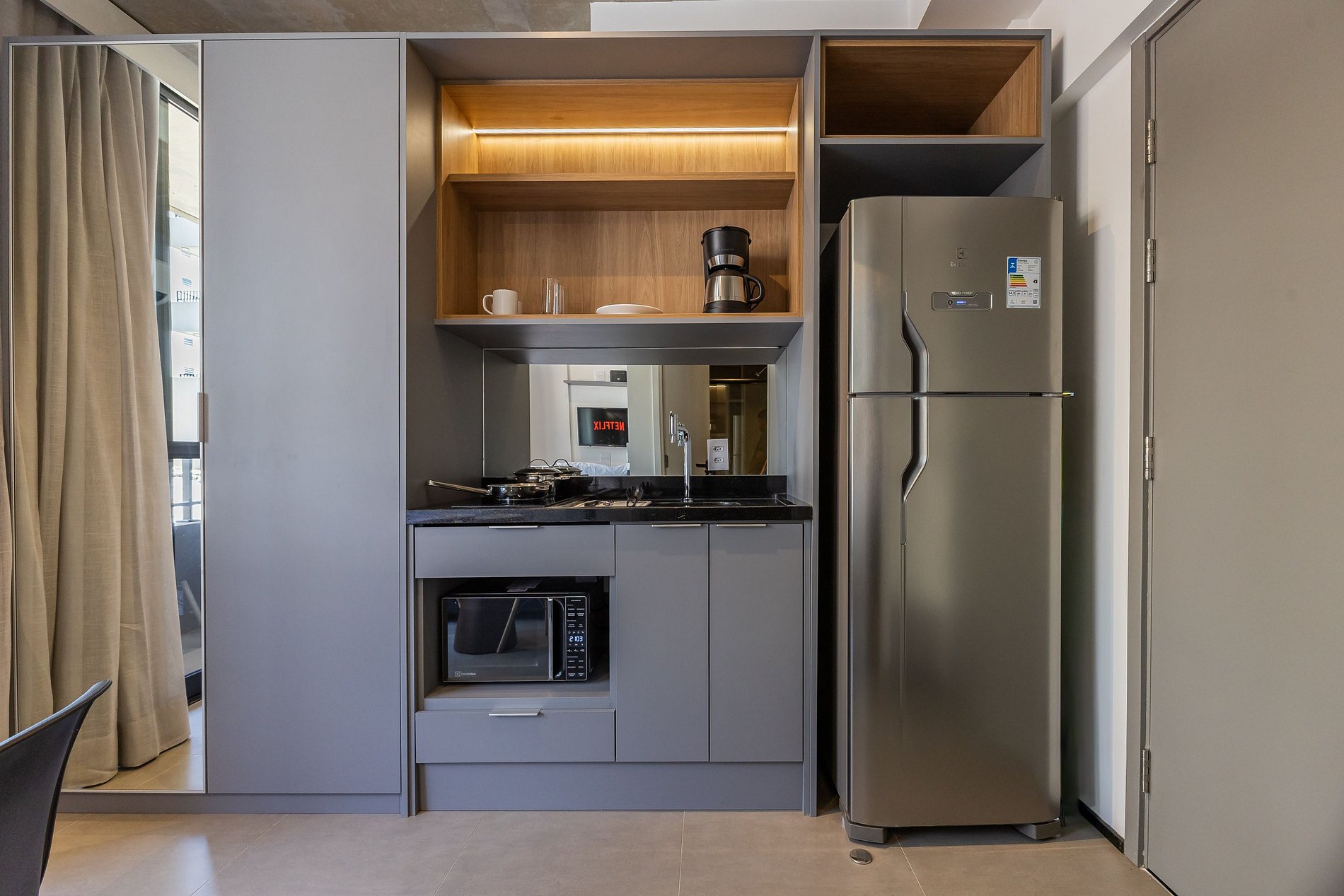 A cozinha equipada com itens básicos permite o preparo de pequenas refeições, garantindo mais autonomia no dia a dia.