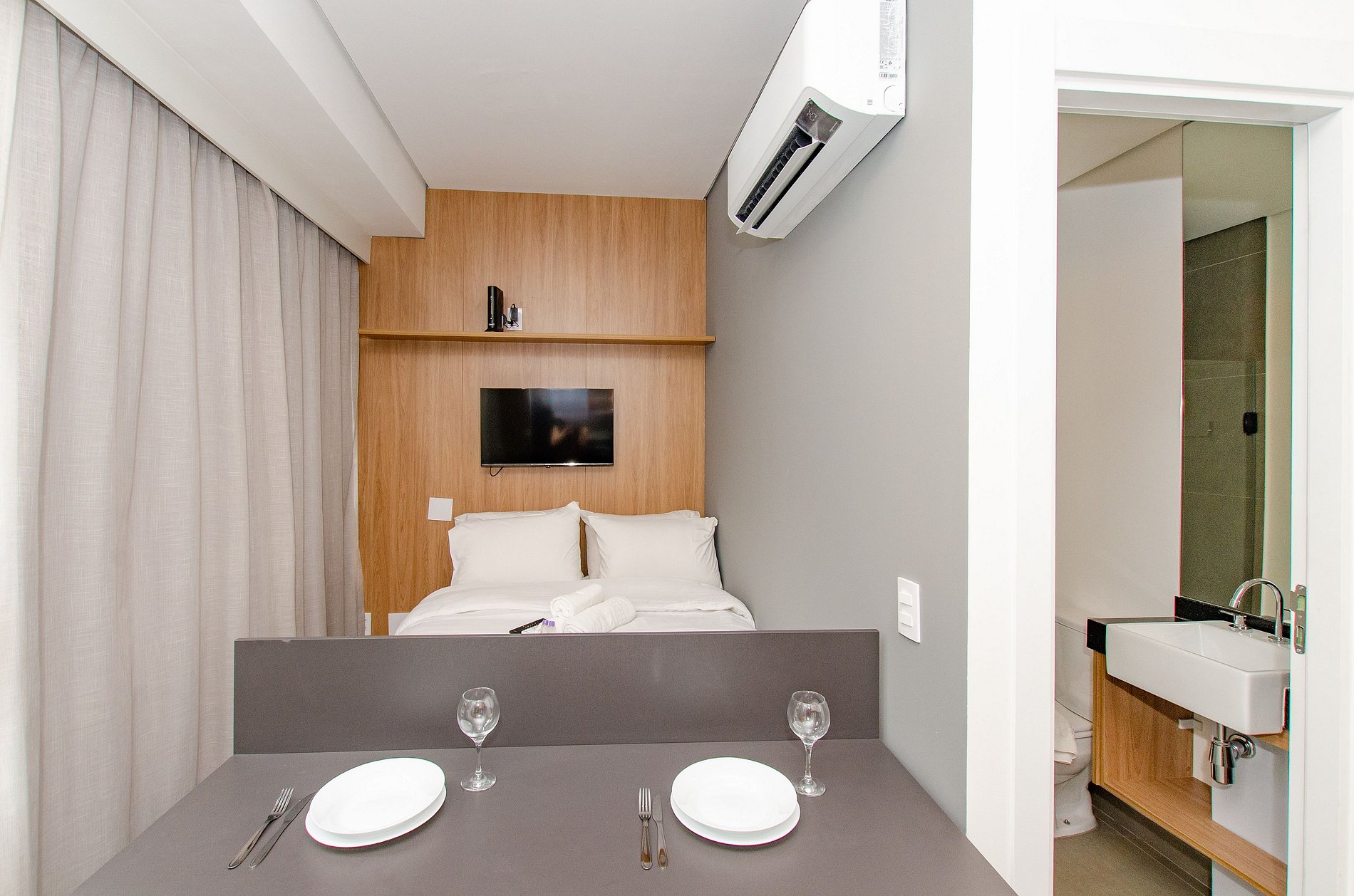 O apartamento também dispõe de ar-condicionado (somente refrigeração) e de uma varanda charmosa, que deixa o ambiente mais agradável com a entrada de luz natural.