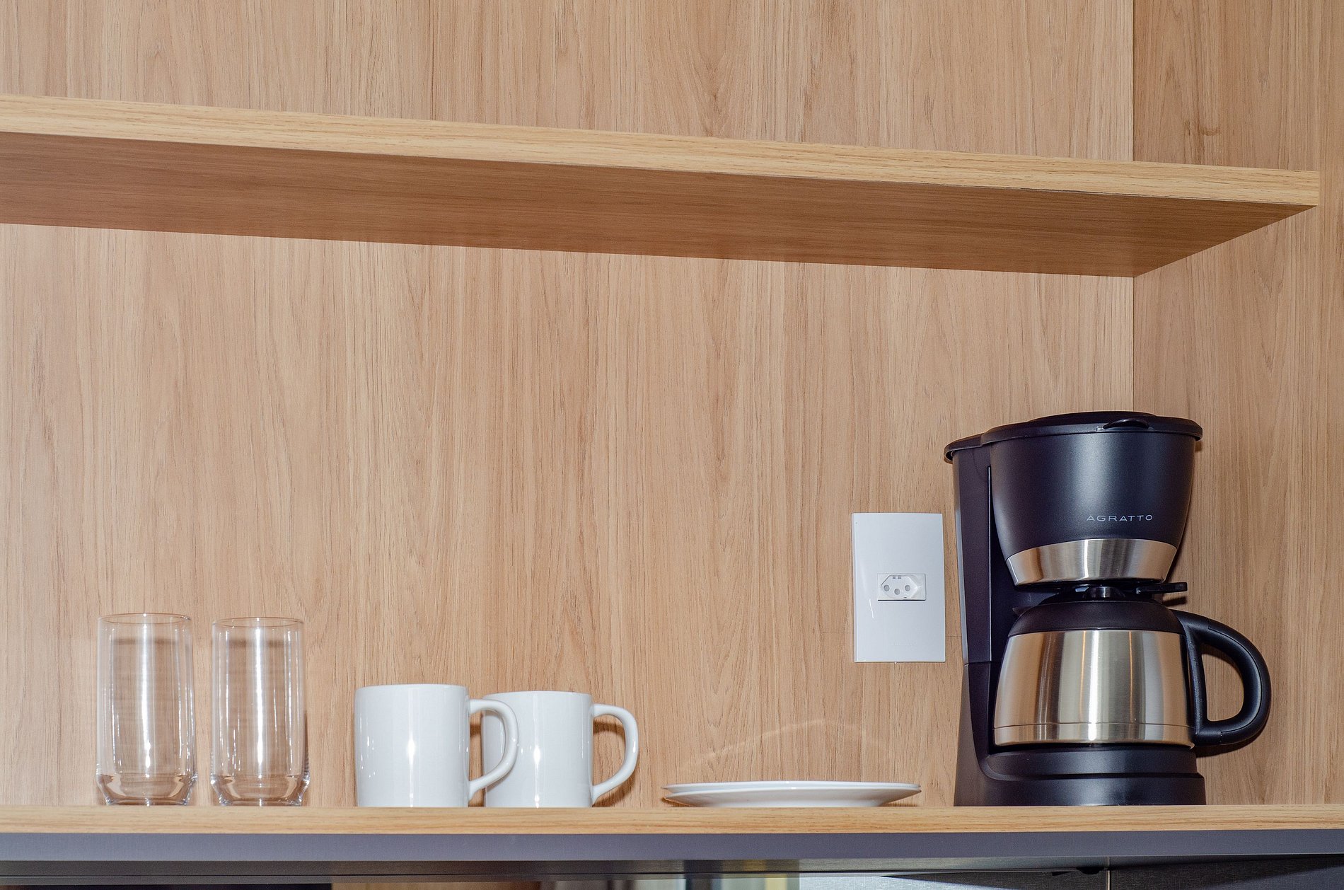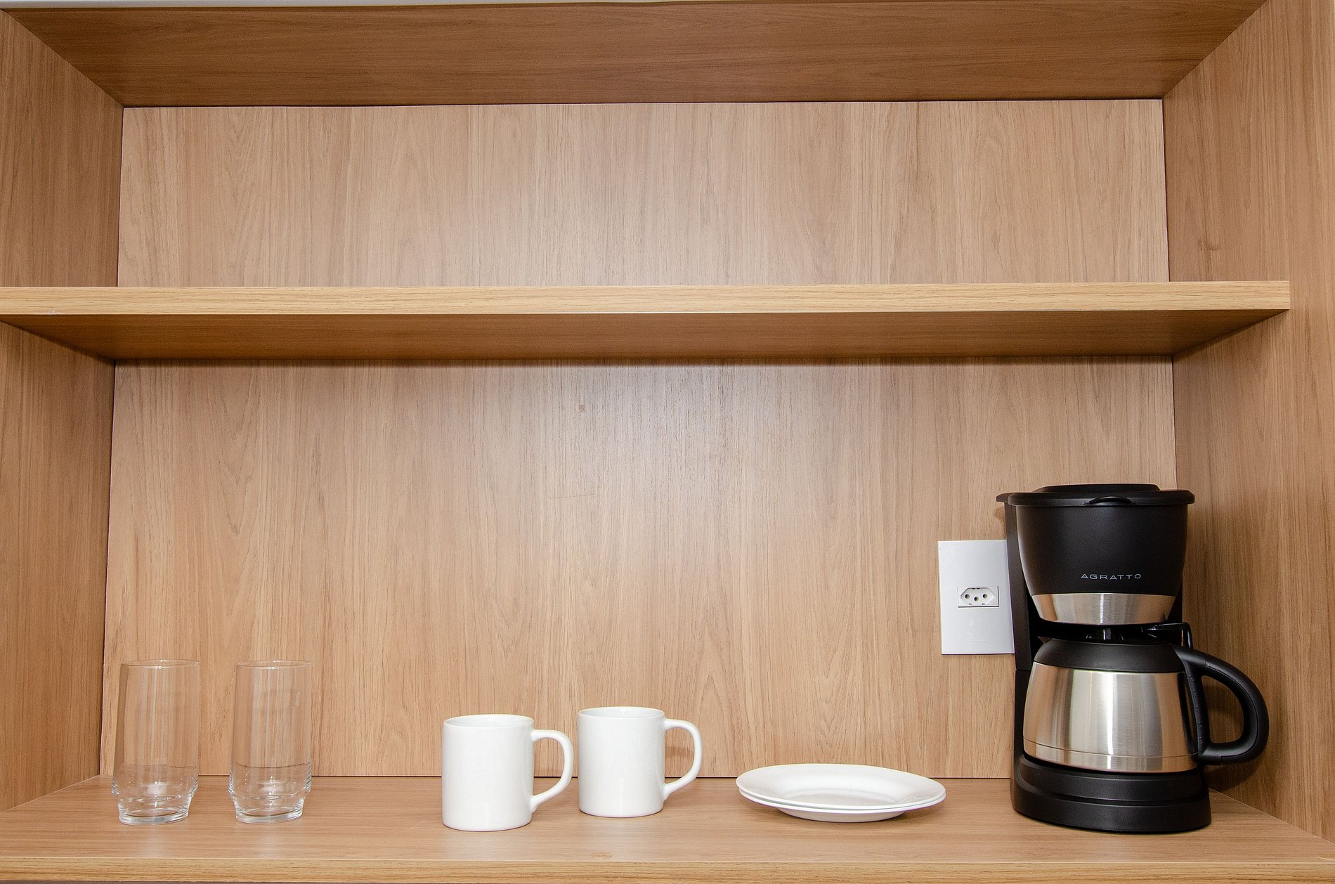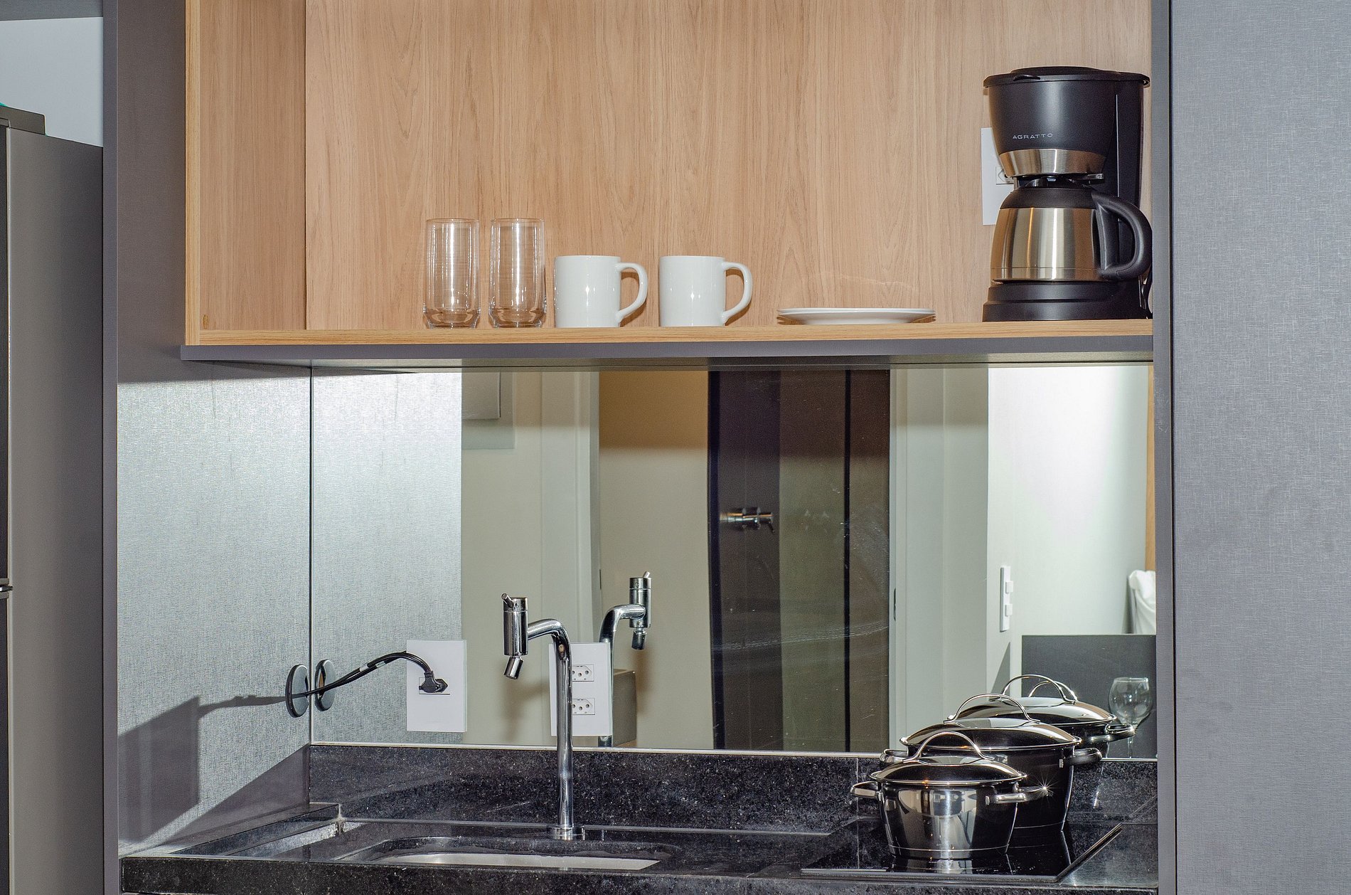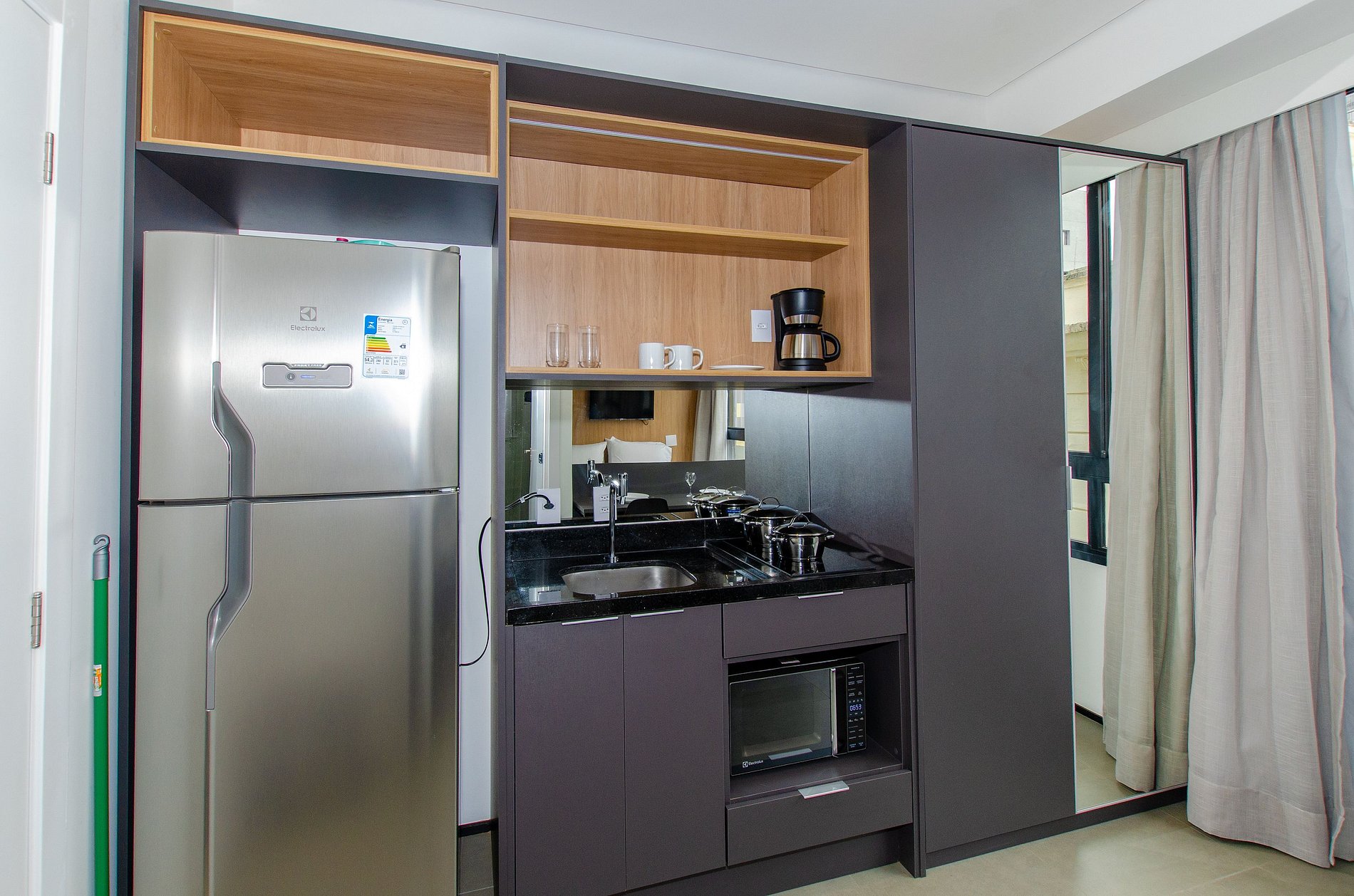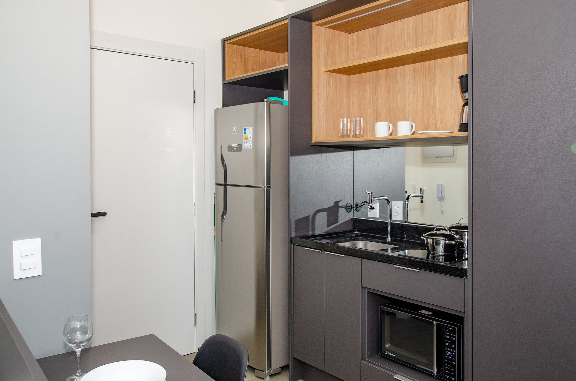 A cozinha equipada com itens básicos permite o preparo de pequenas refeições, garantindo mais autonomia no dia a dia.