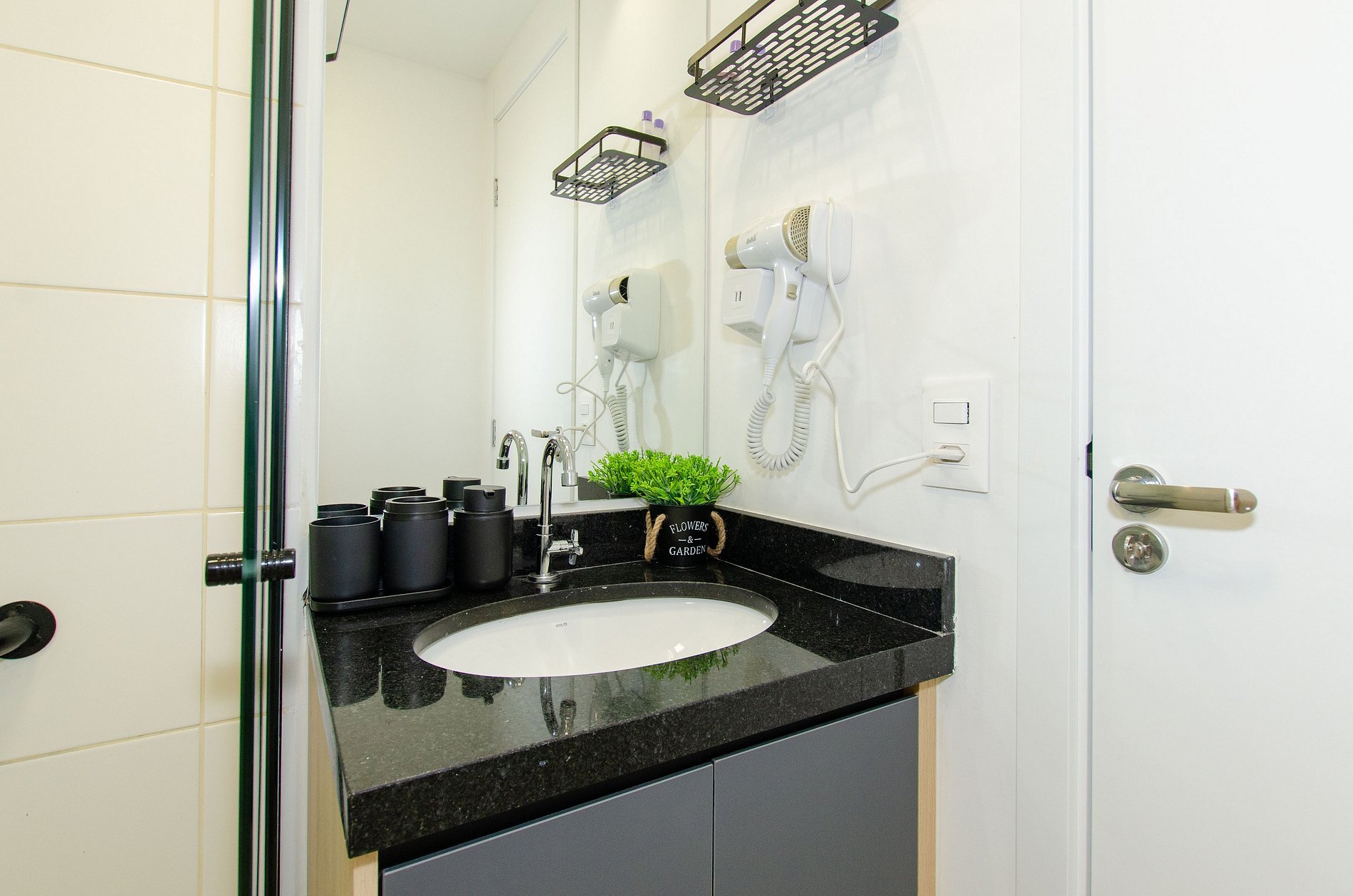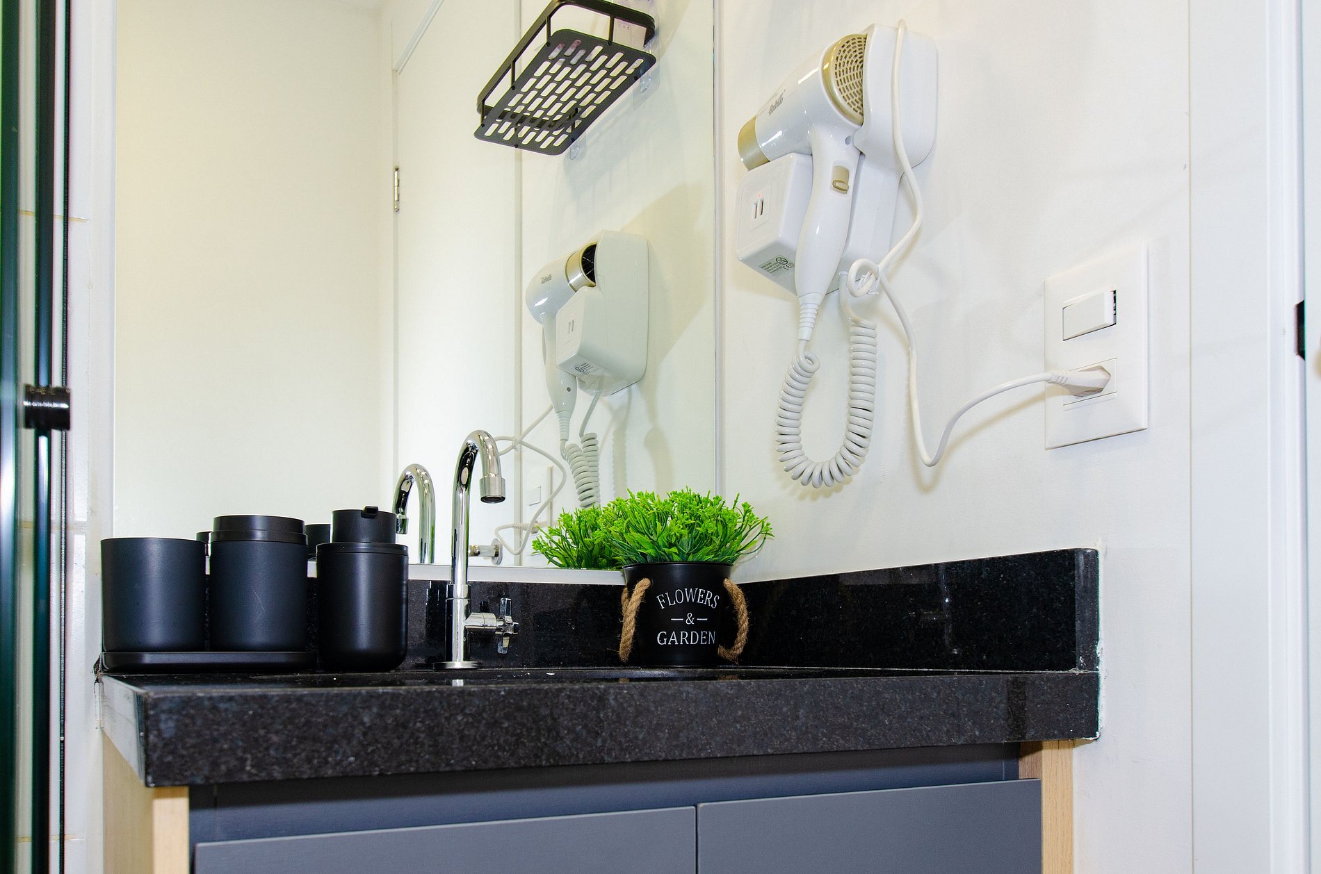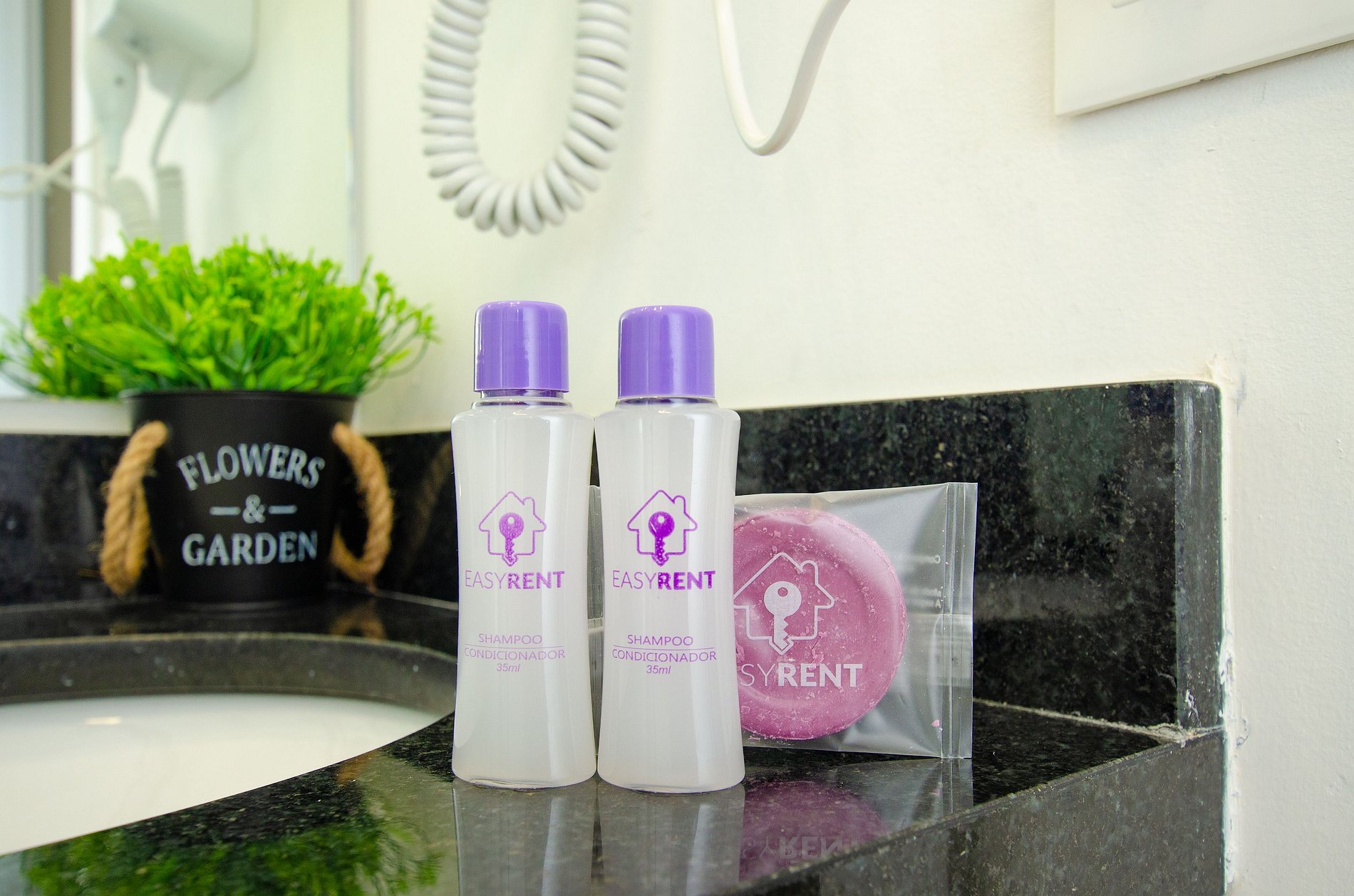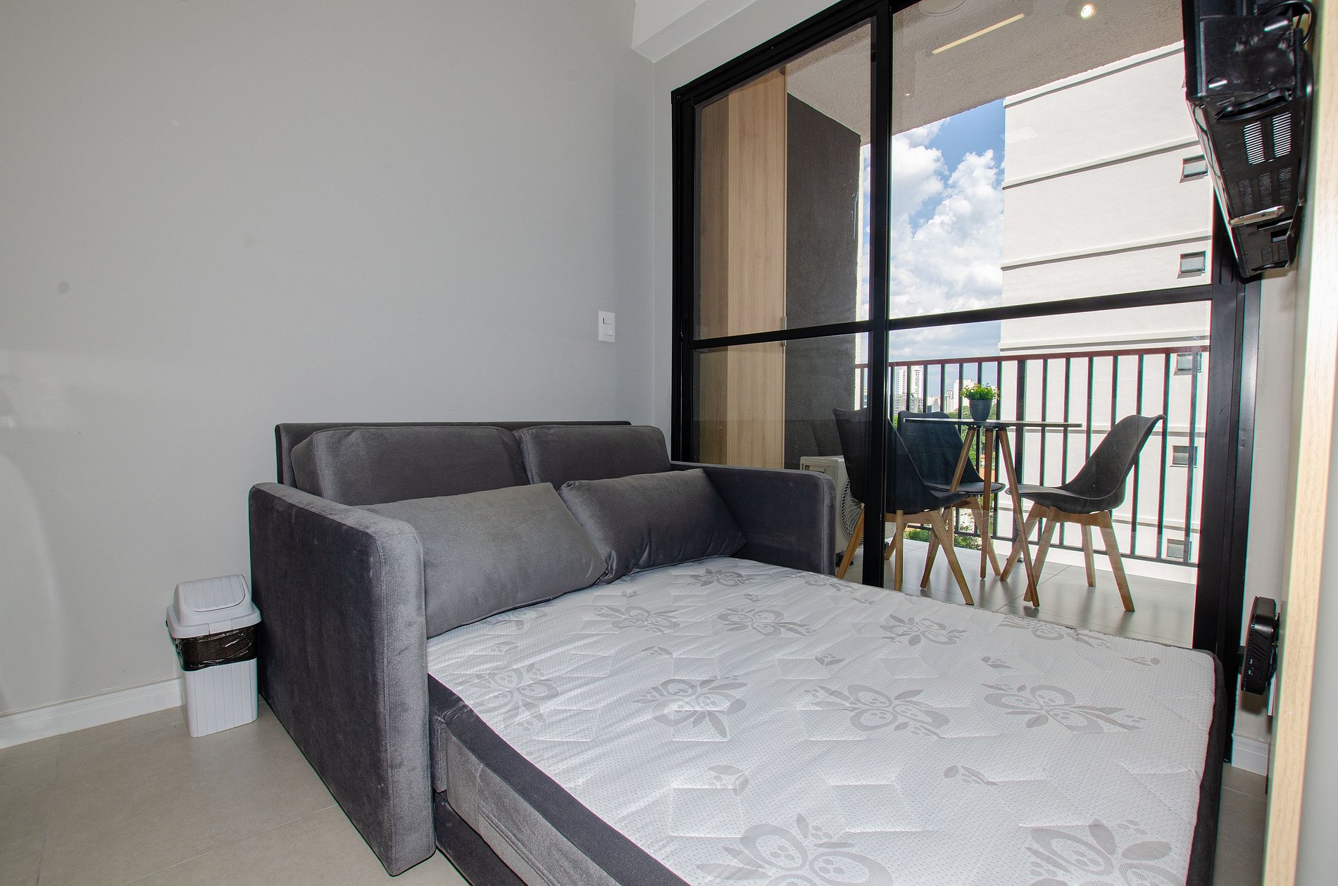 Para maior comodidade, o apartamento também dispõe de ferro de passar roupas e secador de cabelo, além de uma varanda charmosa, que proporciona boa iluminação natural e torna o ambiente ainda mais agradável.