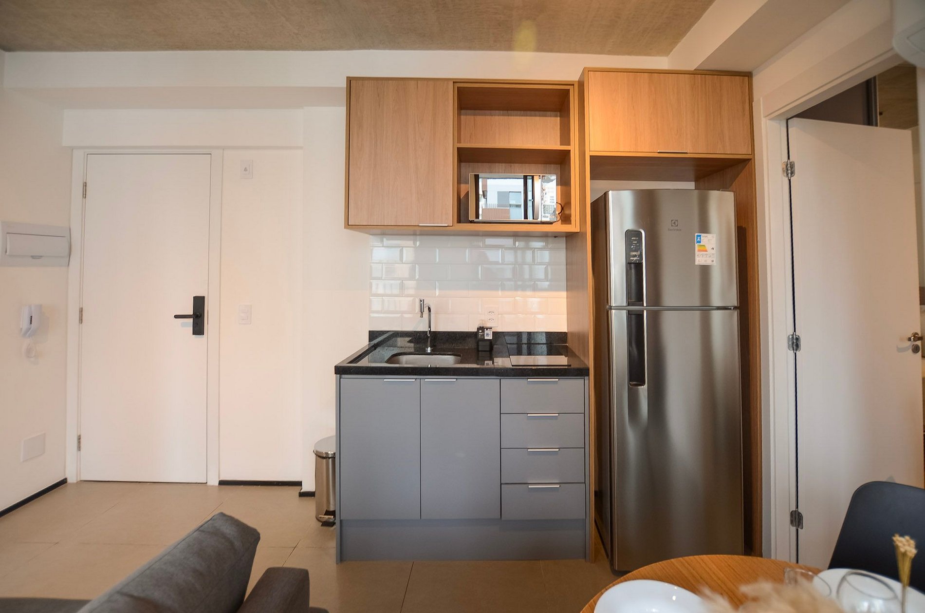 A cozinha equipada com itens básicos permite o preparo de pequenas refeições, garantindo mais autonomia no dia a dia.