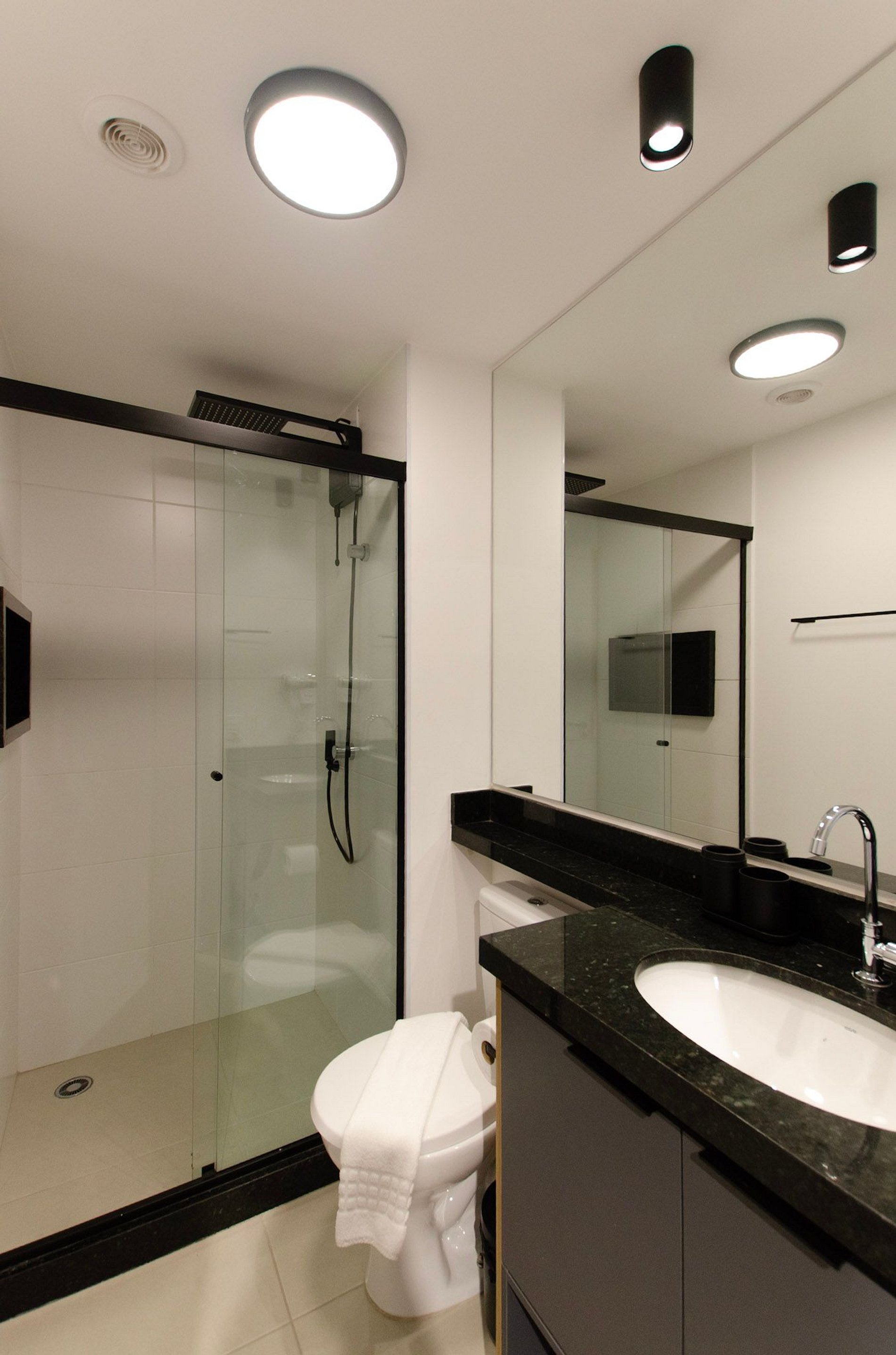 Por fim, o banheiro com secador de cabelo traz ainda mais praticidade para a sua rotina.