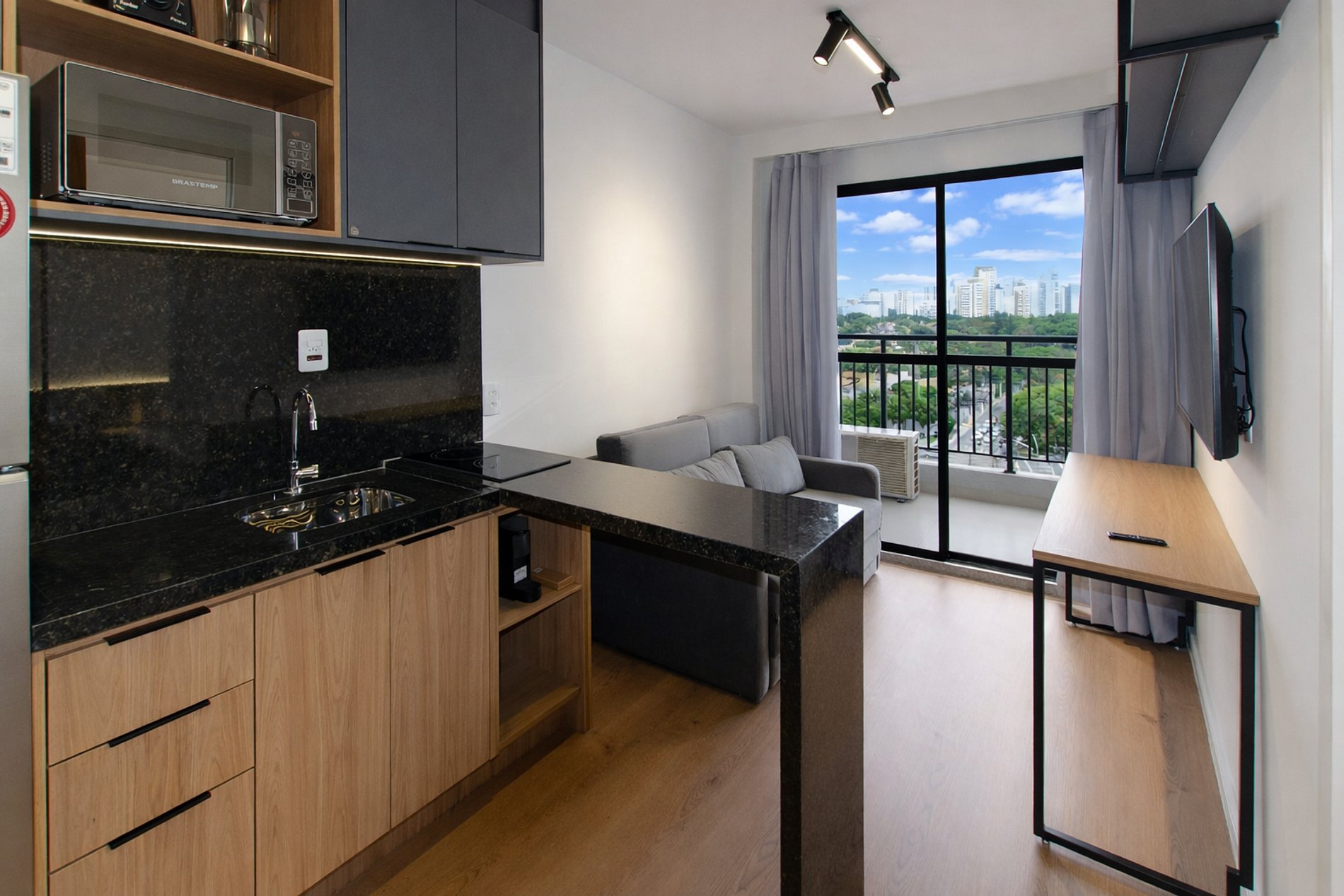 O apartamento também dispõe de ar-condicionado (somente refrigeração) e de uma varanda charmosa, que deixa o ambiente mais agradável com a entrada de luz natural.