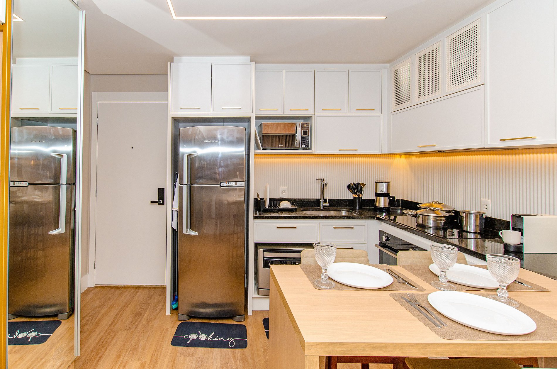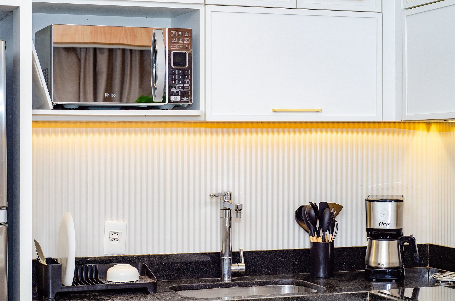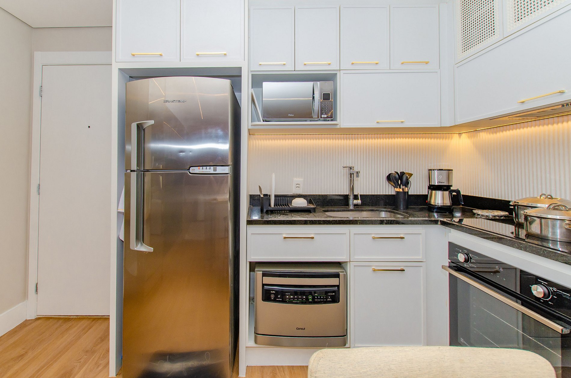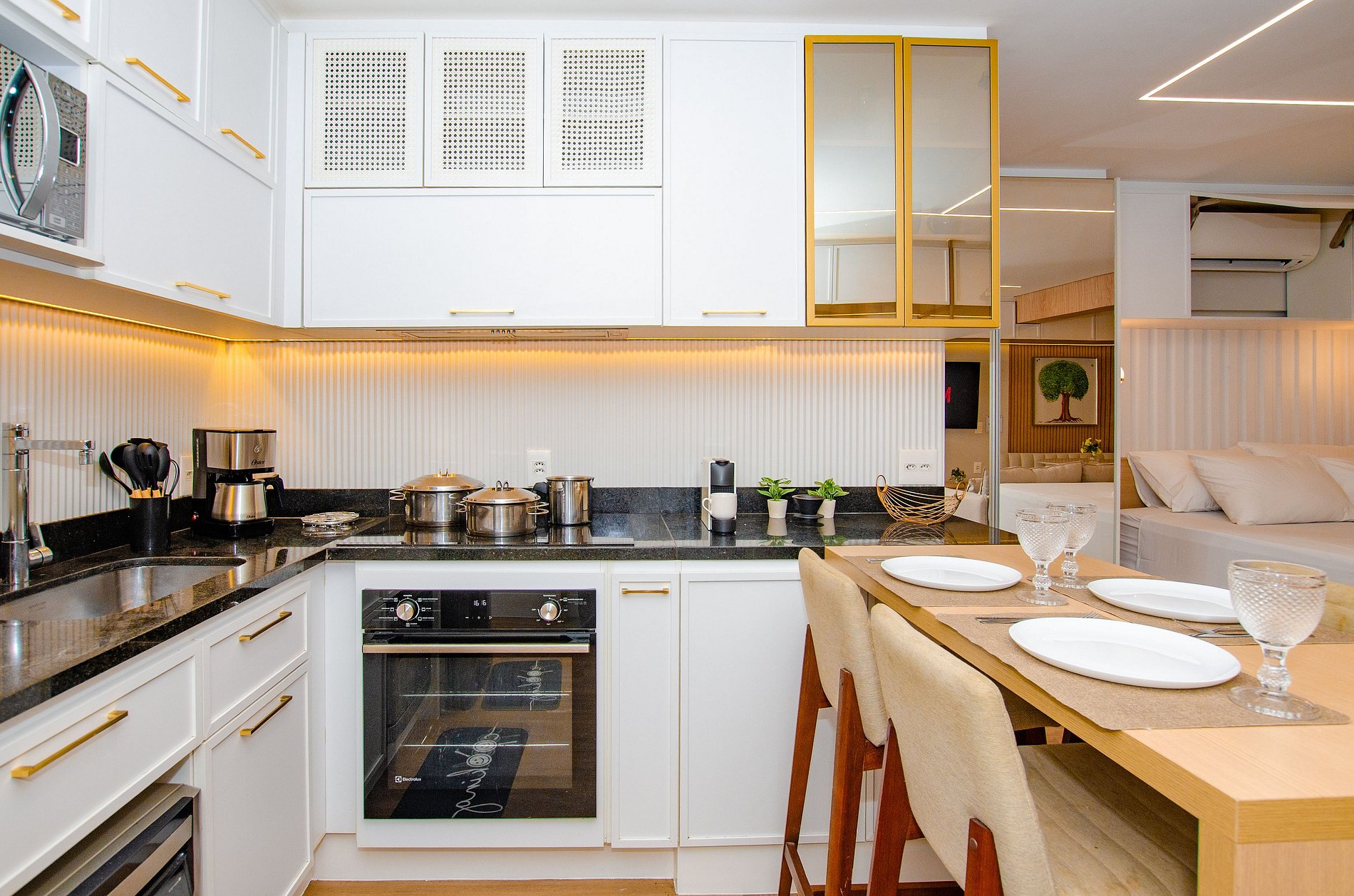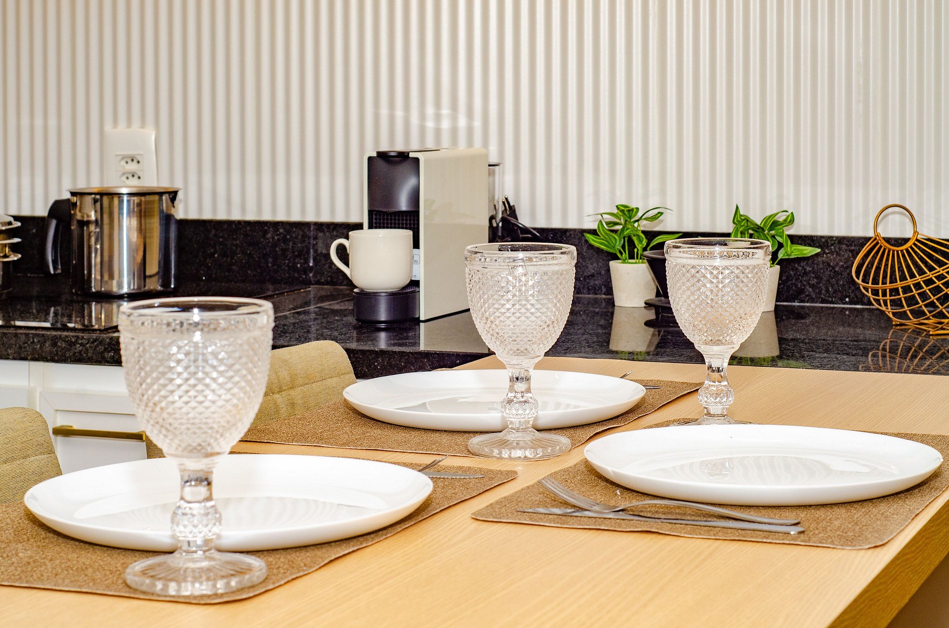 A cozinha equipada com forno, lava louças, cafeteira Nespresso, cafeteira elétrica itens básicos permite o preparo de refeições, garantindo mais autonomia no dia a dia.