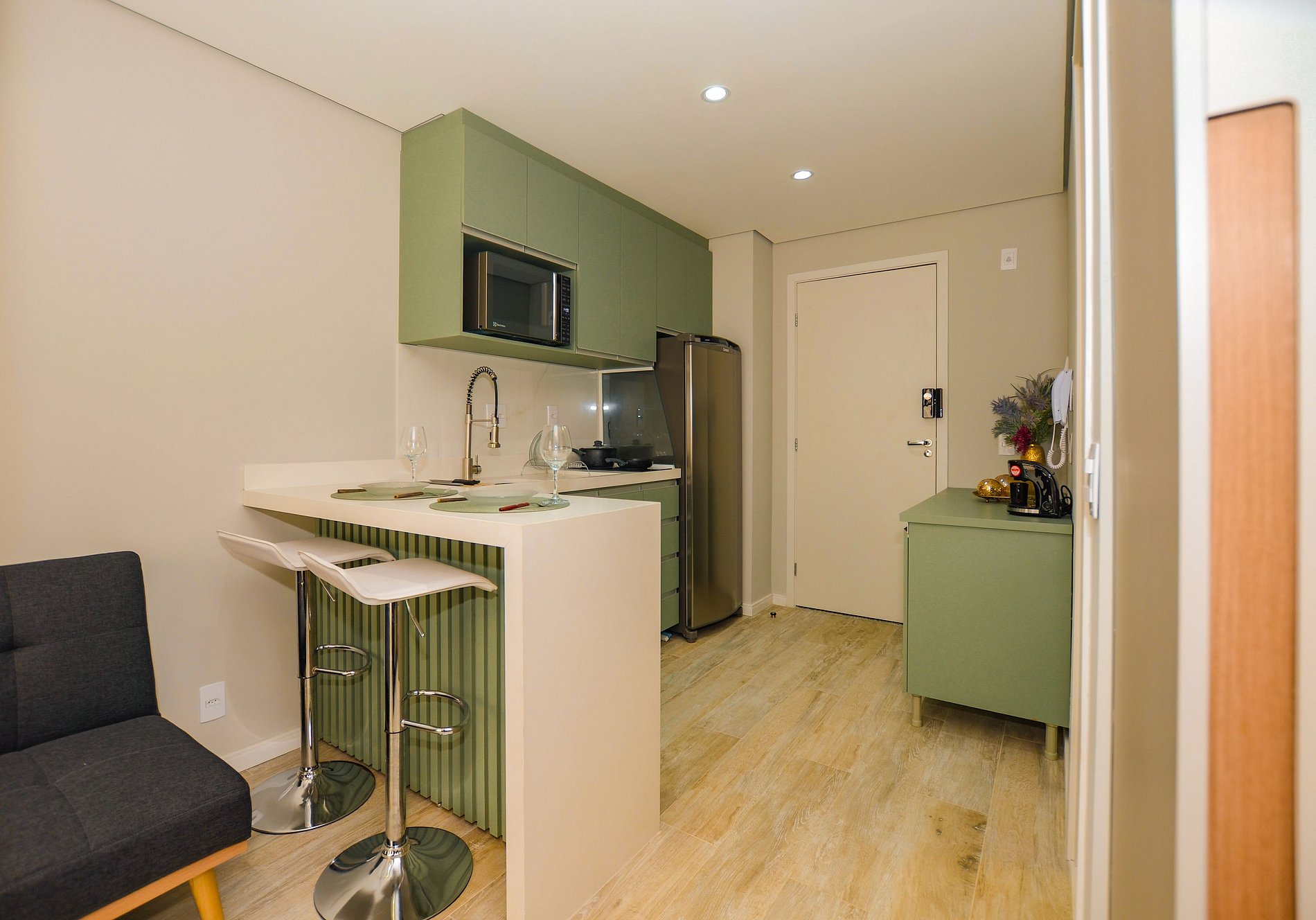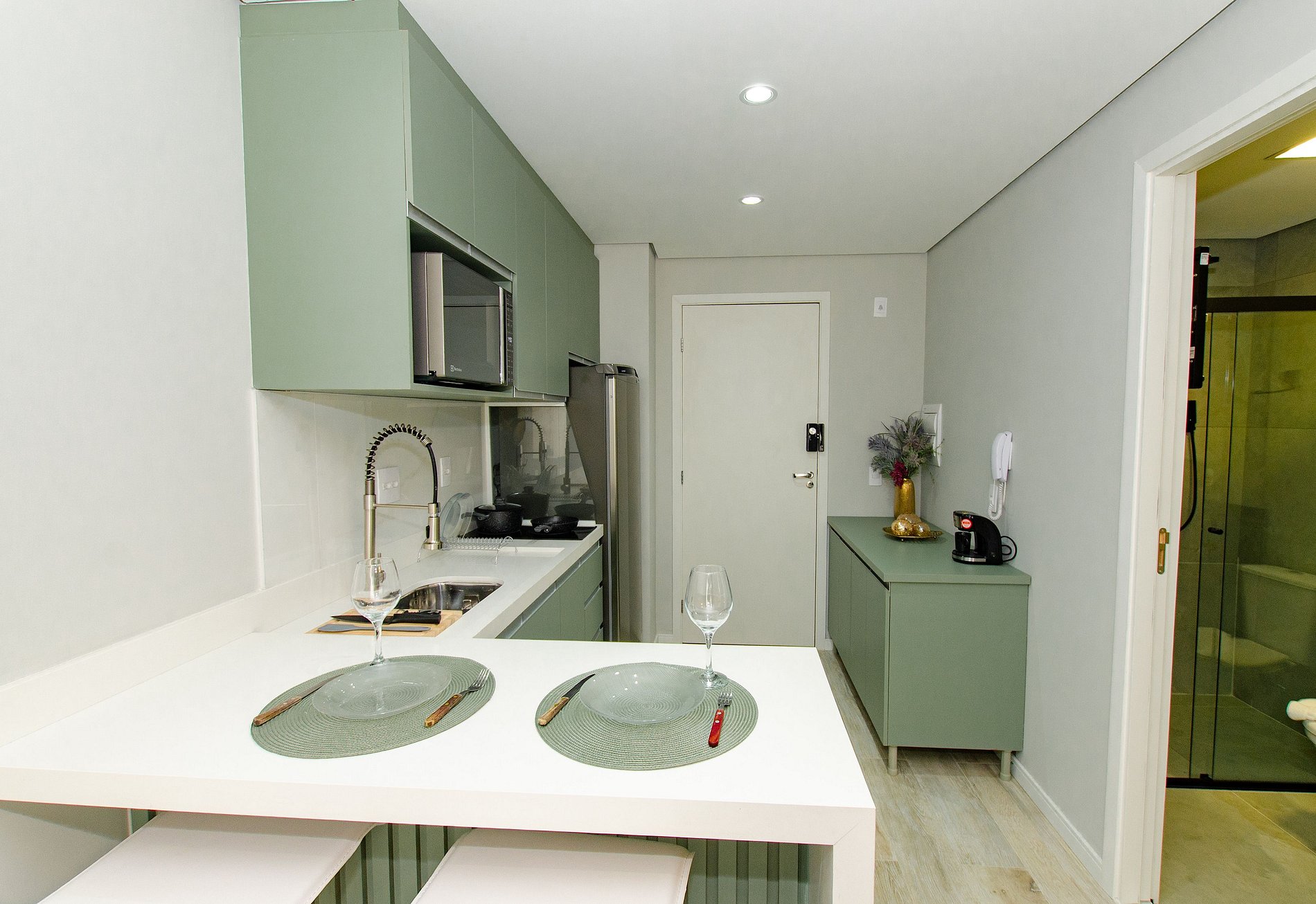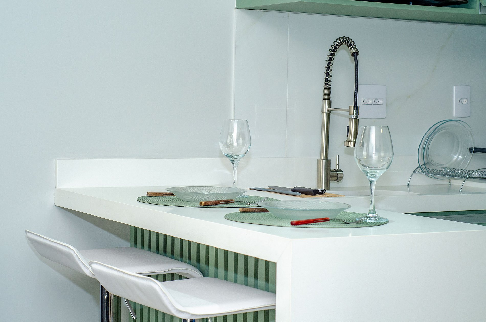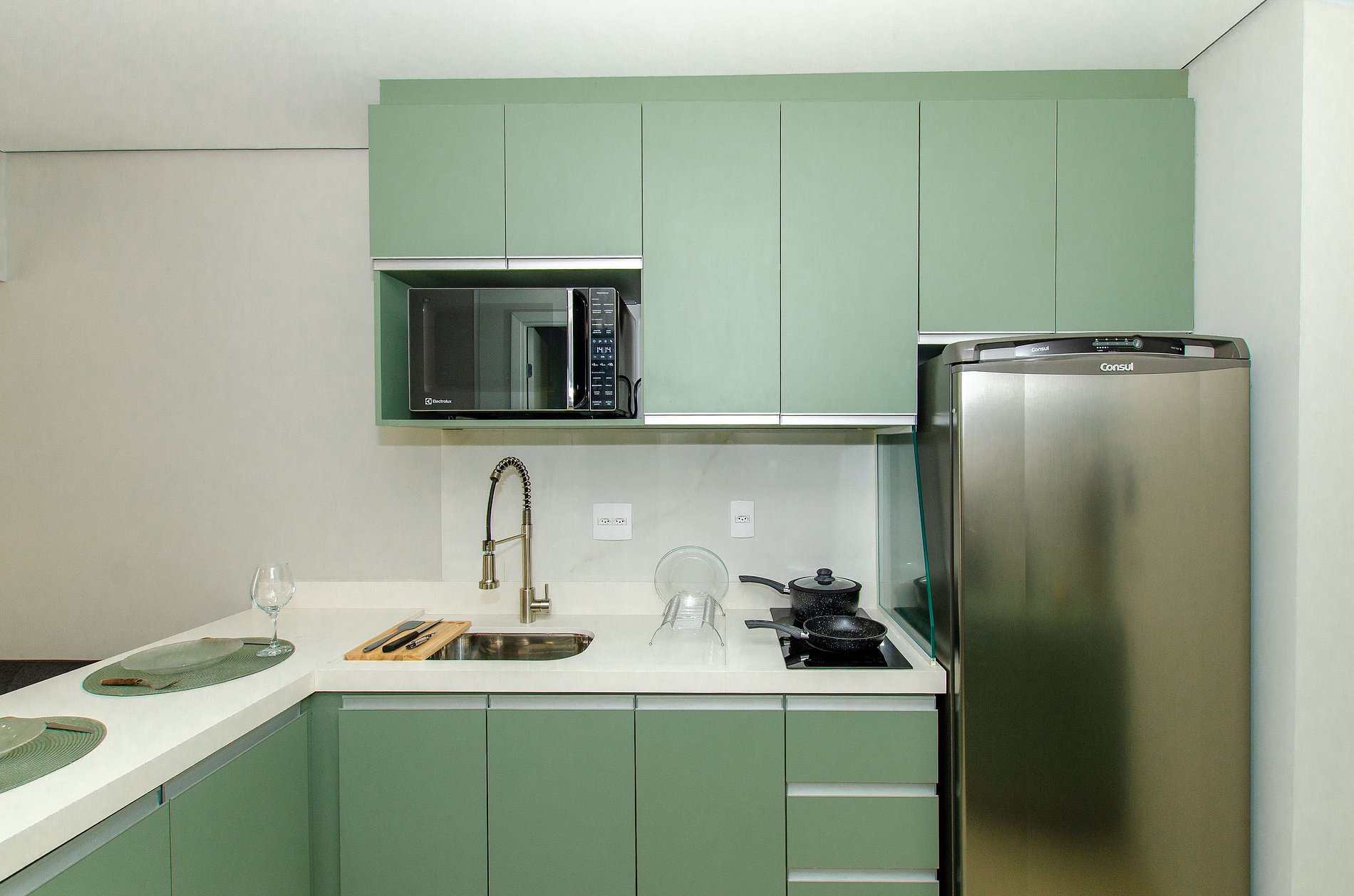 A cozinha equipada com itens básicos permite o preparo de pequenas refeições, garantindo mais autonomia no dia a dia.