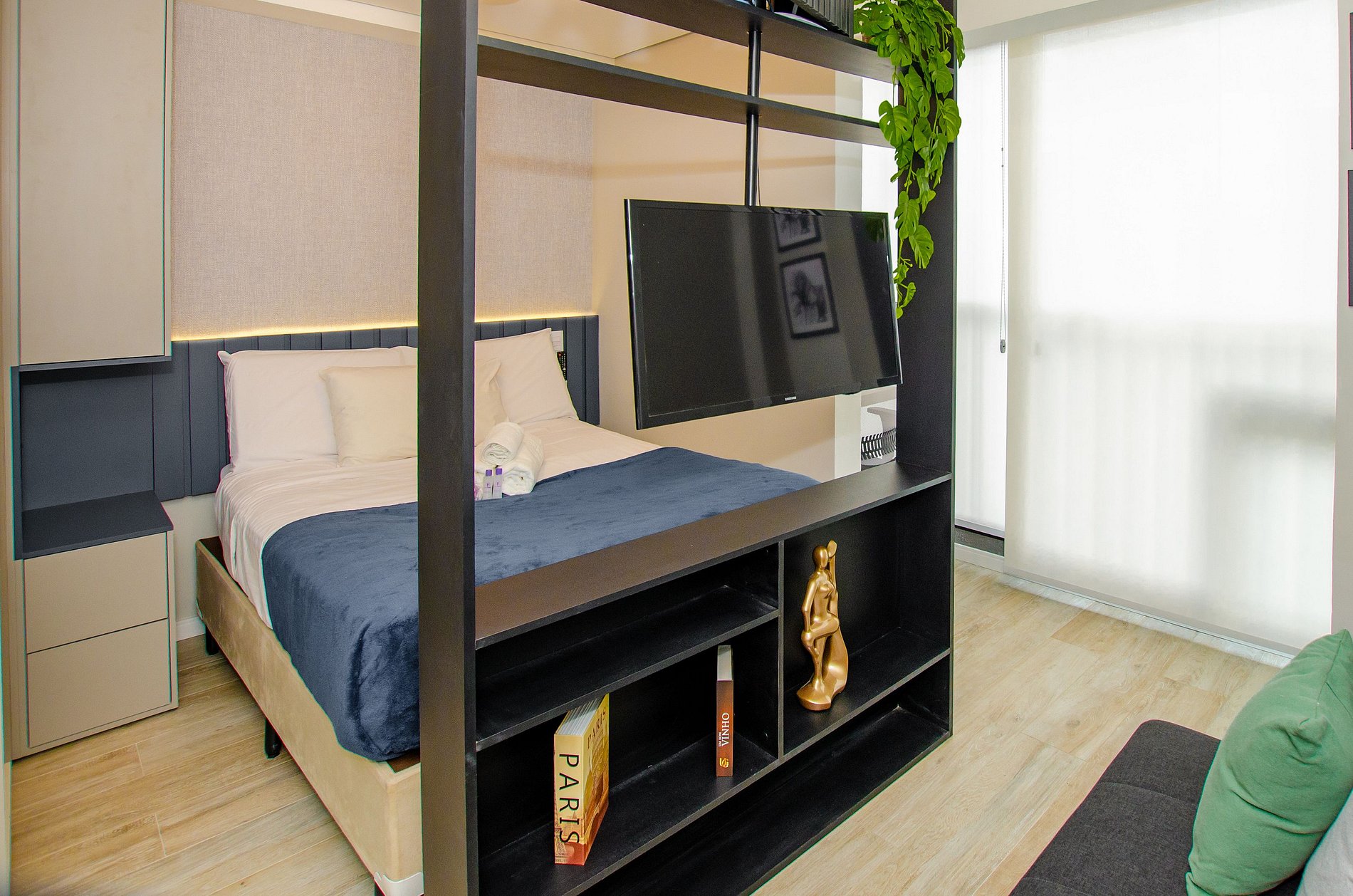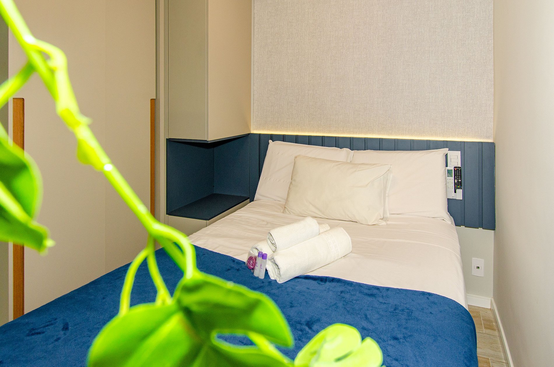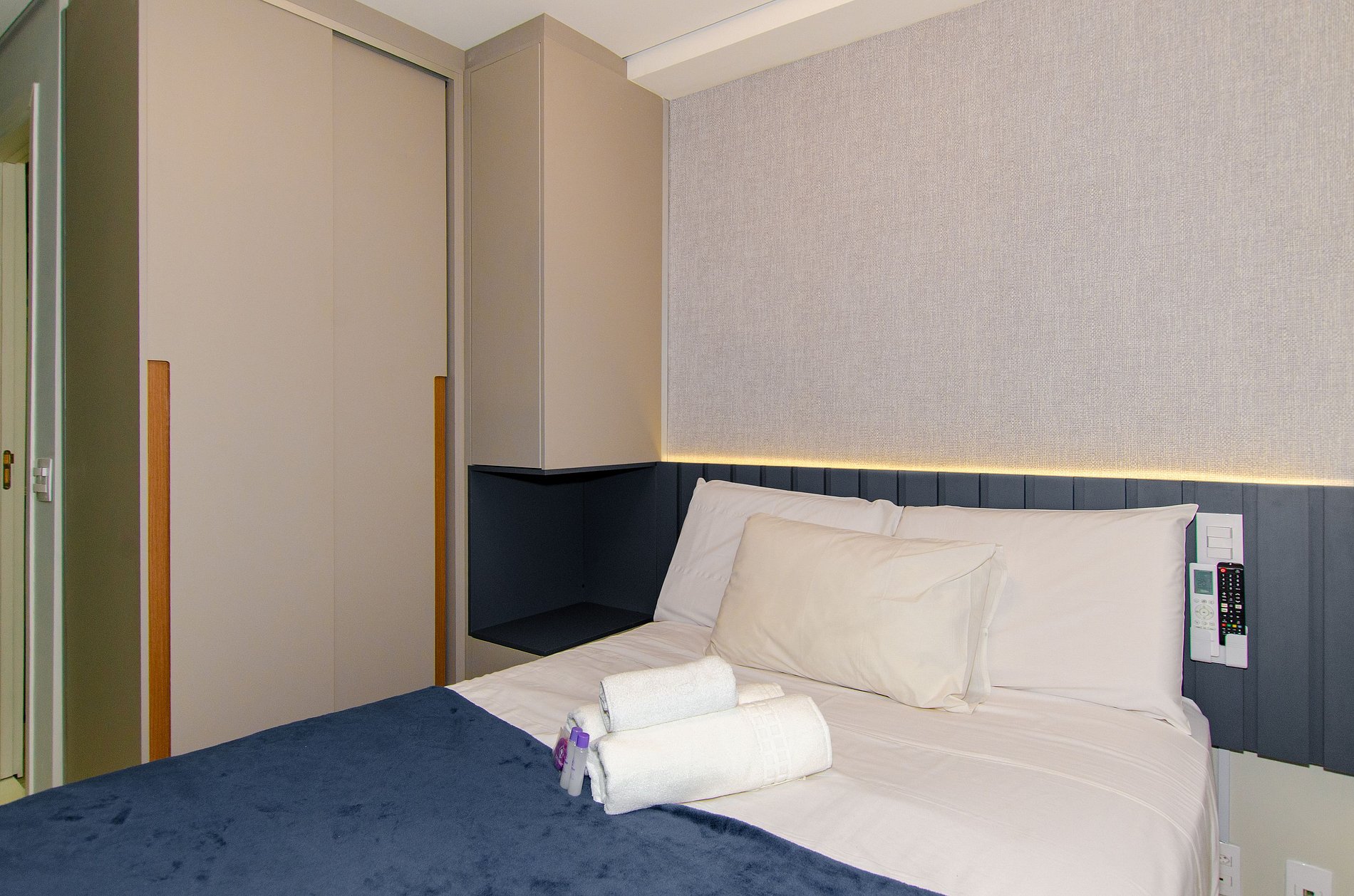 Acomodando até 3 hóspedes, o espaço oferece uma cama de casal padrão e um sofá-cama viúva na sala (ideal para hóspedes de até 1,75m), além de um enxoval de cama e banho fornecido no início da estadia, sem trocas ou reposições.