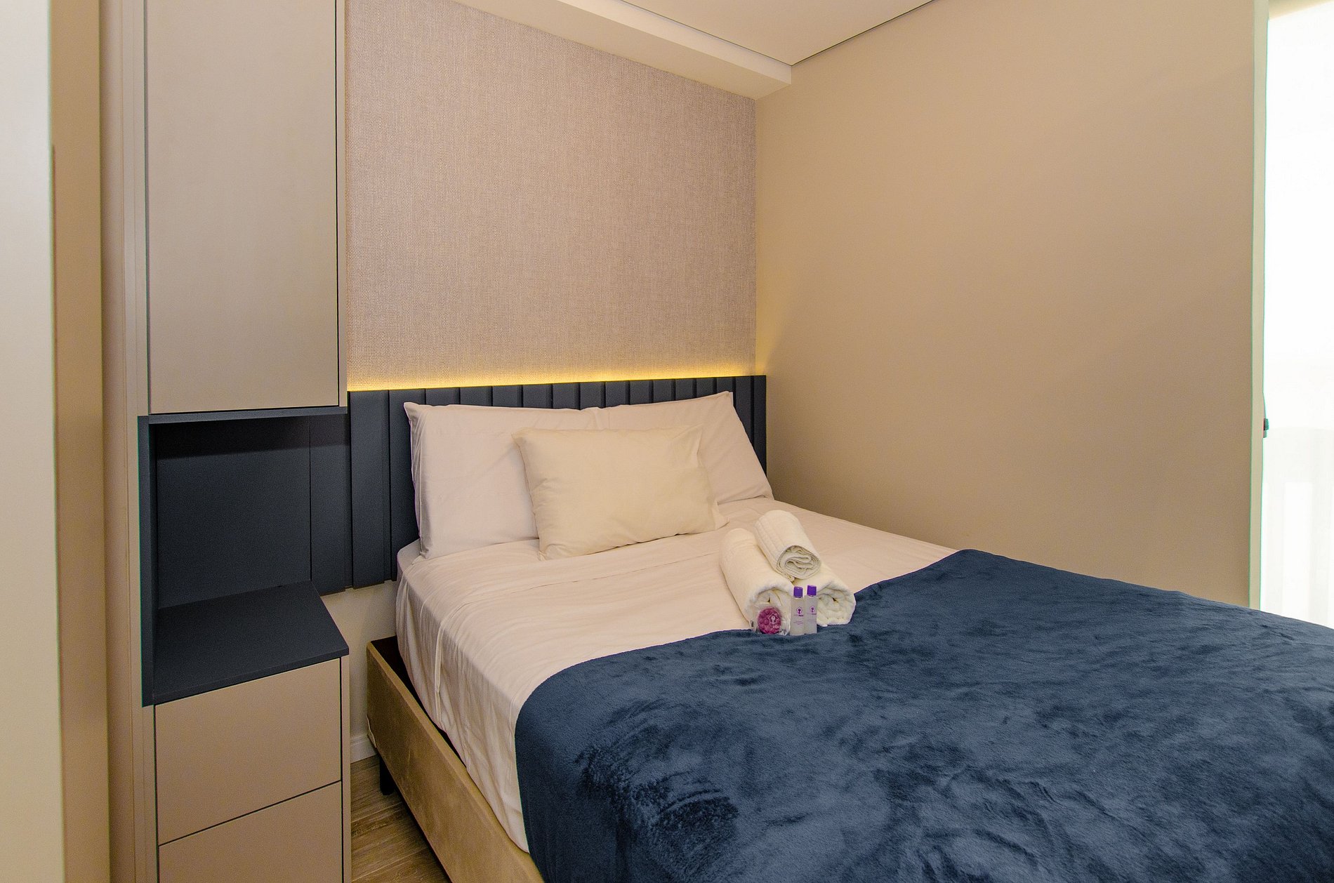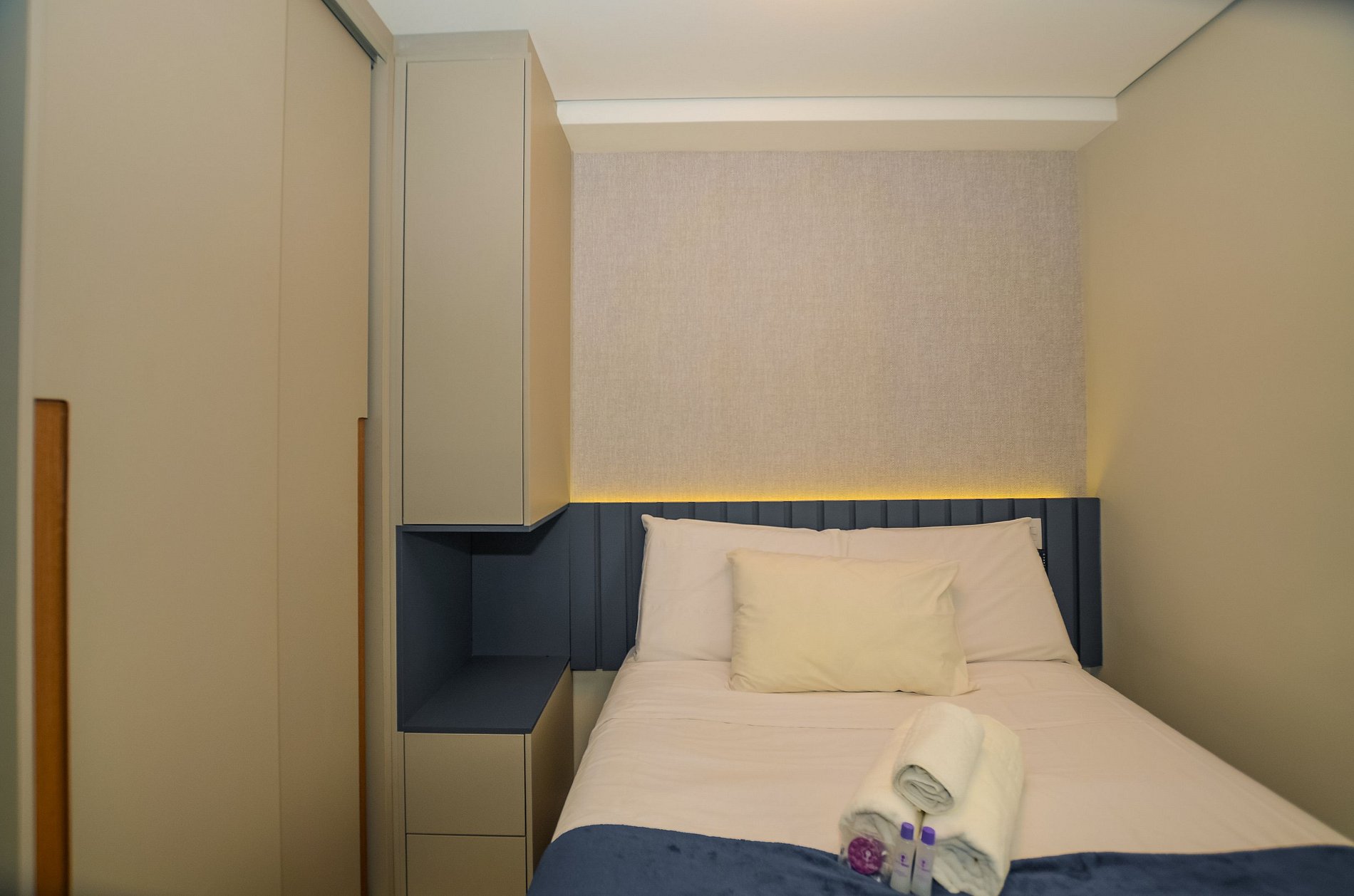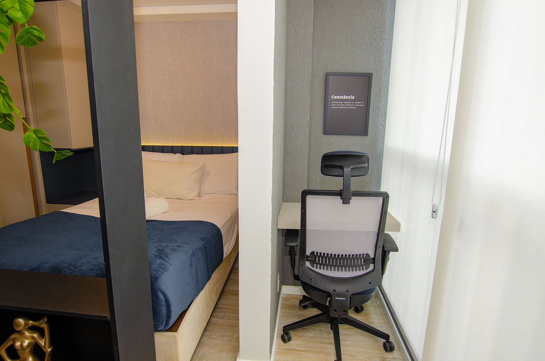 Acomodando até 3 hóspedes, o espaço oferece uma cama de casal padrão e um sofá-cama viúva na sala (ideal para hóspedes de até 1,75m), além de um enxoval de cama e banho fornecido no início da estadia, sem trocas ou reposições.