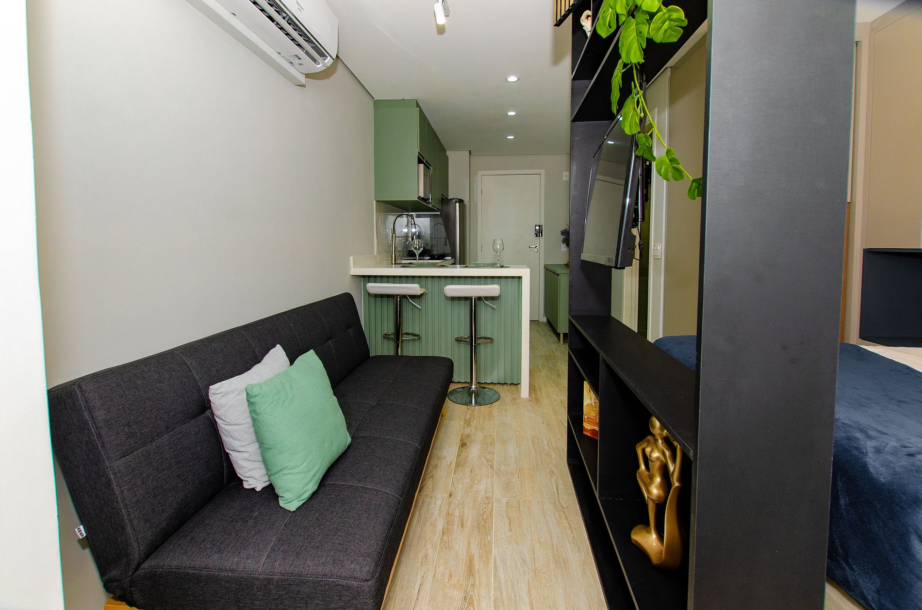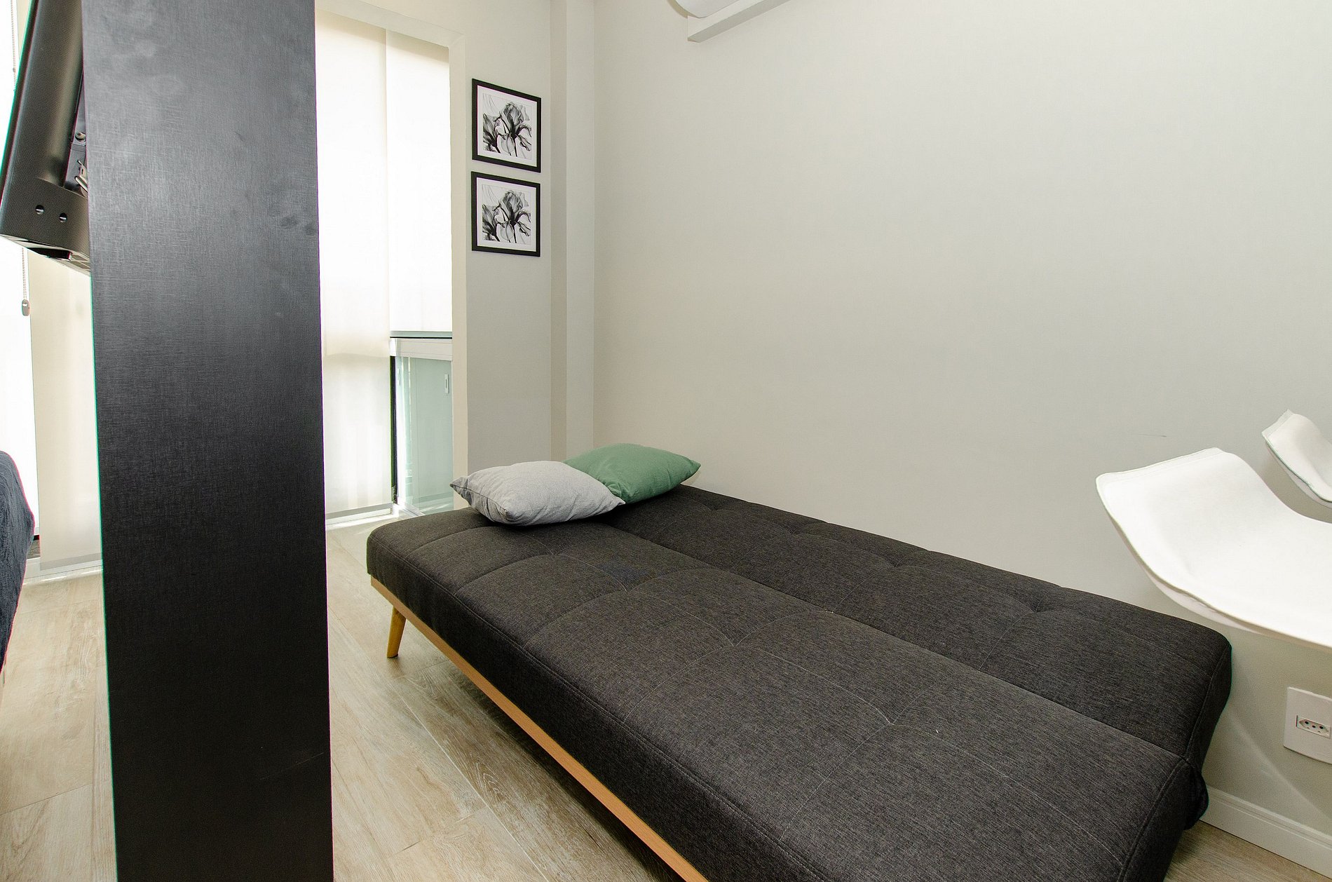 Acomoda até 3 hóspedes em uma cama de casal e um sofá-cama viúva na sala (ideal para até 1,75m).