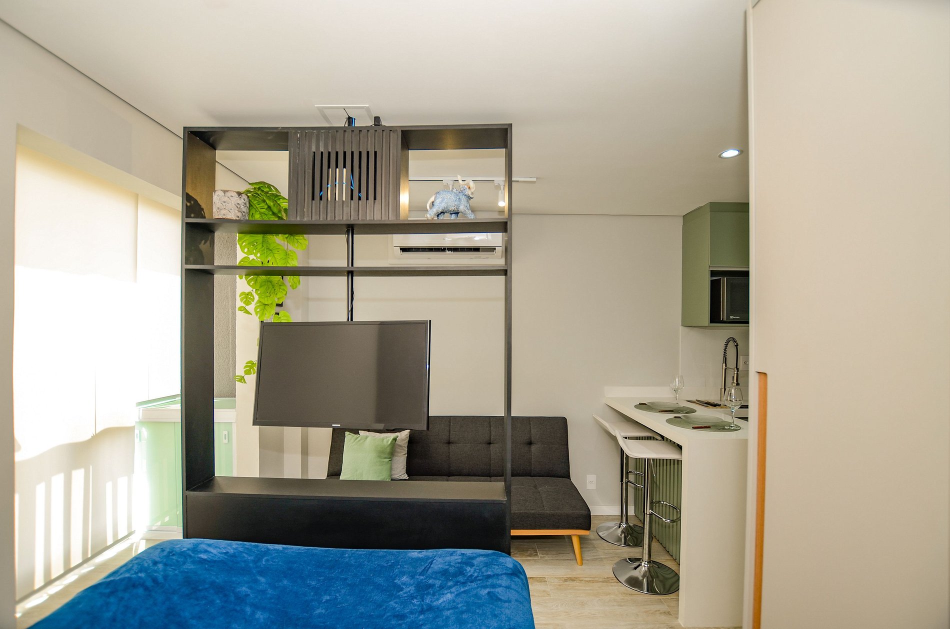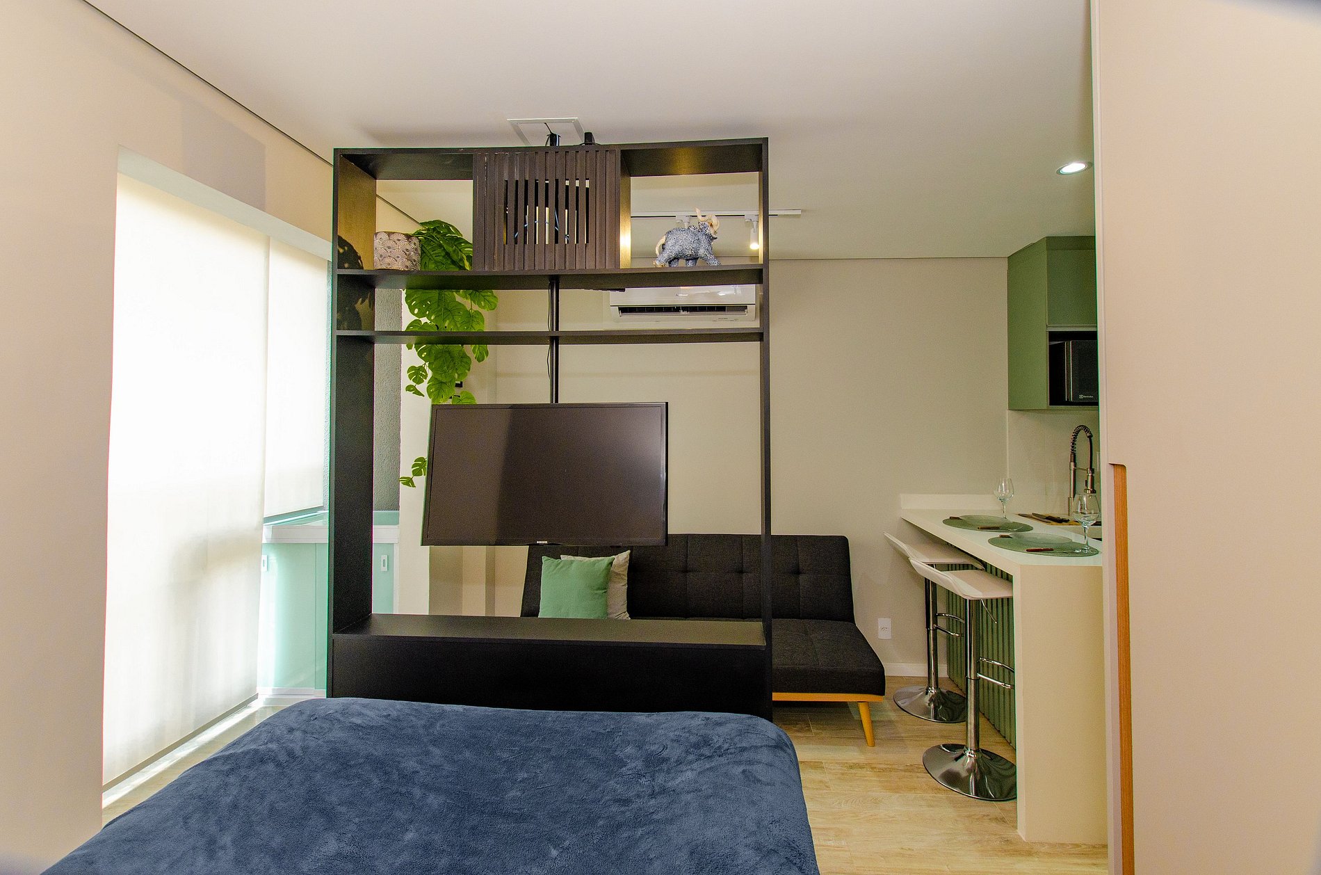 O apartamento também dispõe de ar-condicionado (somente refrigeração) e de uma varanda charmosa, que deixa o ambiente mais agradável com a entrada de luz natural.