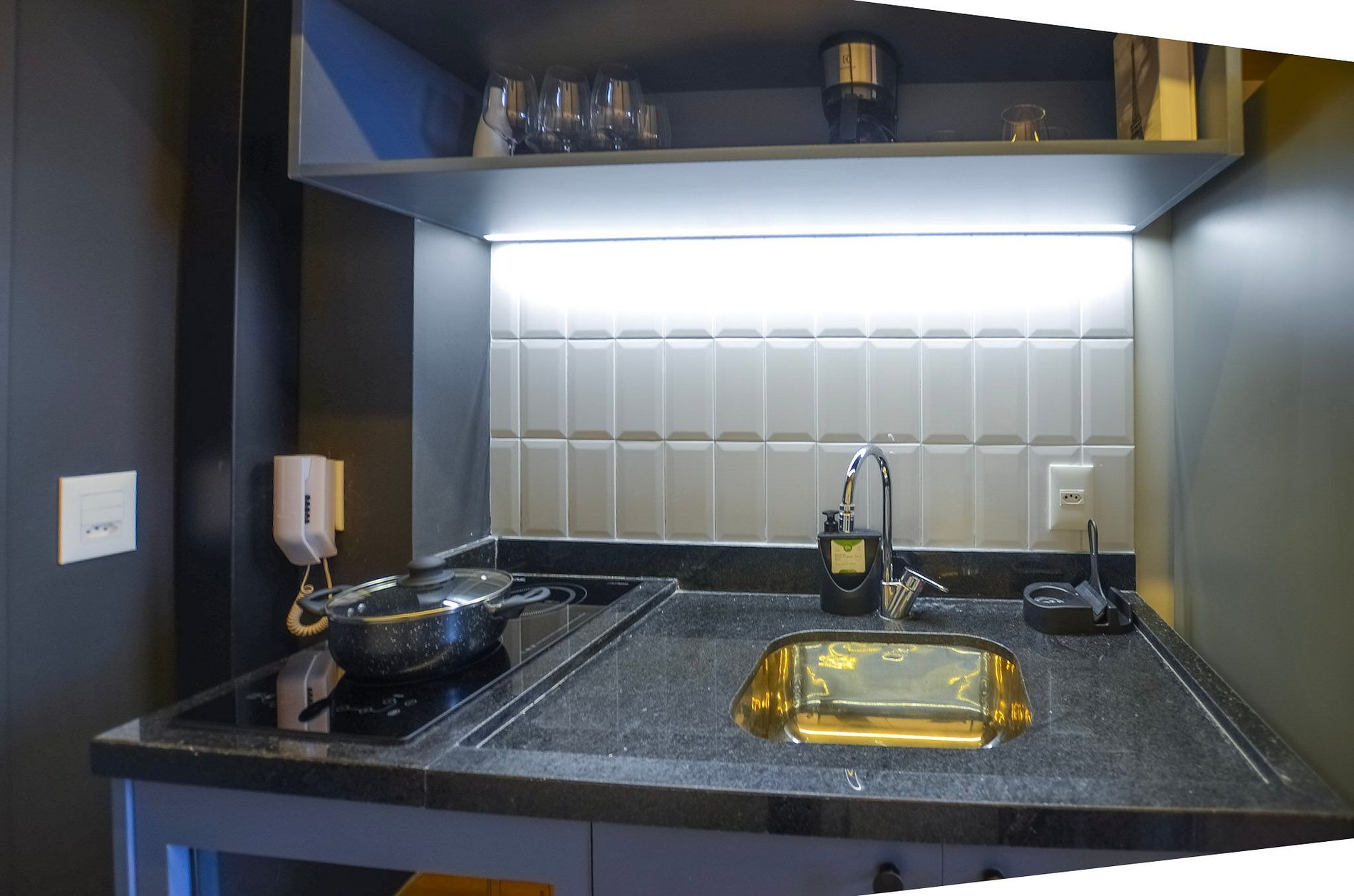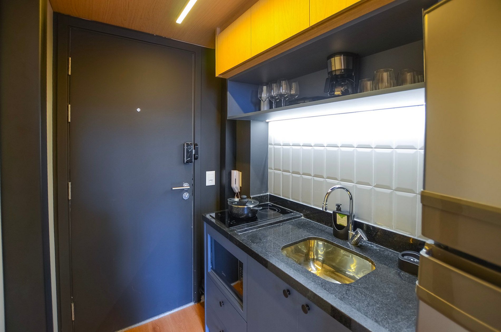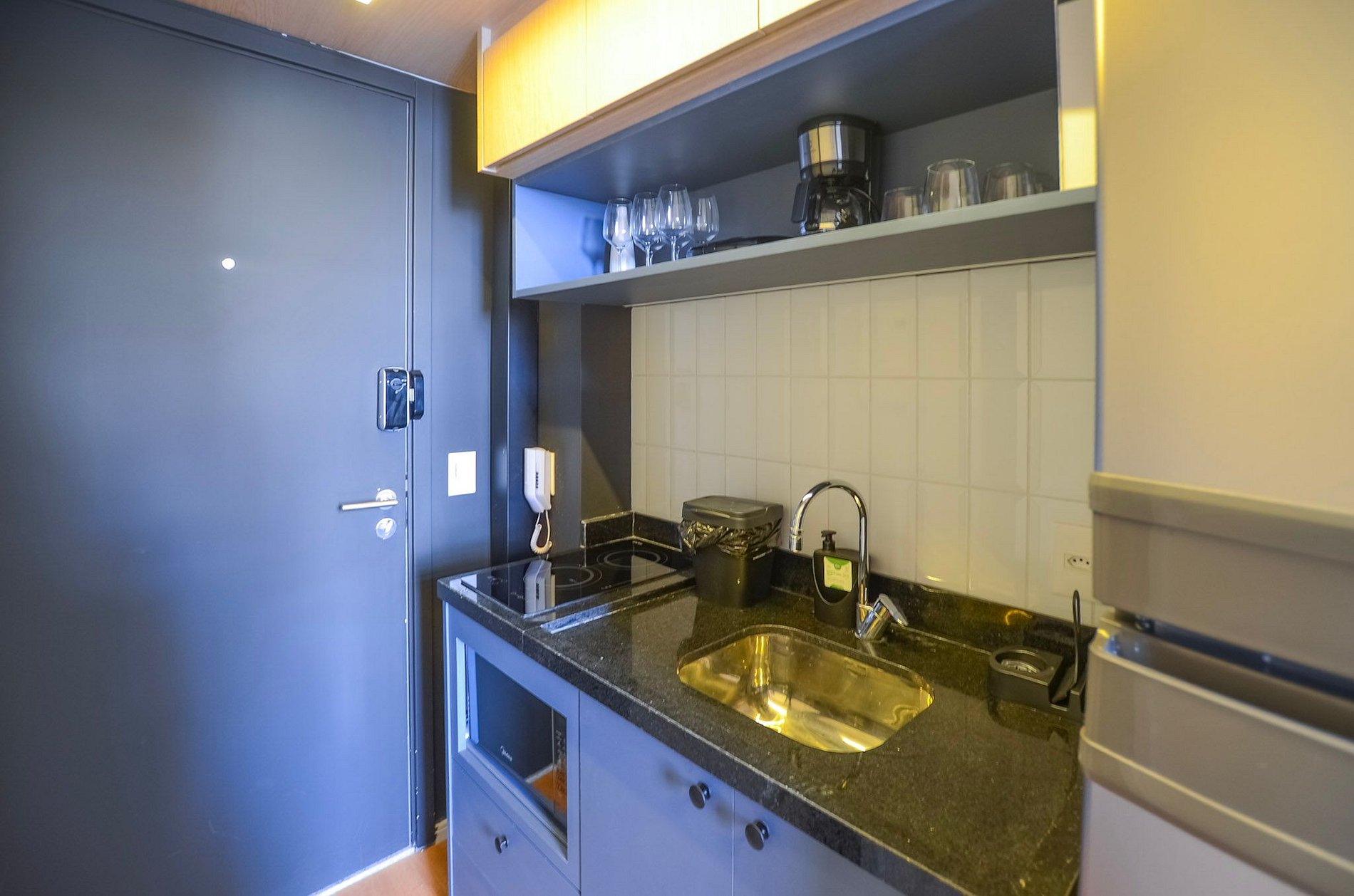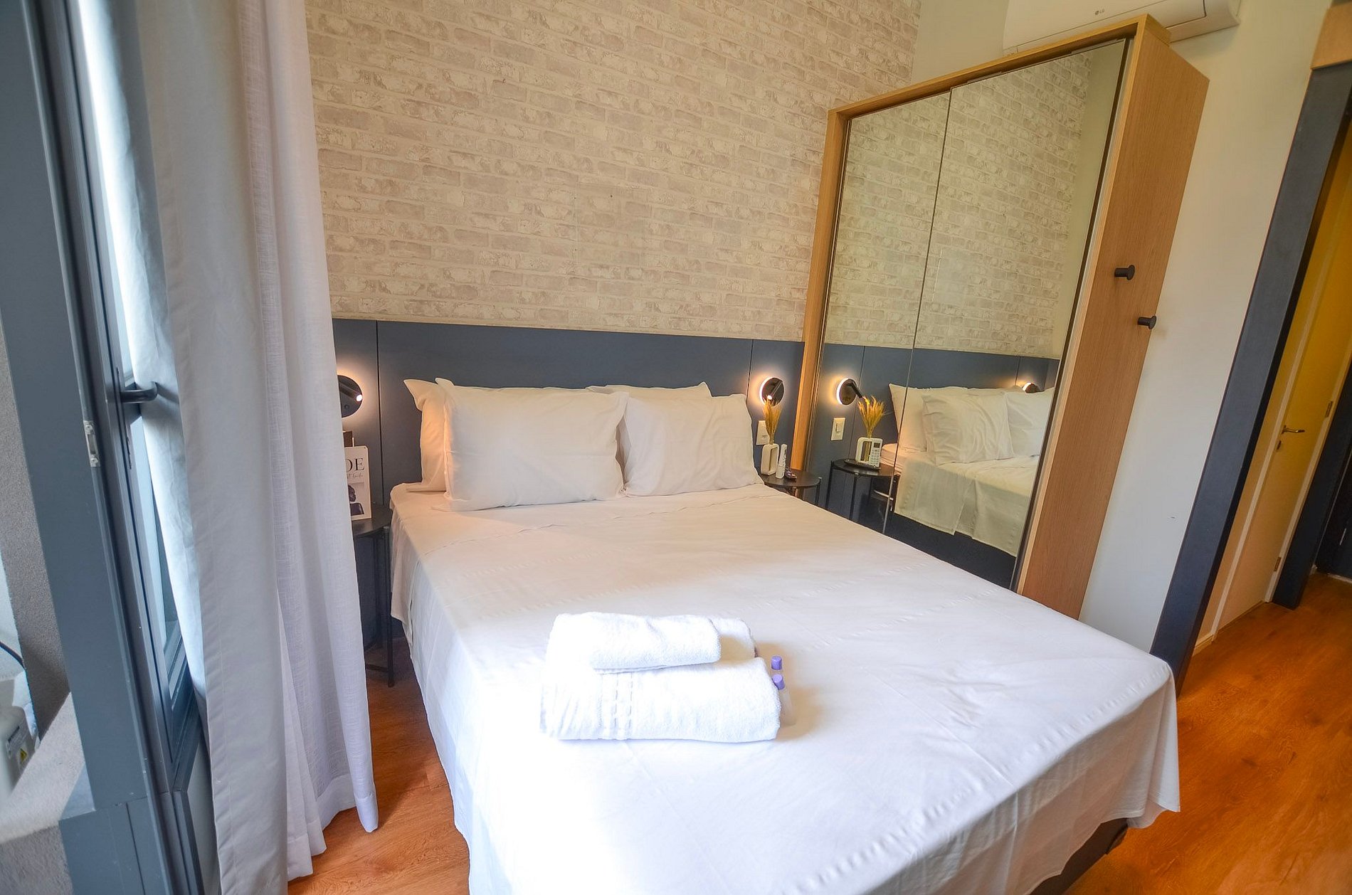 A cozinha compacta, equipada com utensílios básicos, permite o preparo de pequenas refeições. O ambiente dispõe de ar-condicionado (somente refrigeração) e de uma varanda charmosa, que traz mais luz natural e torna a estadia ainda mais agradável.