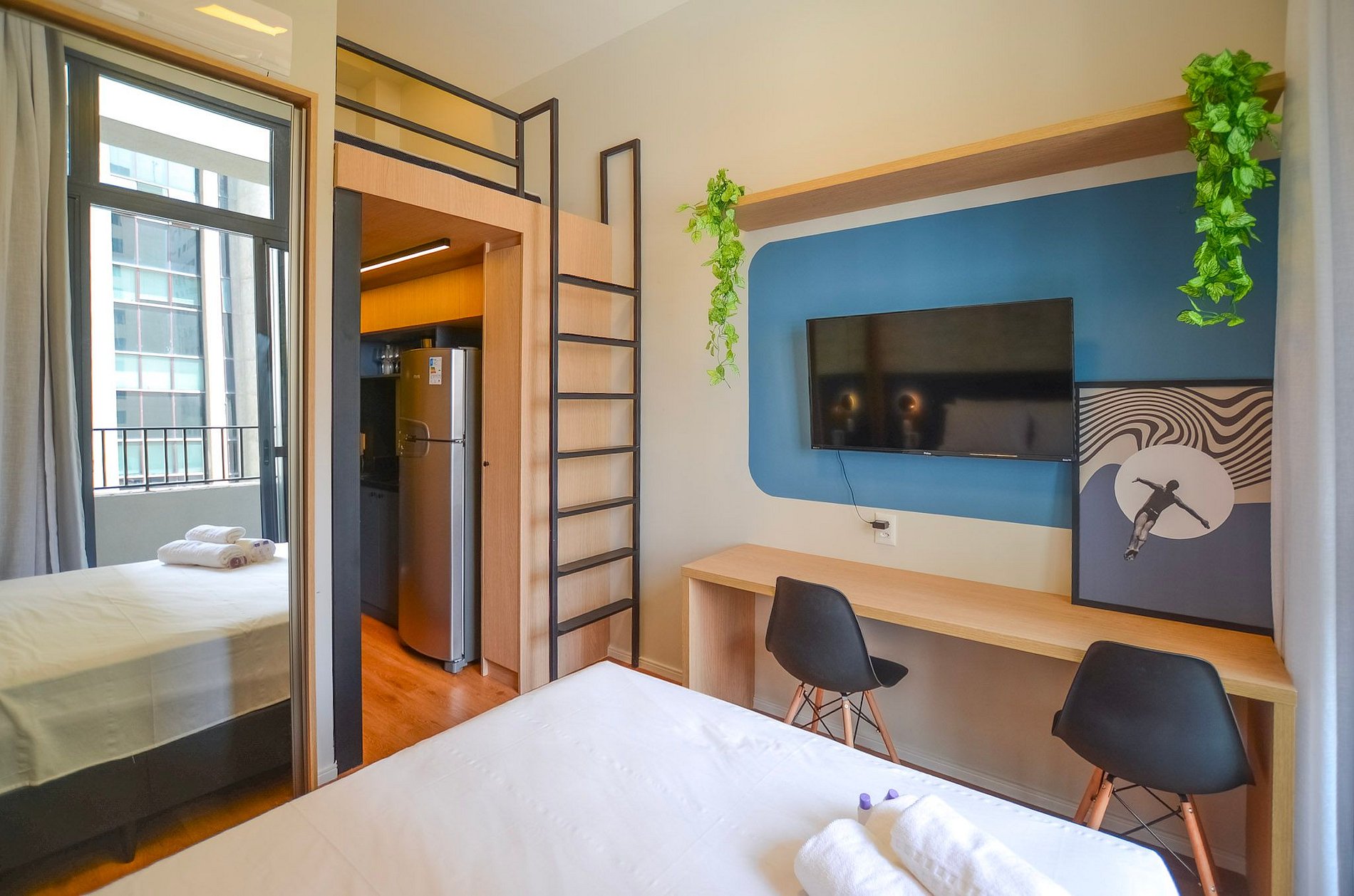 - Cama de casal no mezanino (altura máxima do mezanino: 1,60 m, indicado para dormir)
