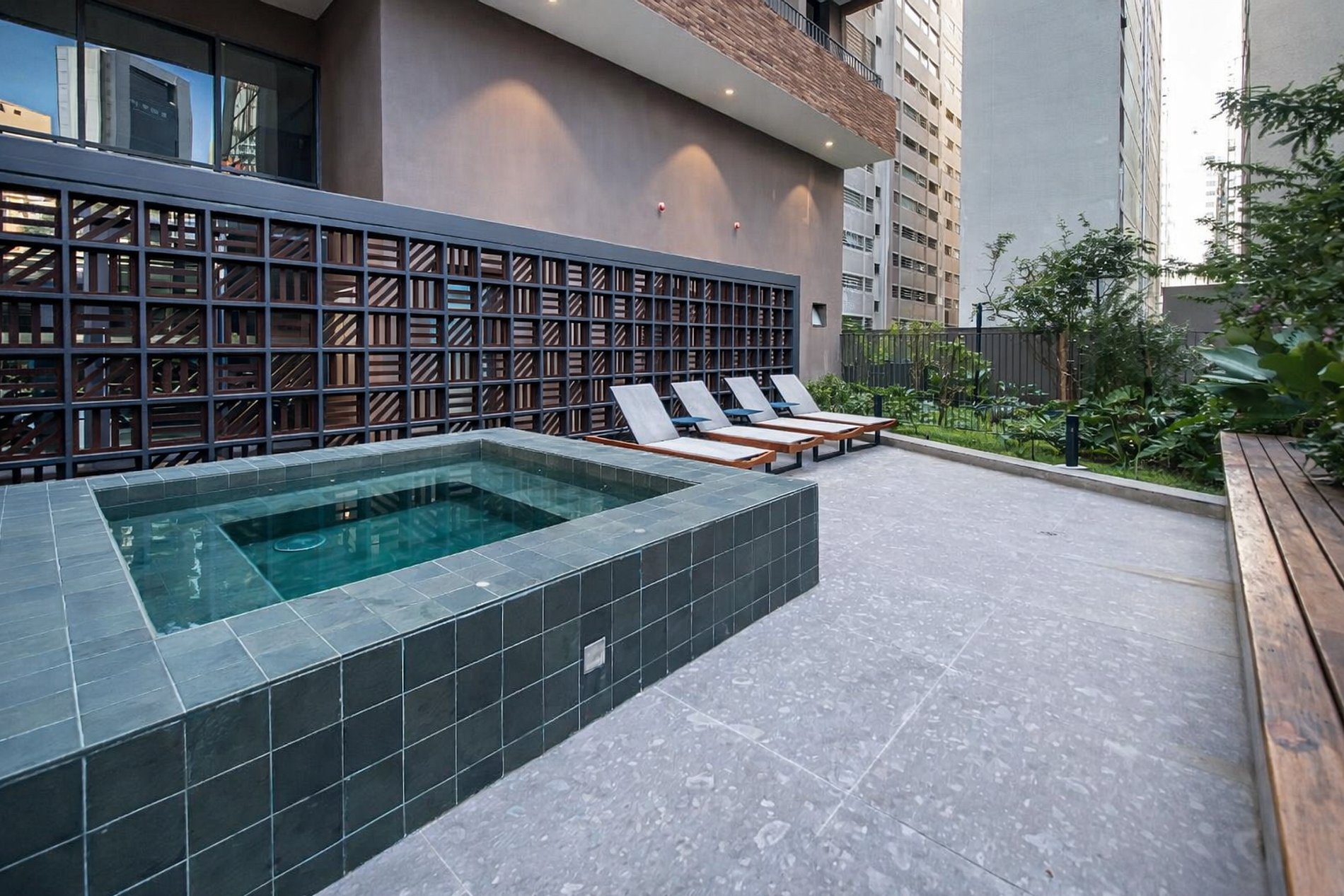 O condomínio conta com uma pequena piscina, lavanderia OMO, coworking e academia