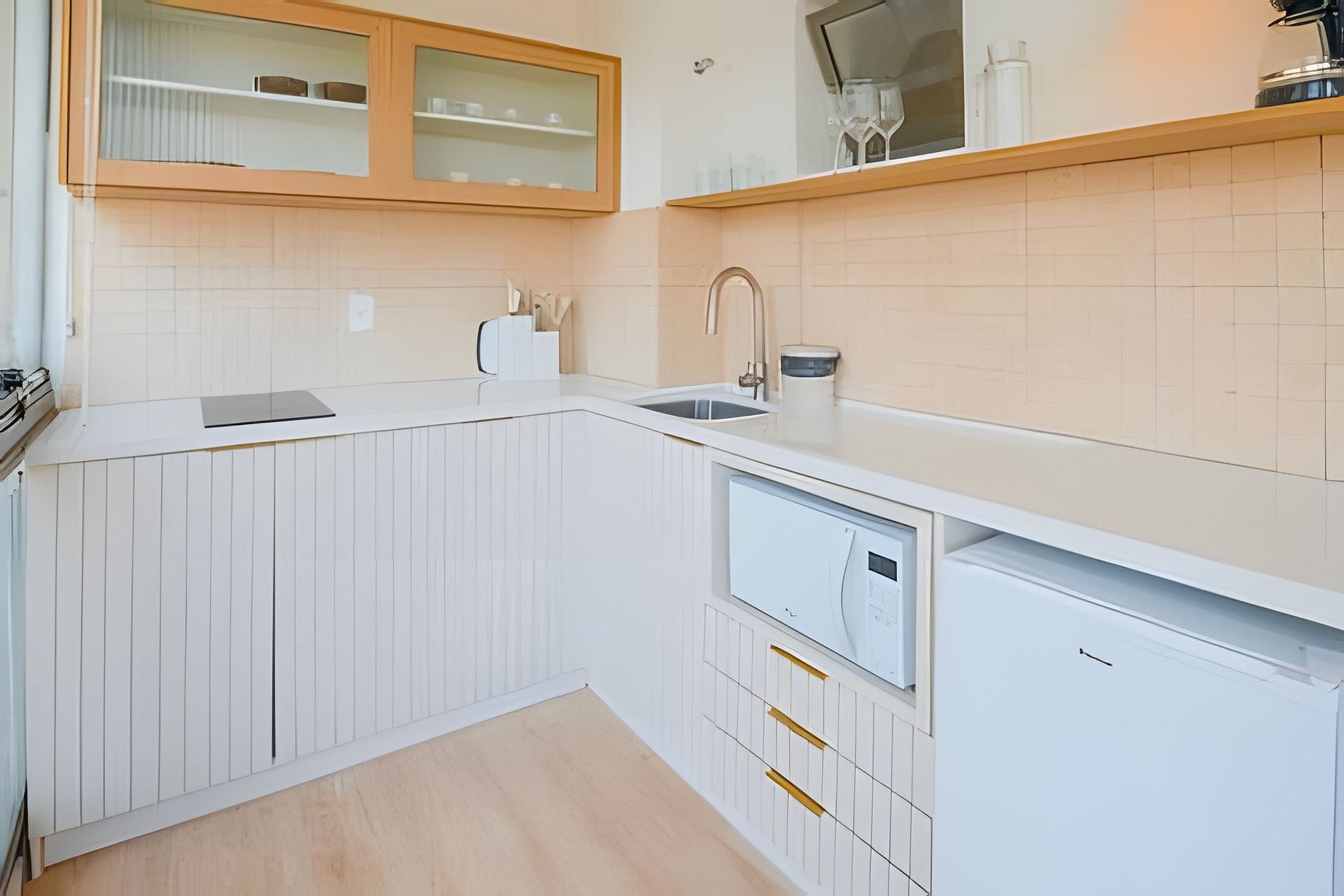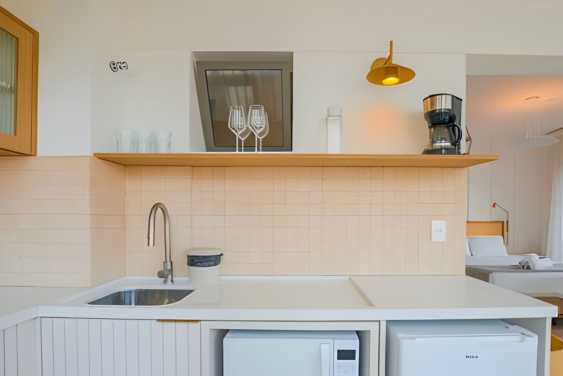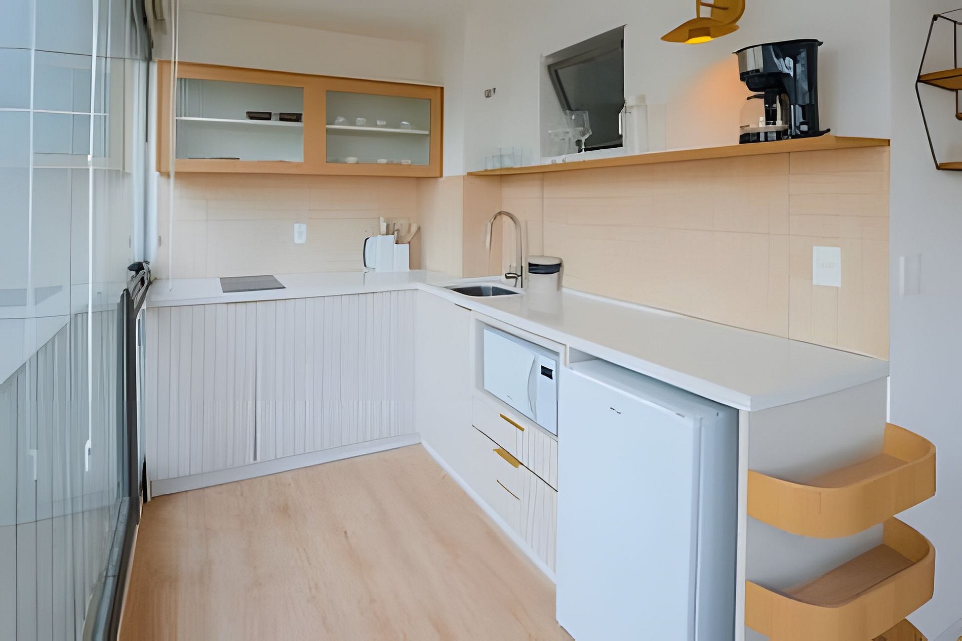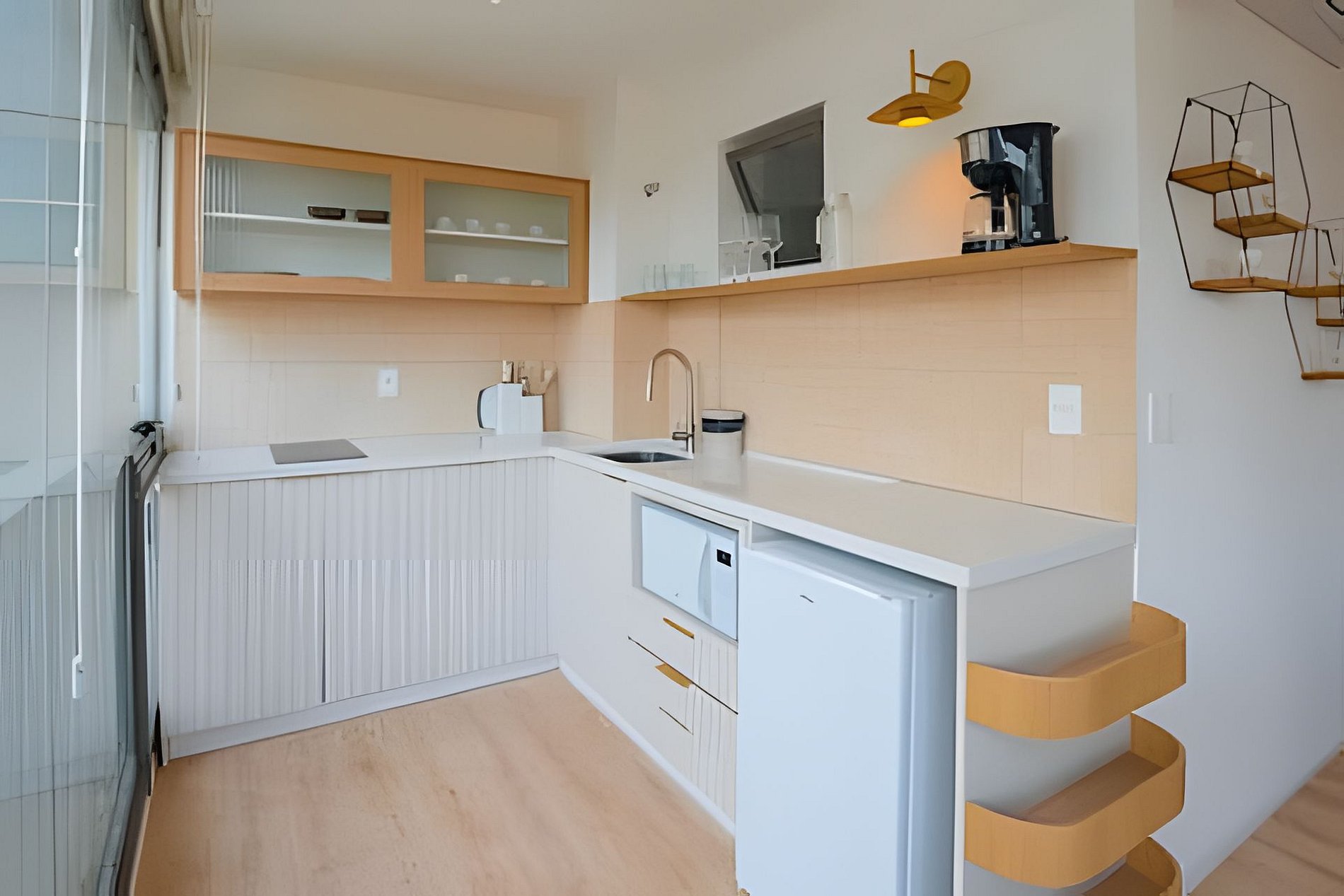 A cozinha equipada permite o preparo de pequenas refeições, garantindo mais autonomia no dia a dia.