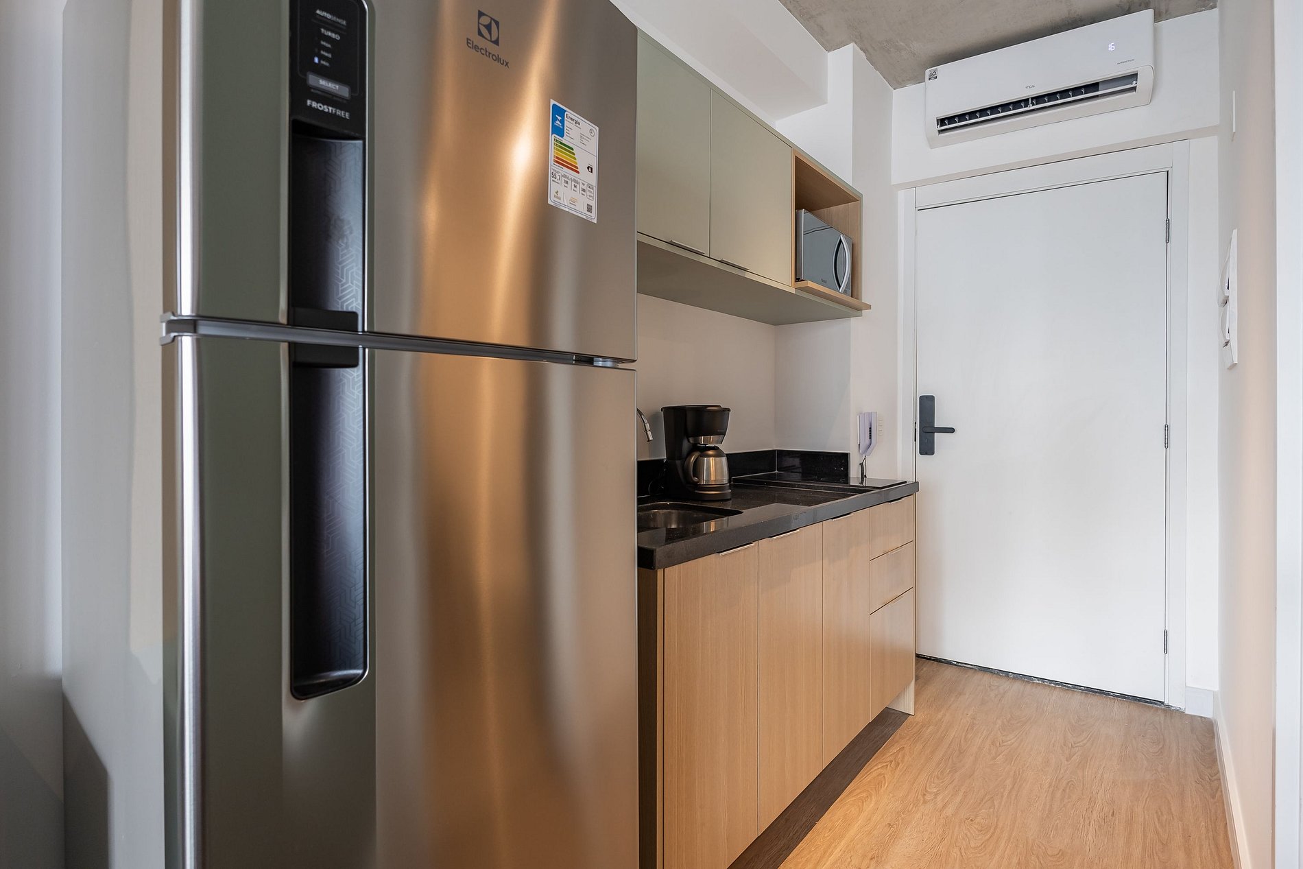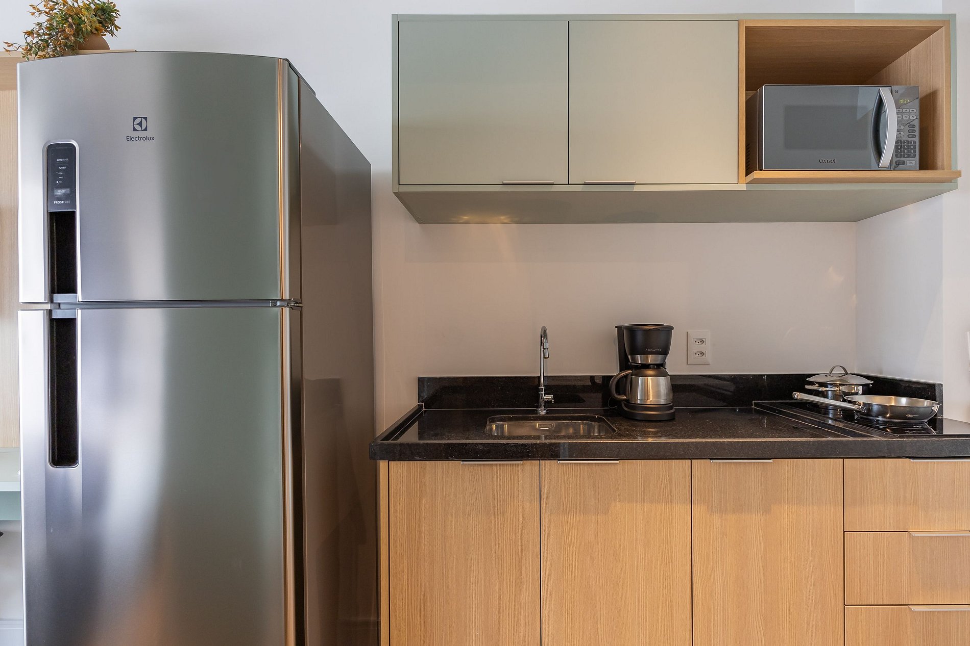 A cozinha equipada com itens básicos permite o preparo de pequenas refeições, garantindo mais autonomia no dia a dia.