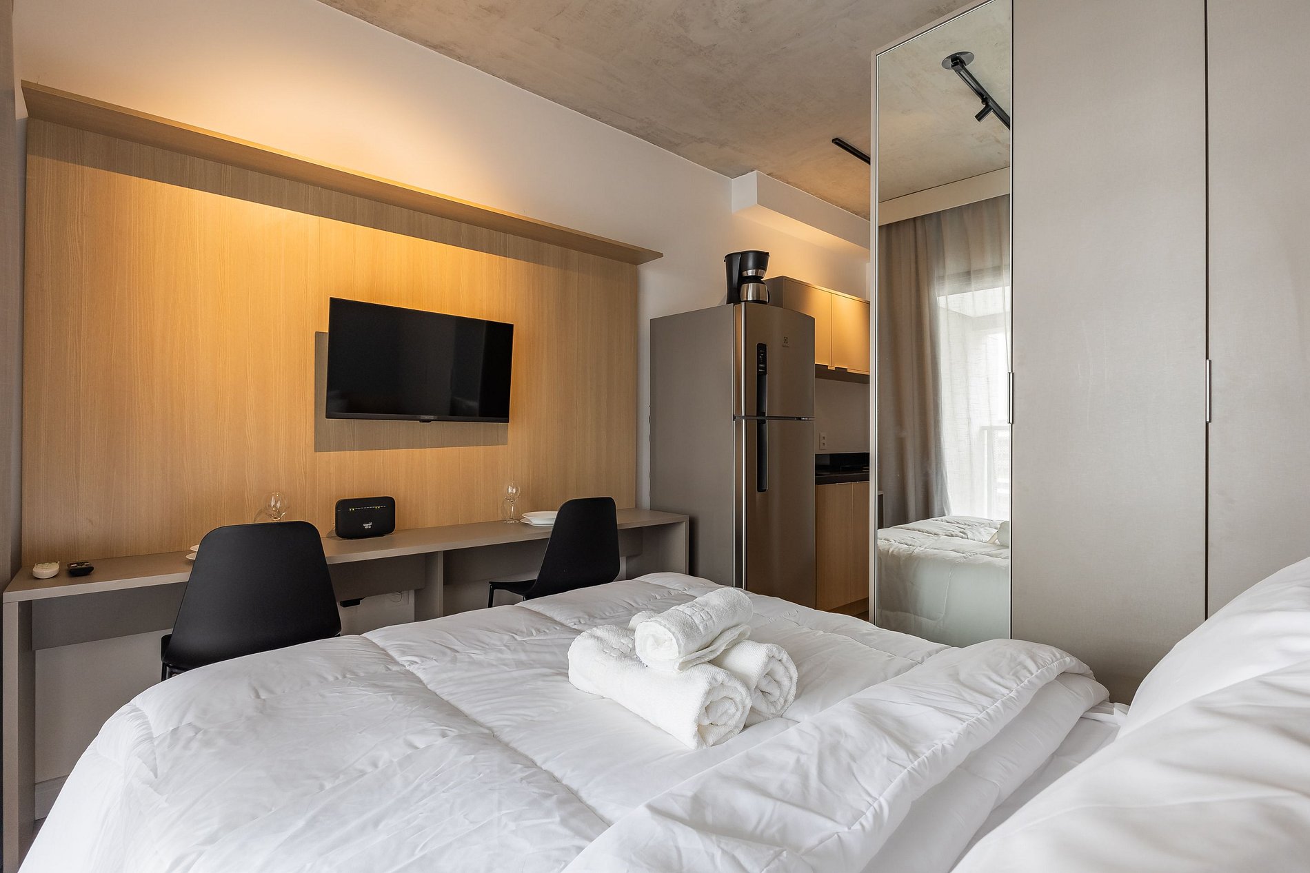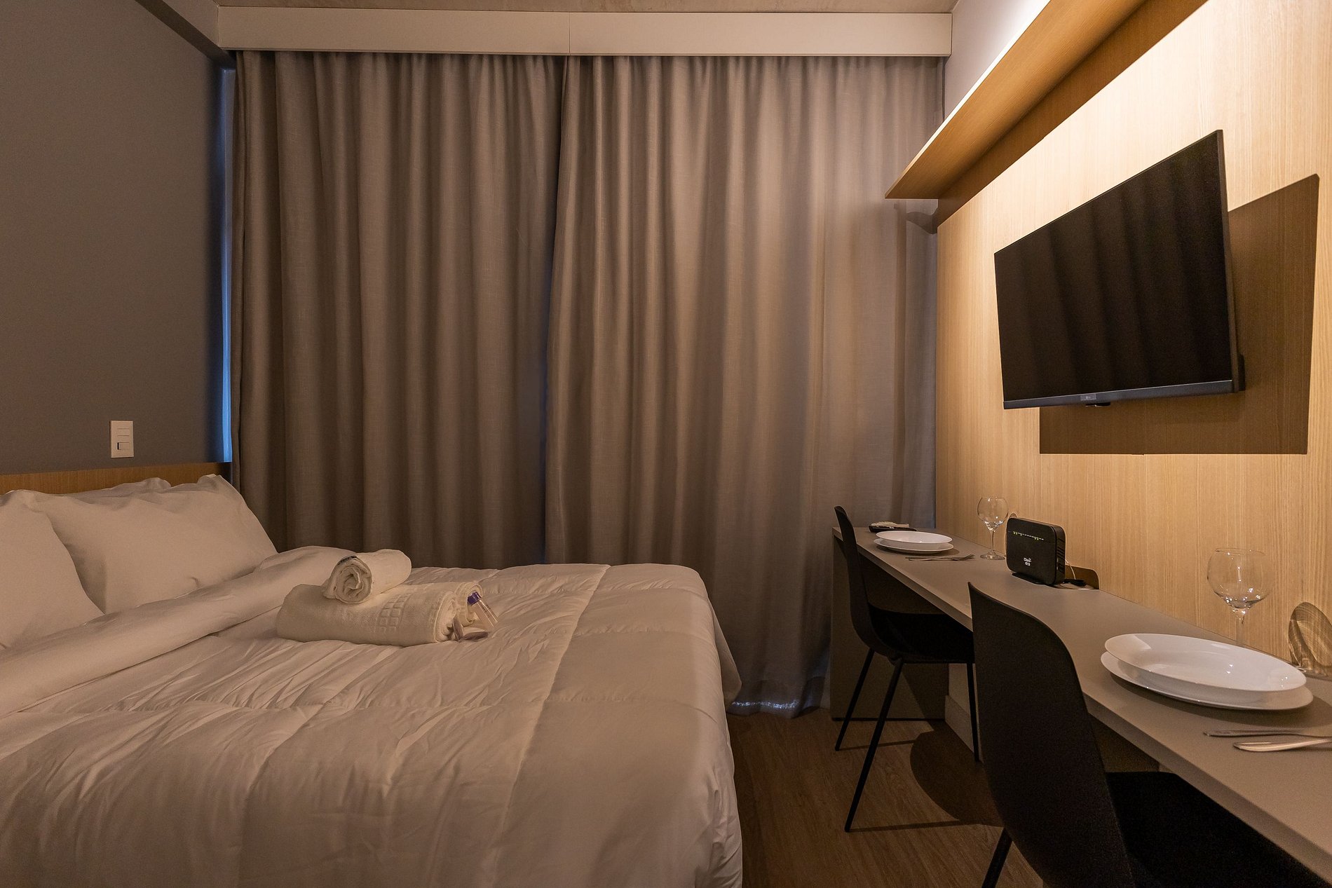 Acomodando até duas pessoas, o espaço oferece uma cama tamanho casal padrão e um enxoval de cama e banho fornecido no início da estadia, sem trocas ou reposições.