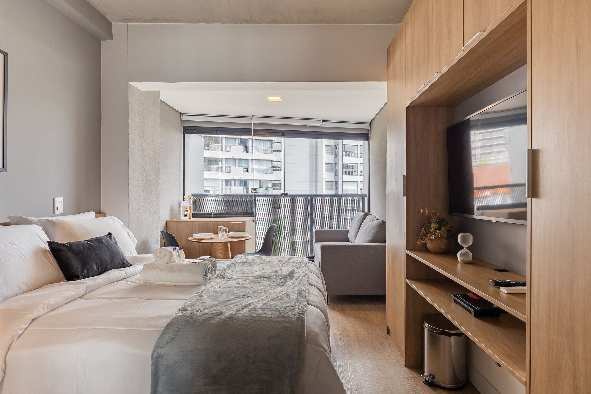 O apartamento também dispõe de ar-condicionado (somente refrigeração) e de uma varanda charmosa, que deixa o ambiente mais agradável com a entrada de luz natural.