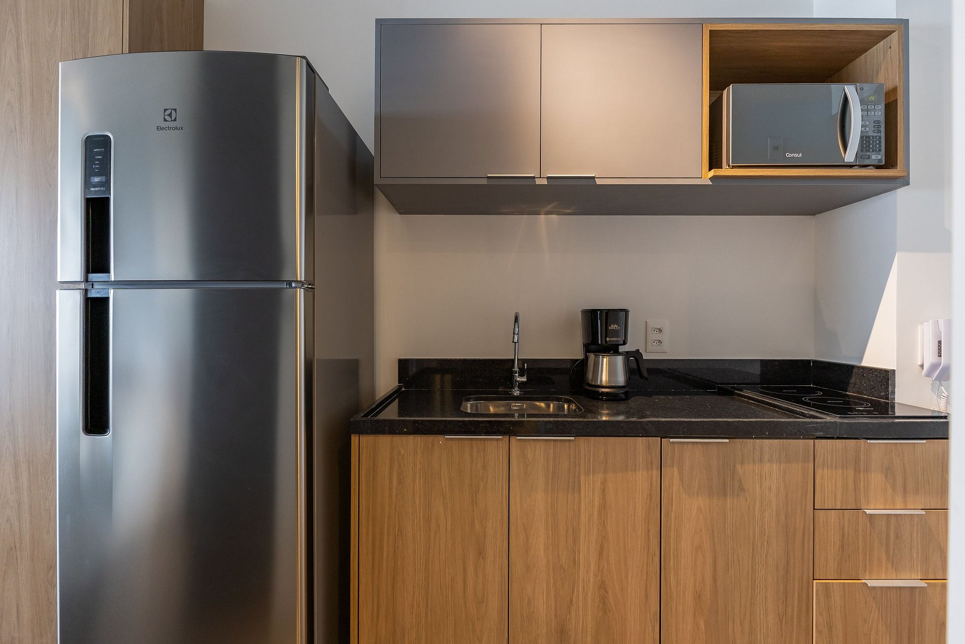 A cozinha equipada com itens básicos permite o preparo de pequenas refeições, garantindo mais autonomia no dia a dia.