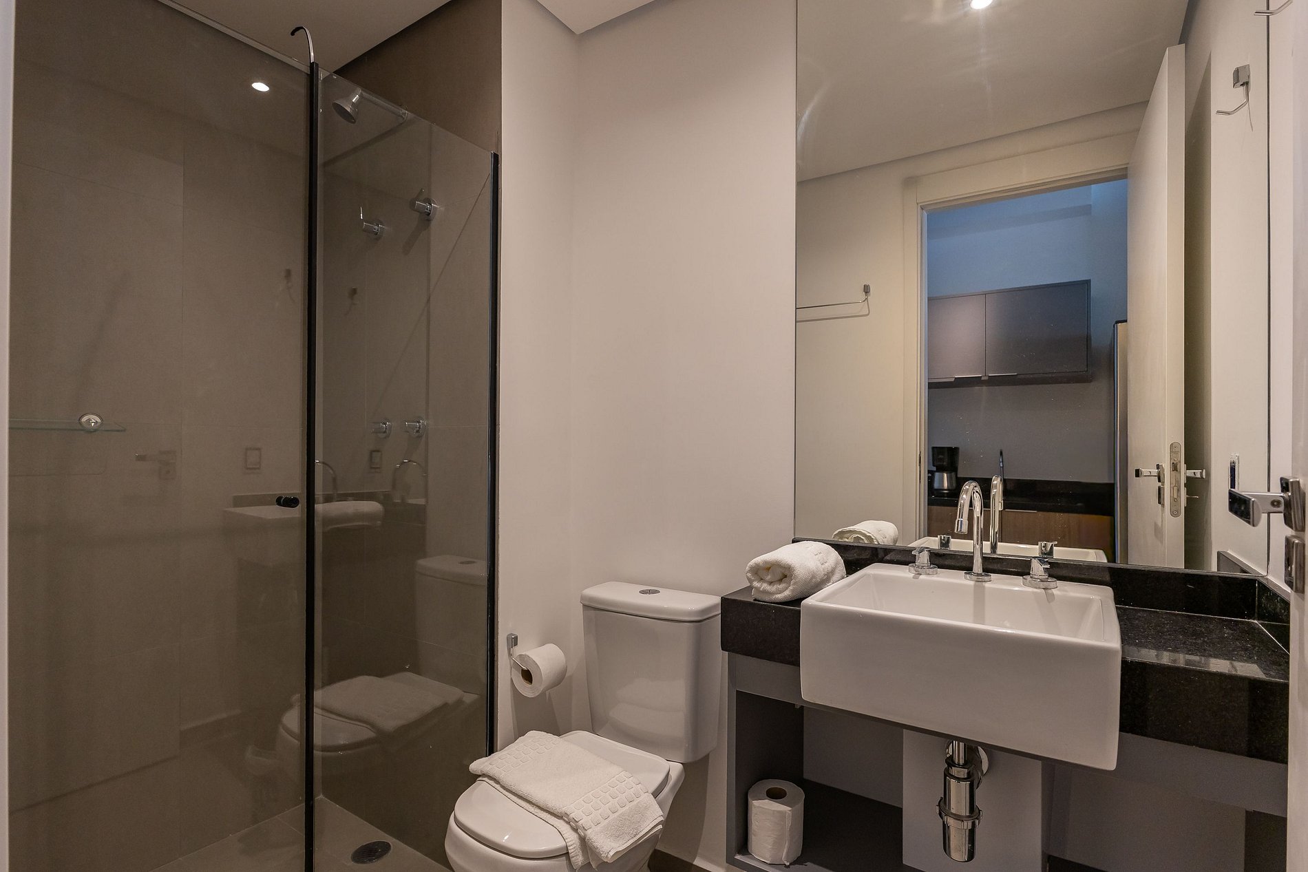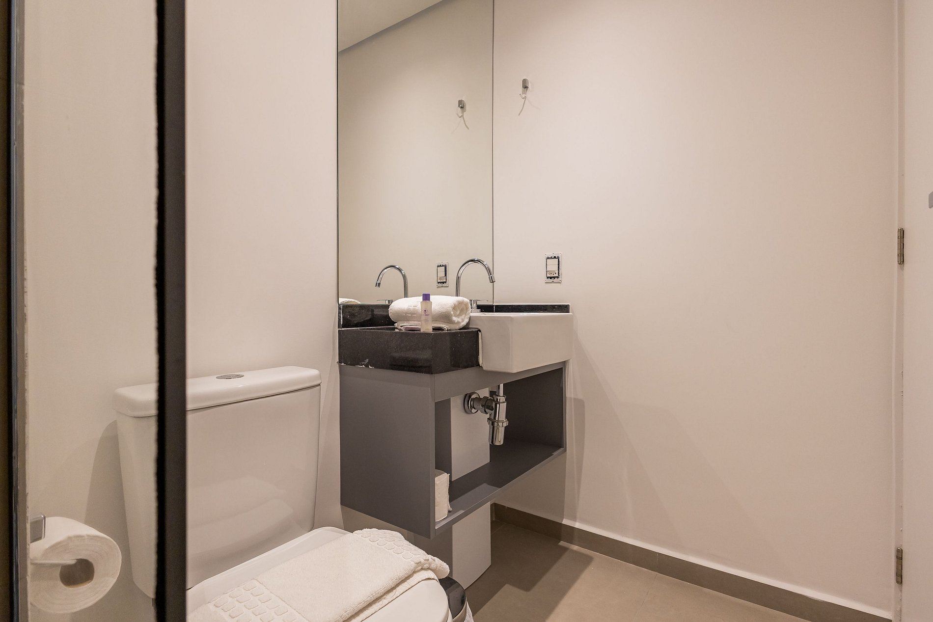 Por fim, o banheiro com secador de cabelo traz ainda mais praticidade para a sua rotina.