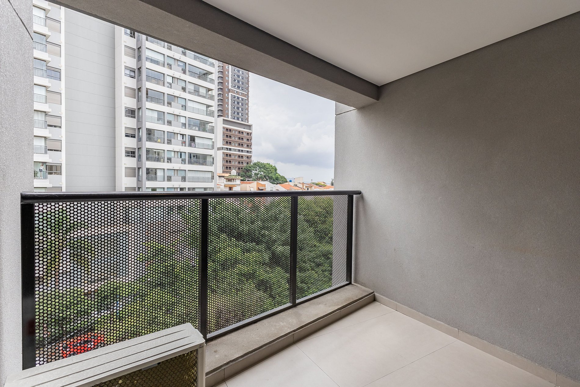 O apartamento também dispõe de ar-condicionado (somente refrigeração) e de uma varanda charmosa, que deixa o ambiente mais agradável com a entrada de luz natural.