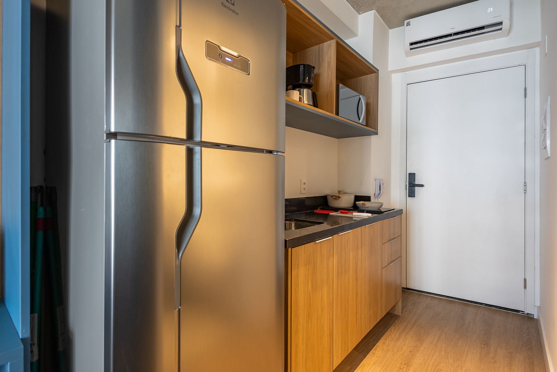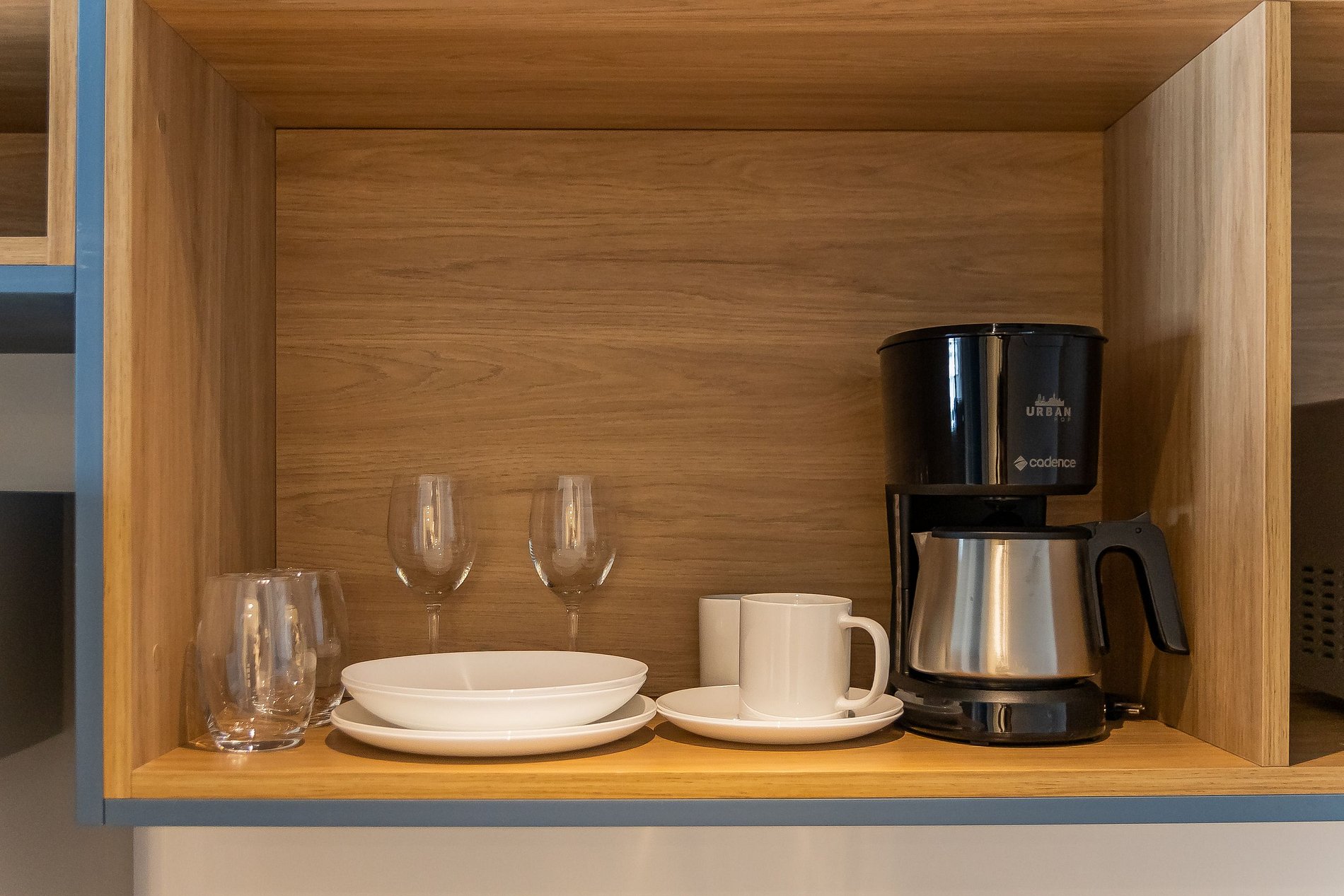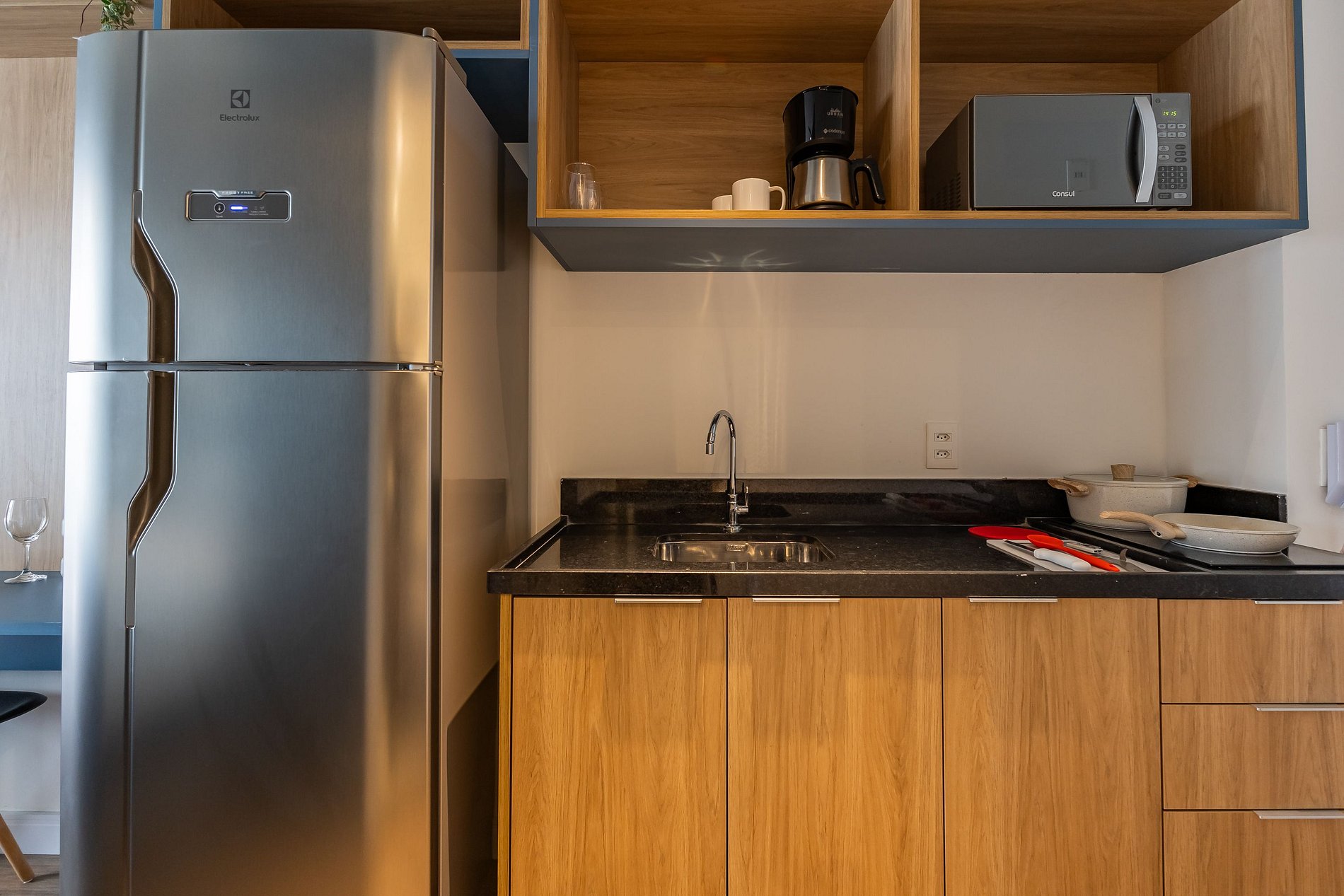 A cozinha equipada com itens básicos permite o preparo de pequenas refeições, garantindo mais autonomia no dia a dia.