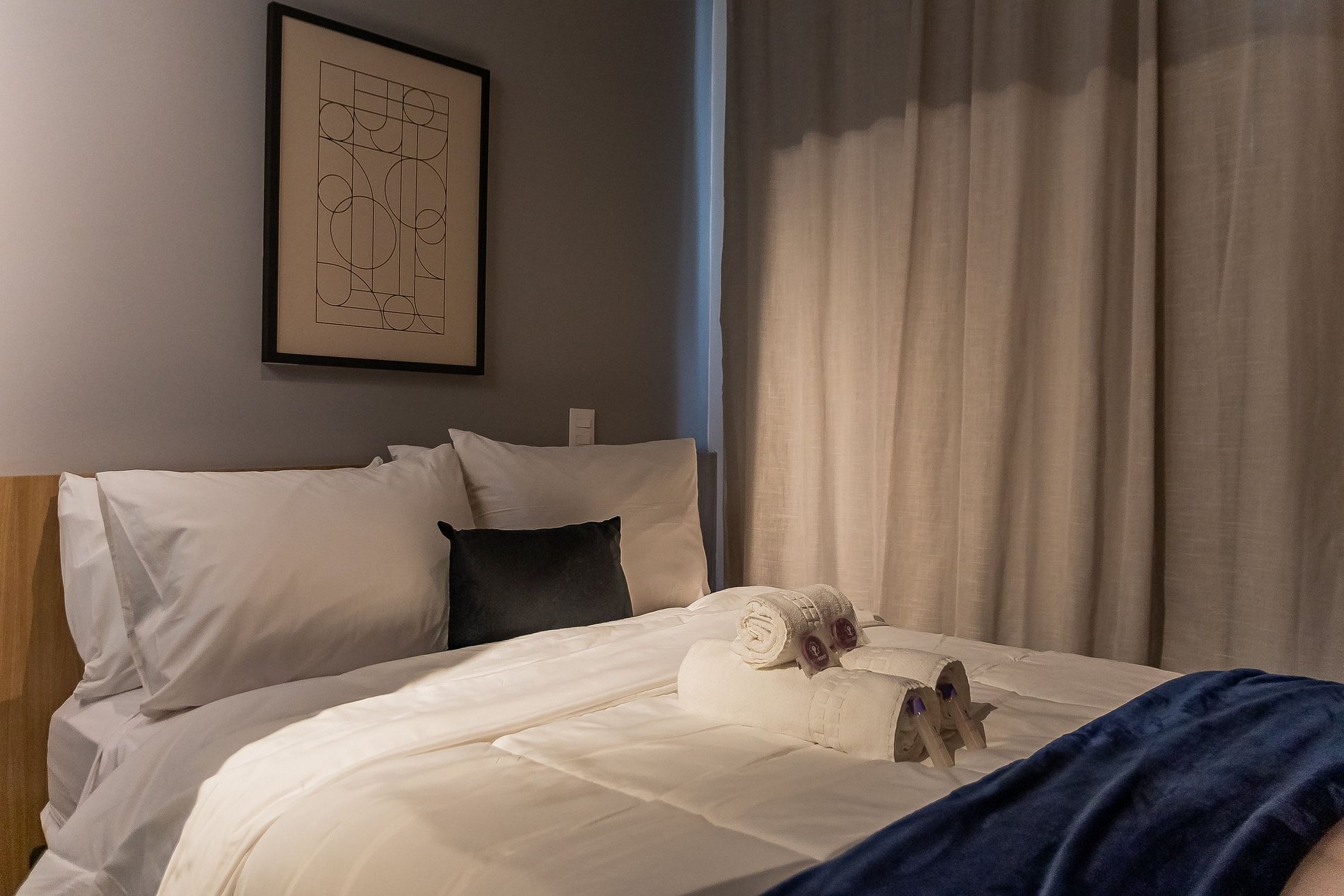 Acomodando até duas pessoas, o espaço oferece uma cama tamanho casal padrão e um enxoval de cama e banho fornecido no início da estadia, sem trocas ou reposições.