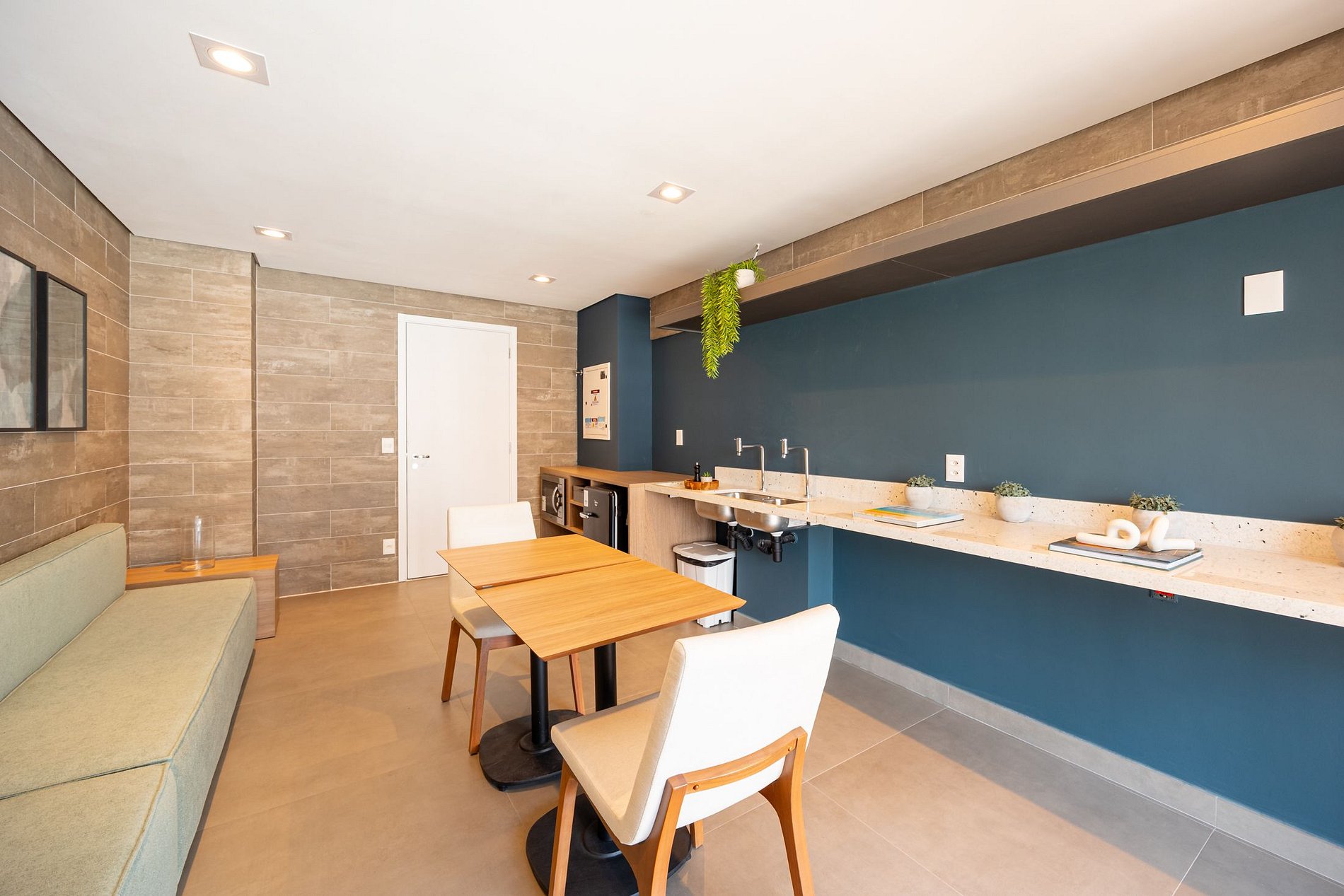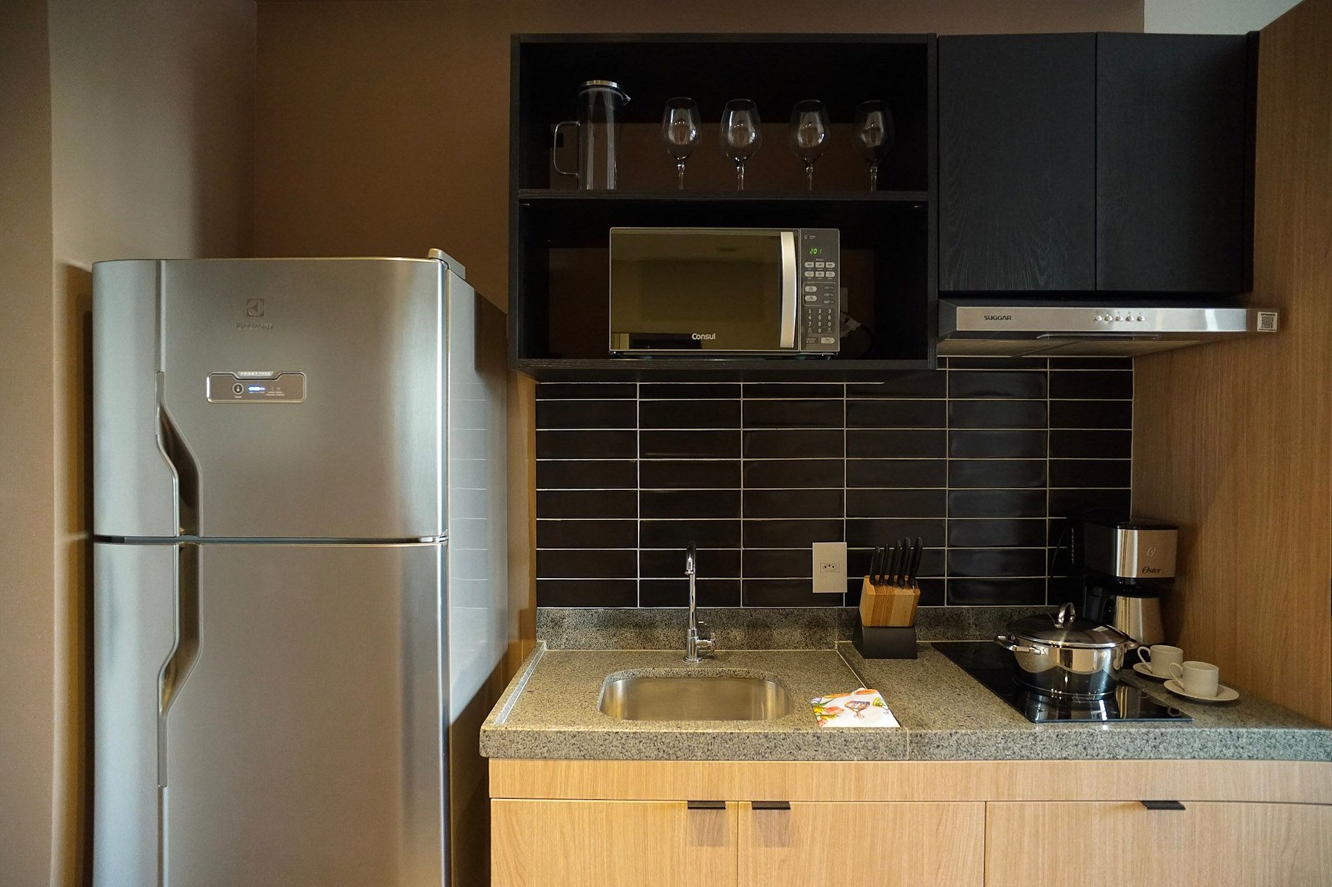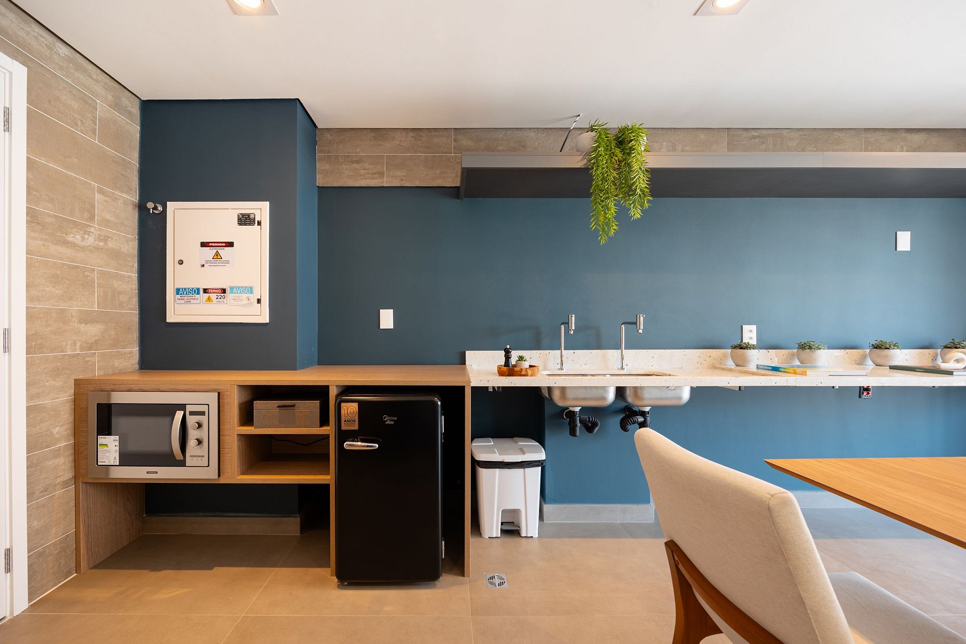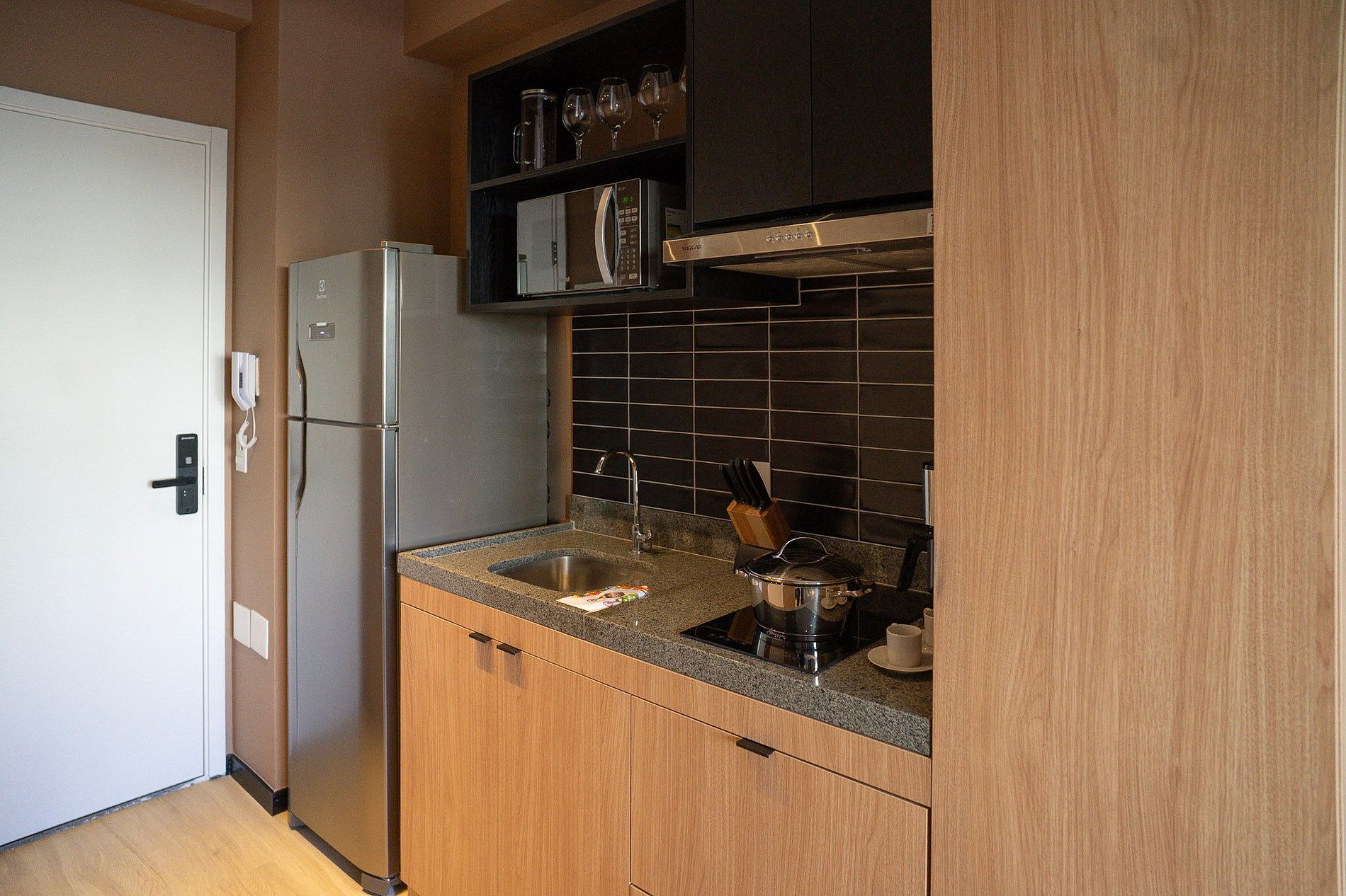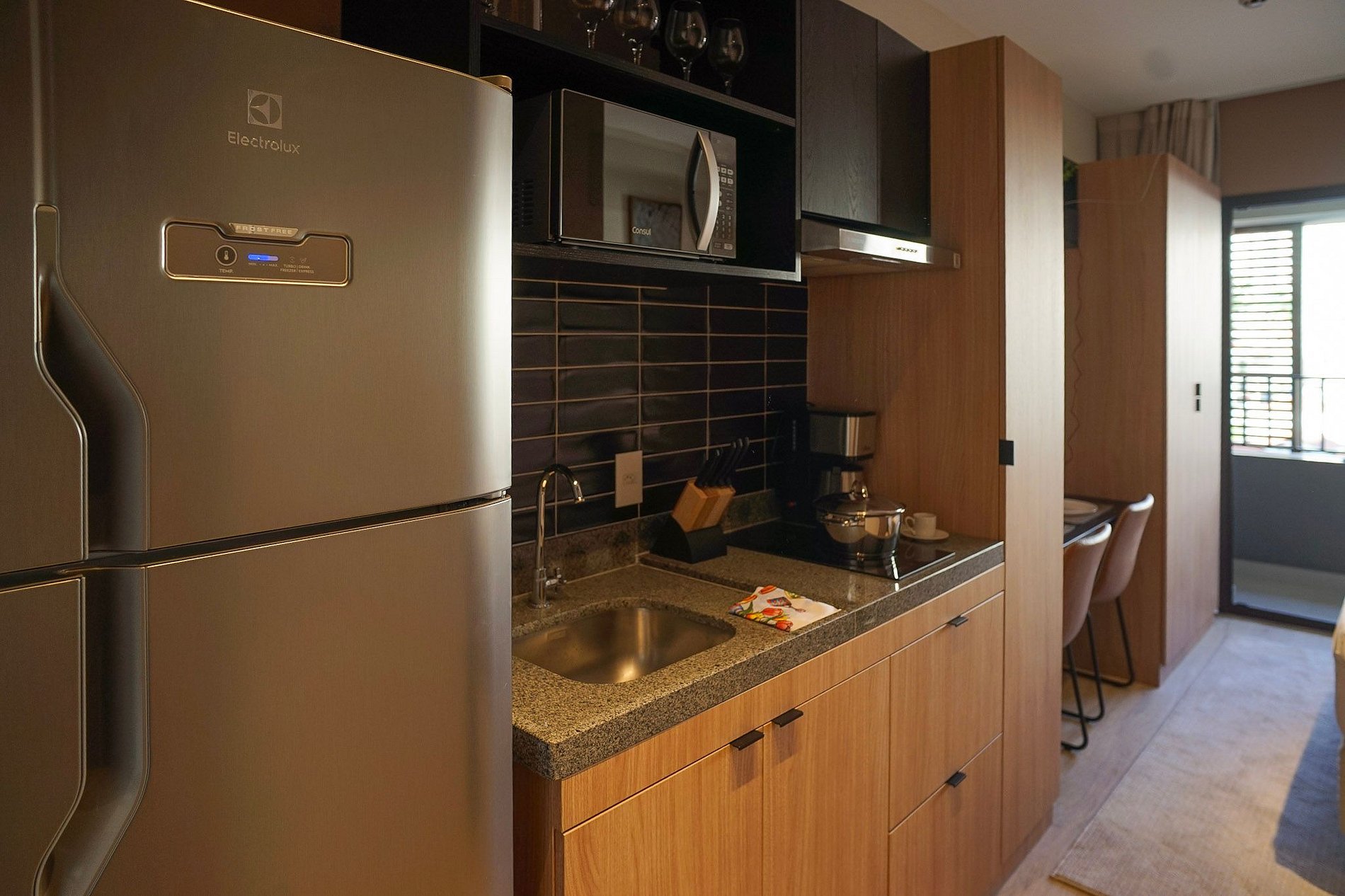 A cozinha equipada com itens básicos permite o preparo de pequenas refeições, garantindo mais autonomia no dia a dia.