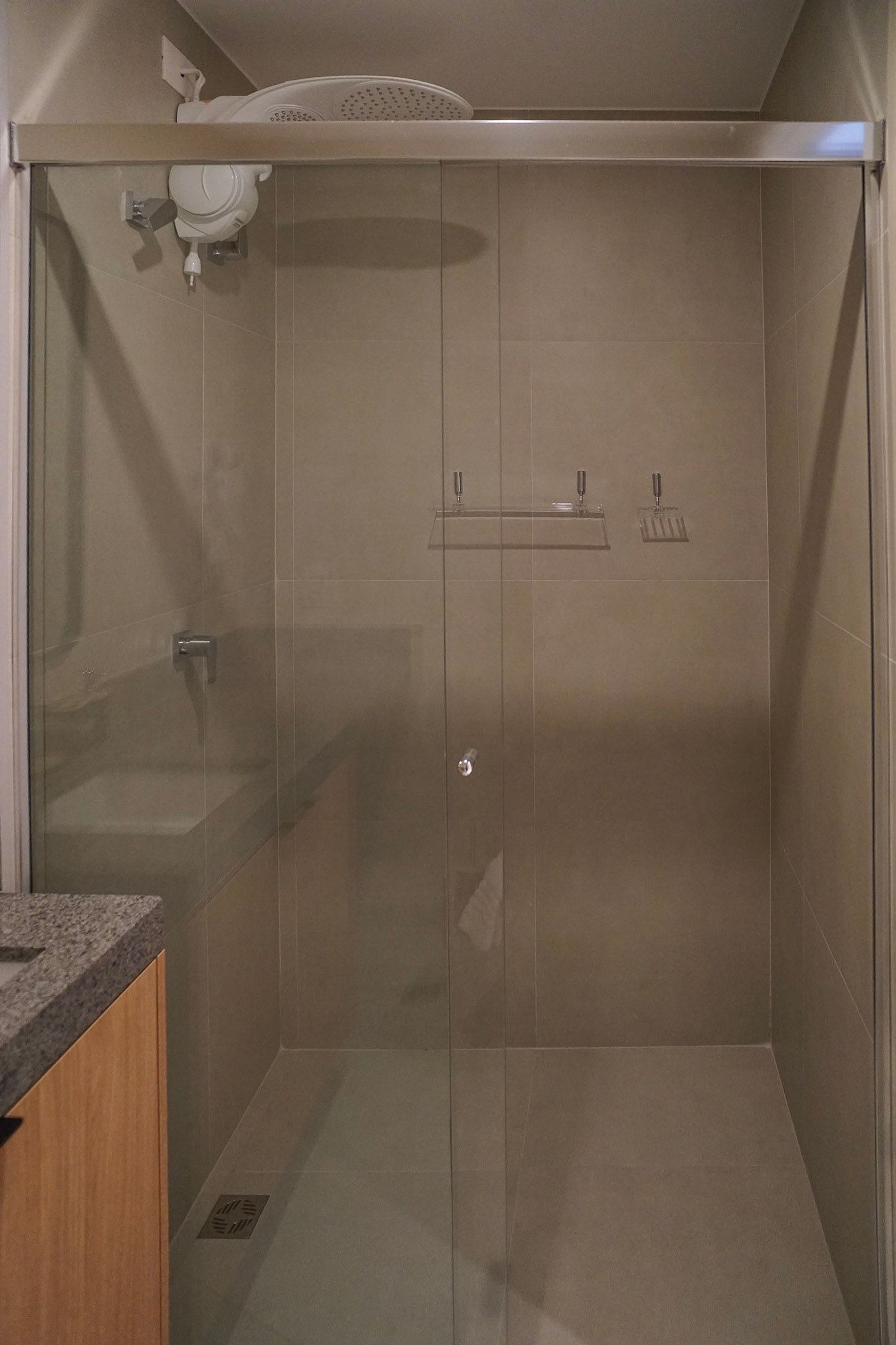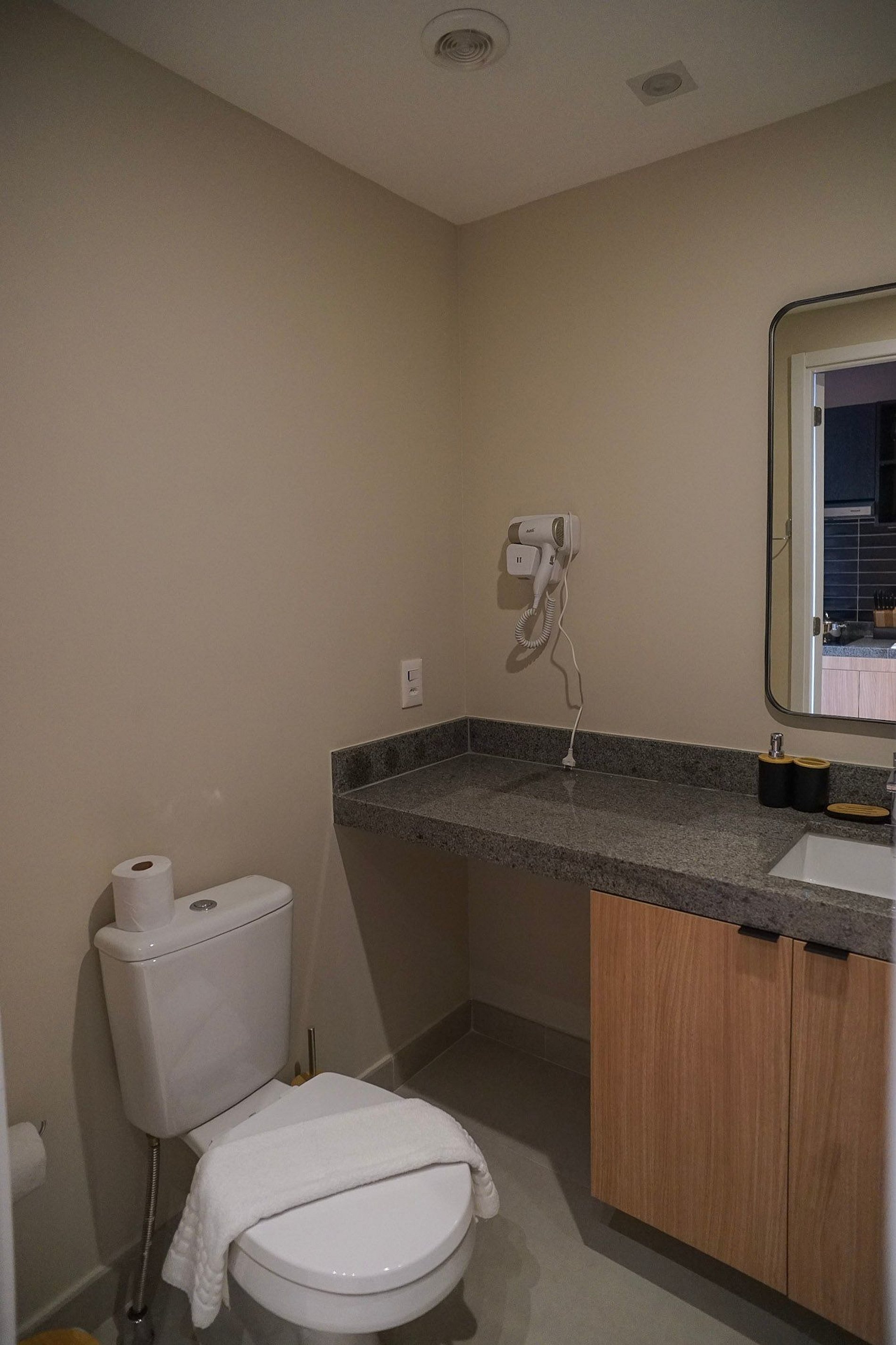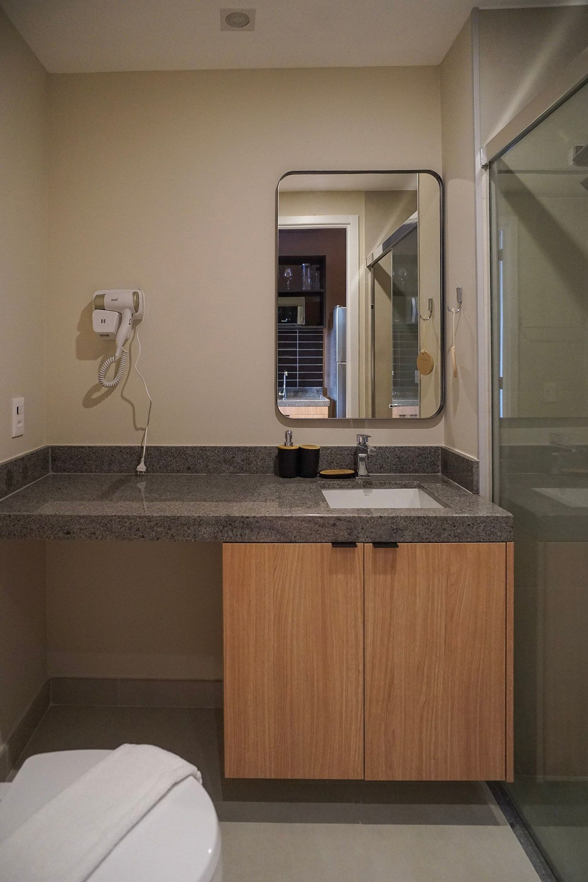 Por fim, o banheiro com secador de cabelo traz ainda mais praticidade para a sua rotina.