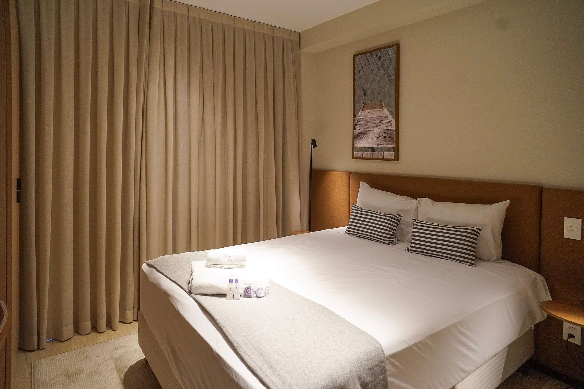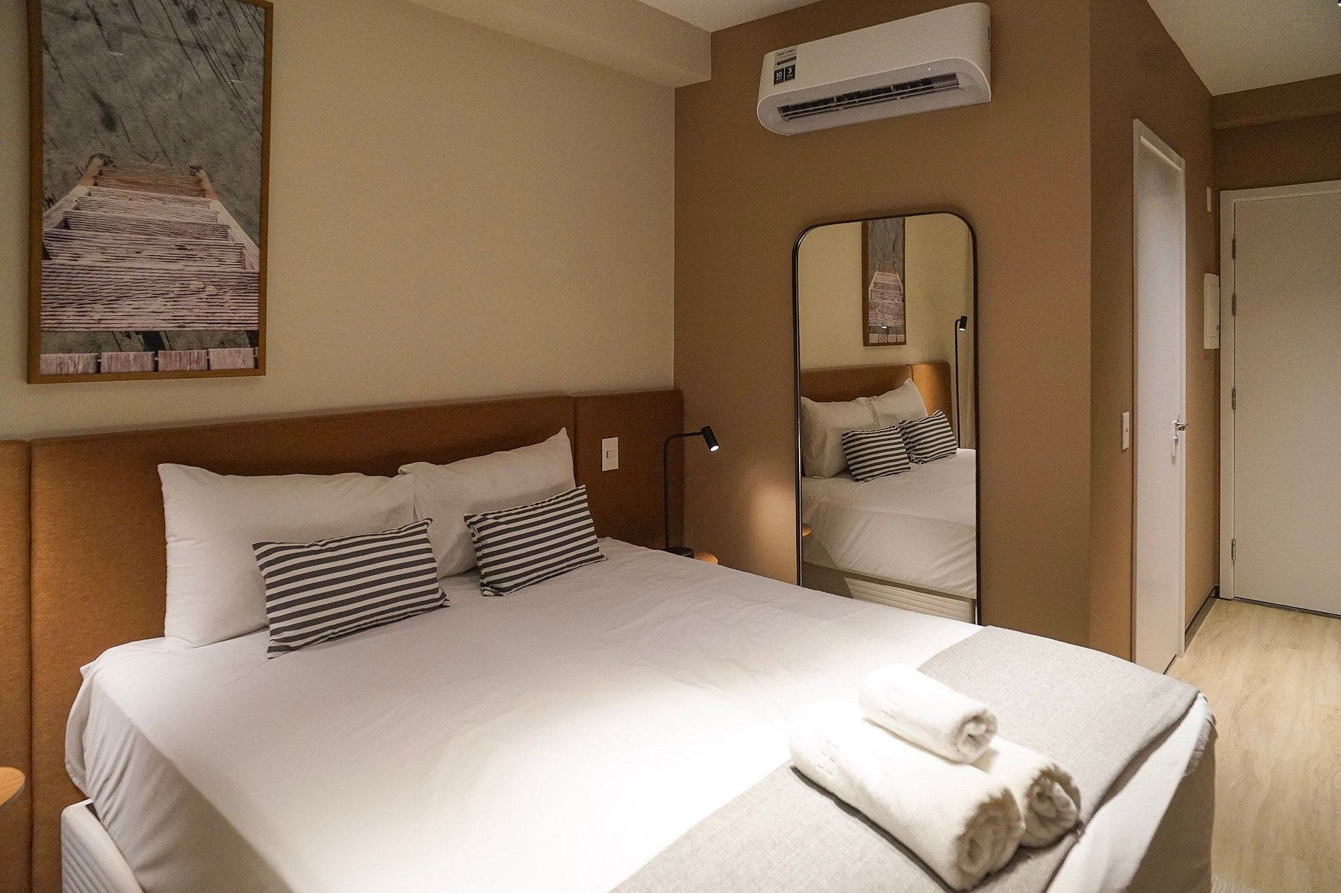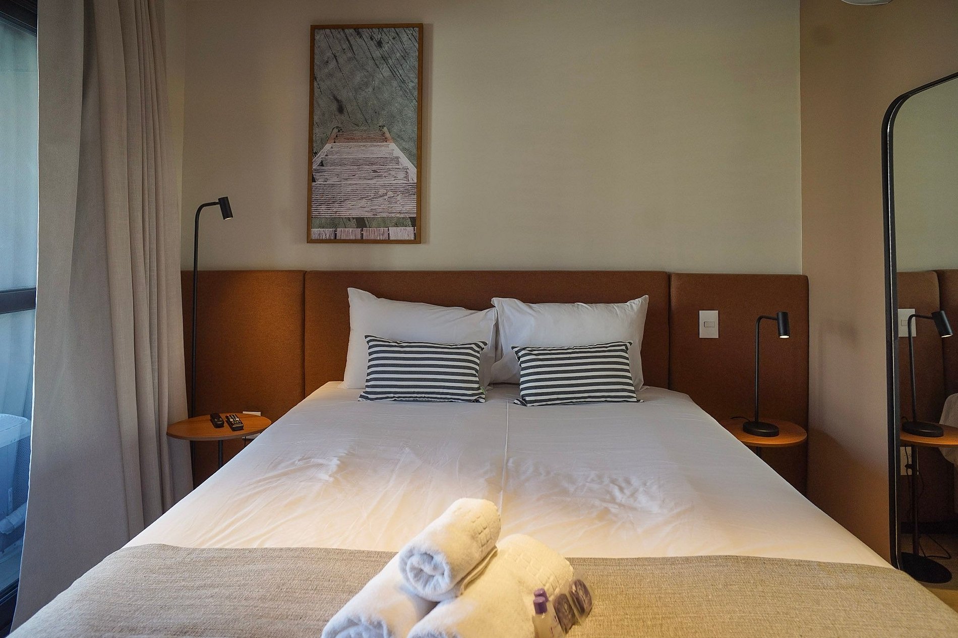Acomodando até duas pessoas, o espaço oferece uma cama tamanho queen e enxoval de cama e banho fornecido no início da estadia, sem trocas ou reposições.