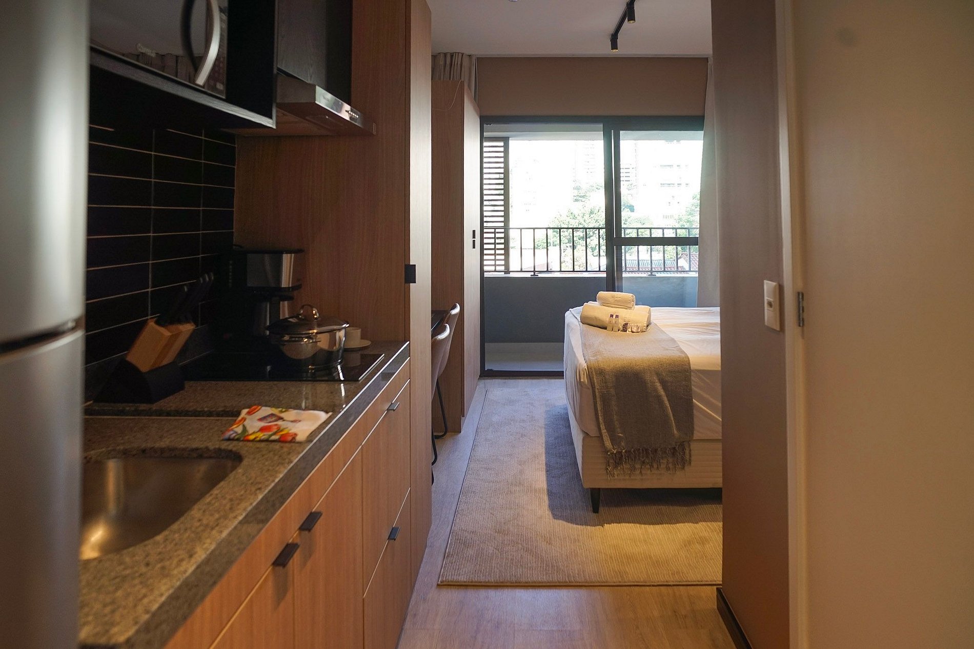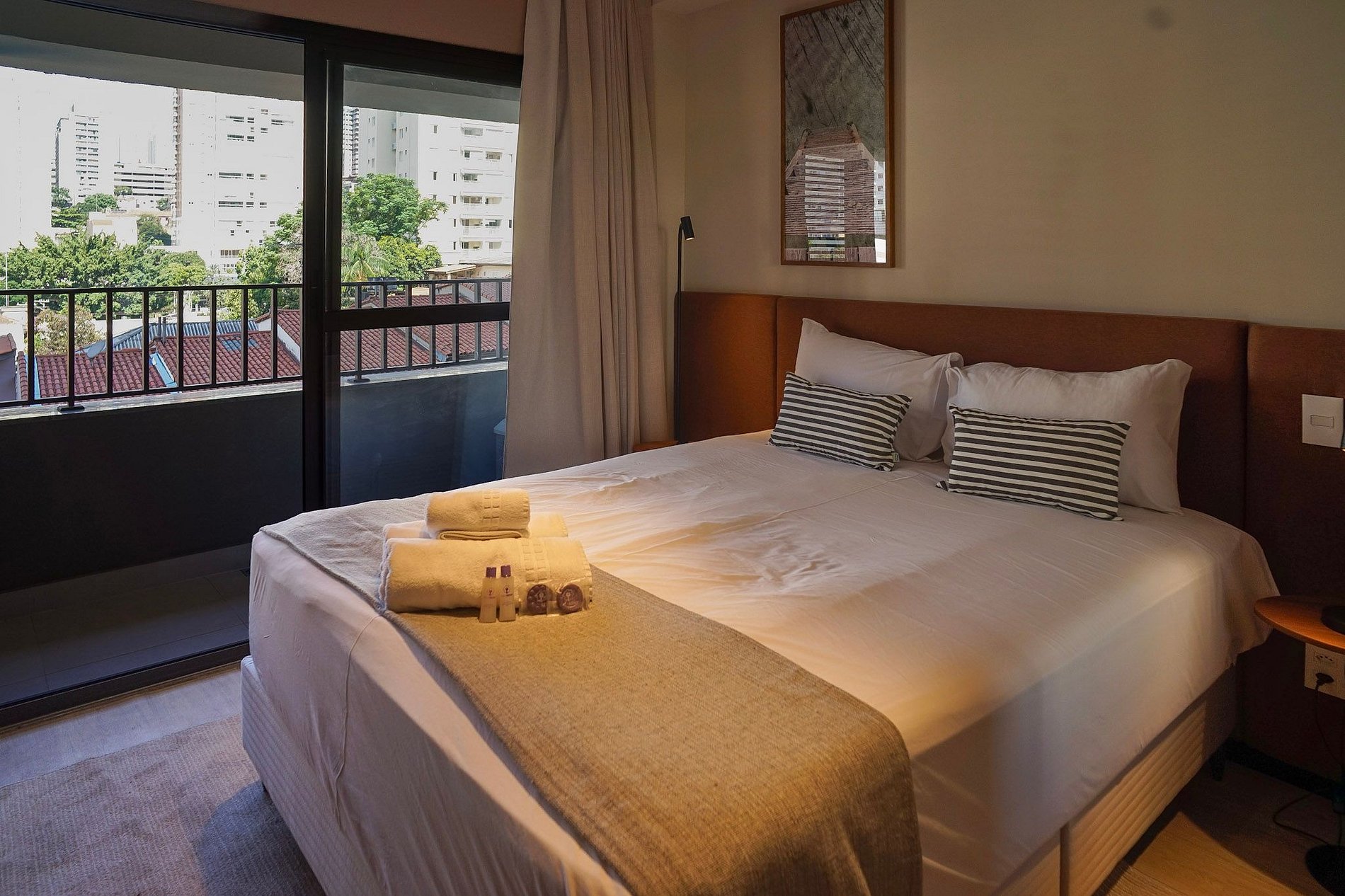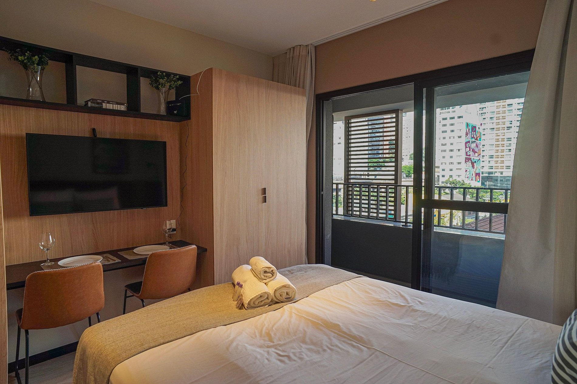 Conta com enxoval de cama e banho (sem reposição ou trocas), cozinha compacta com utensílios para o preparo de pequenas refeições, banheiro com secador de cabelo e uma charmosa varanda.
