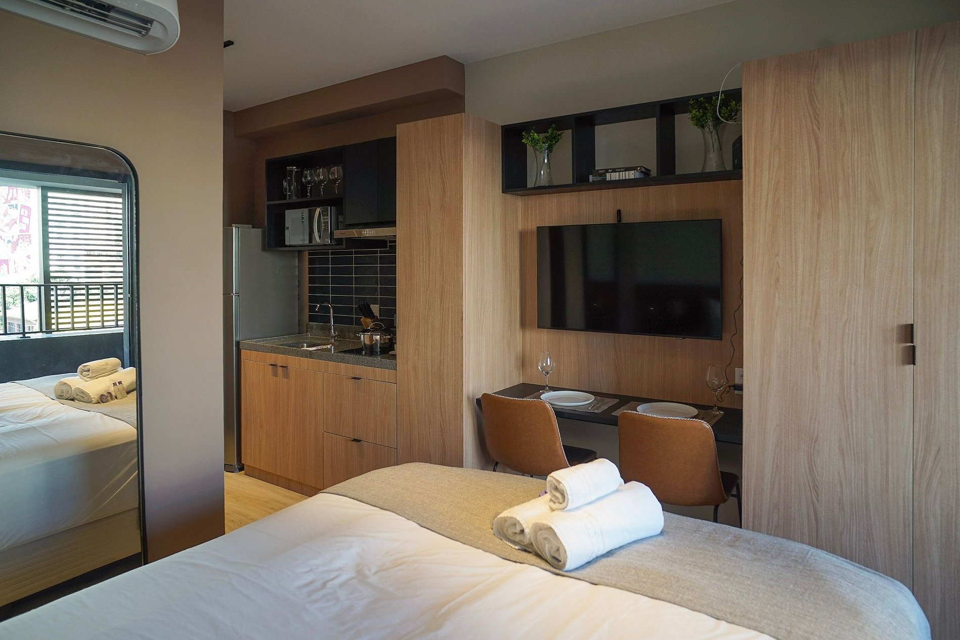O apartamento também dispõe de ar-condicionado (somente refrigeração) e de uma varanda charmosa, que deixa o ambiente mais agradável com a entrada de luz natural.