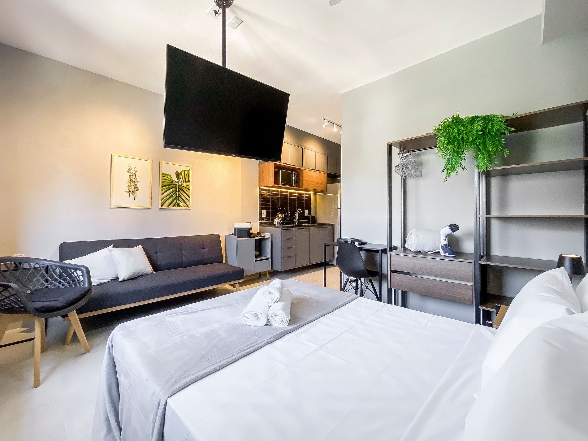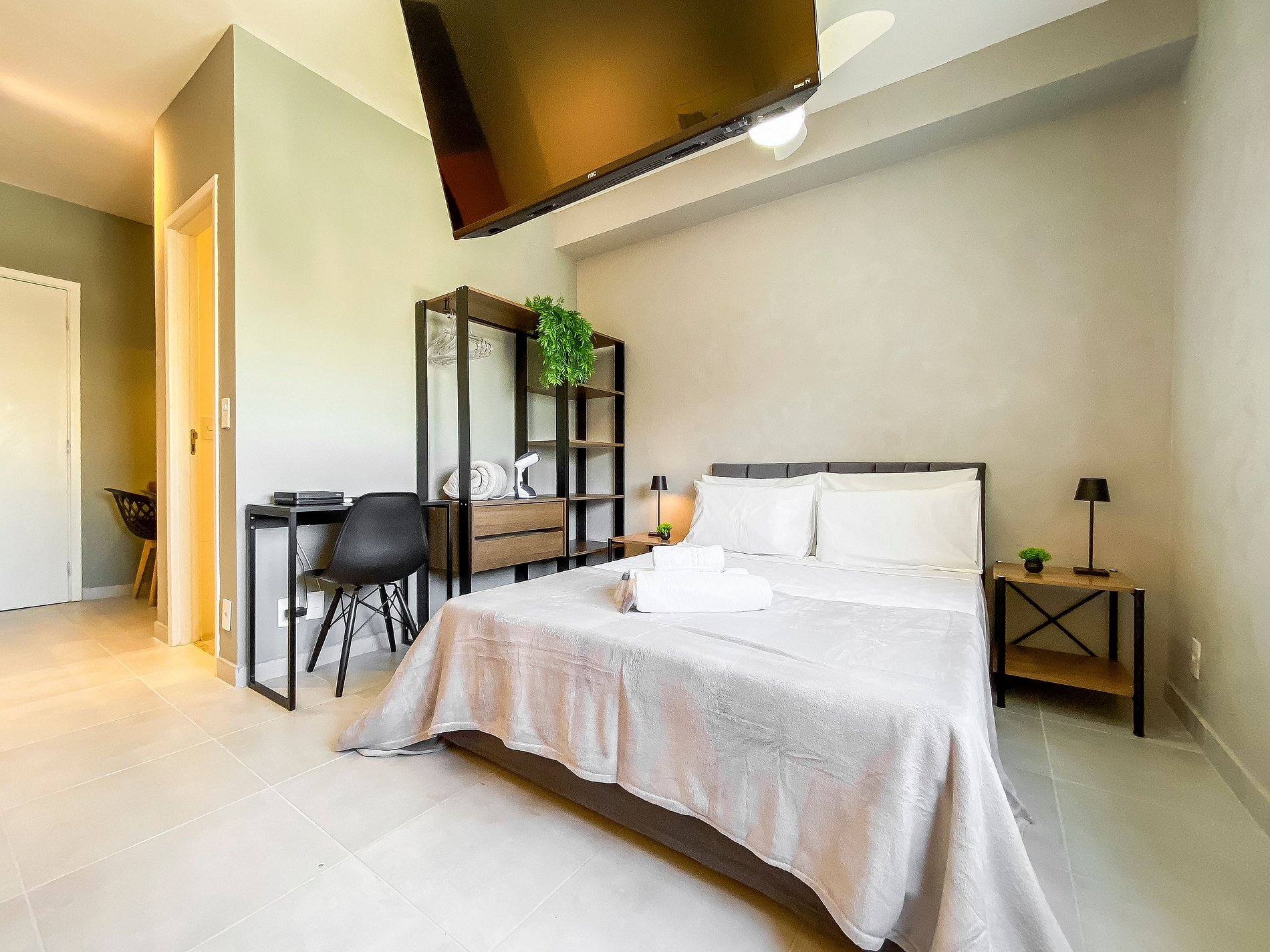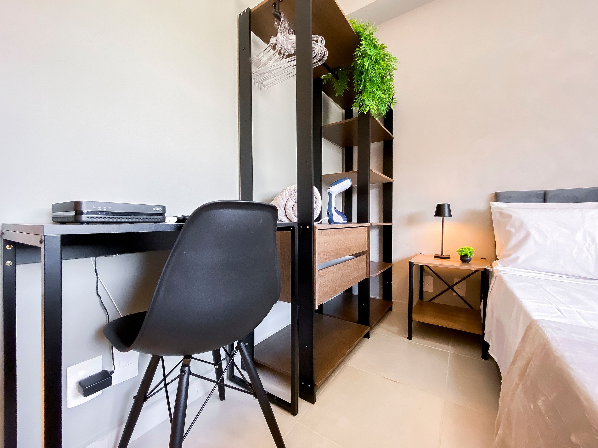 Oferecemos tudo o que você precisa! Desde jogo de cama/banho até utensílios do dia a dia. - Internet Wi-Fi 250 Mbps - Smart TV 40" (não disponibilizamos login de acesso nas plataformas de streaming) - Cozinha equipada - Roupas de cama - Toalhas - Portaria 24 horas - O condomínio ainda conta com piscina, academia, lavanderia e espaço de co-working