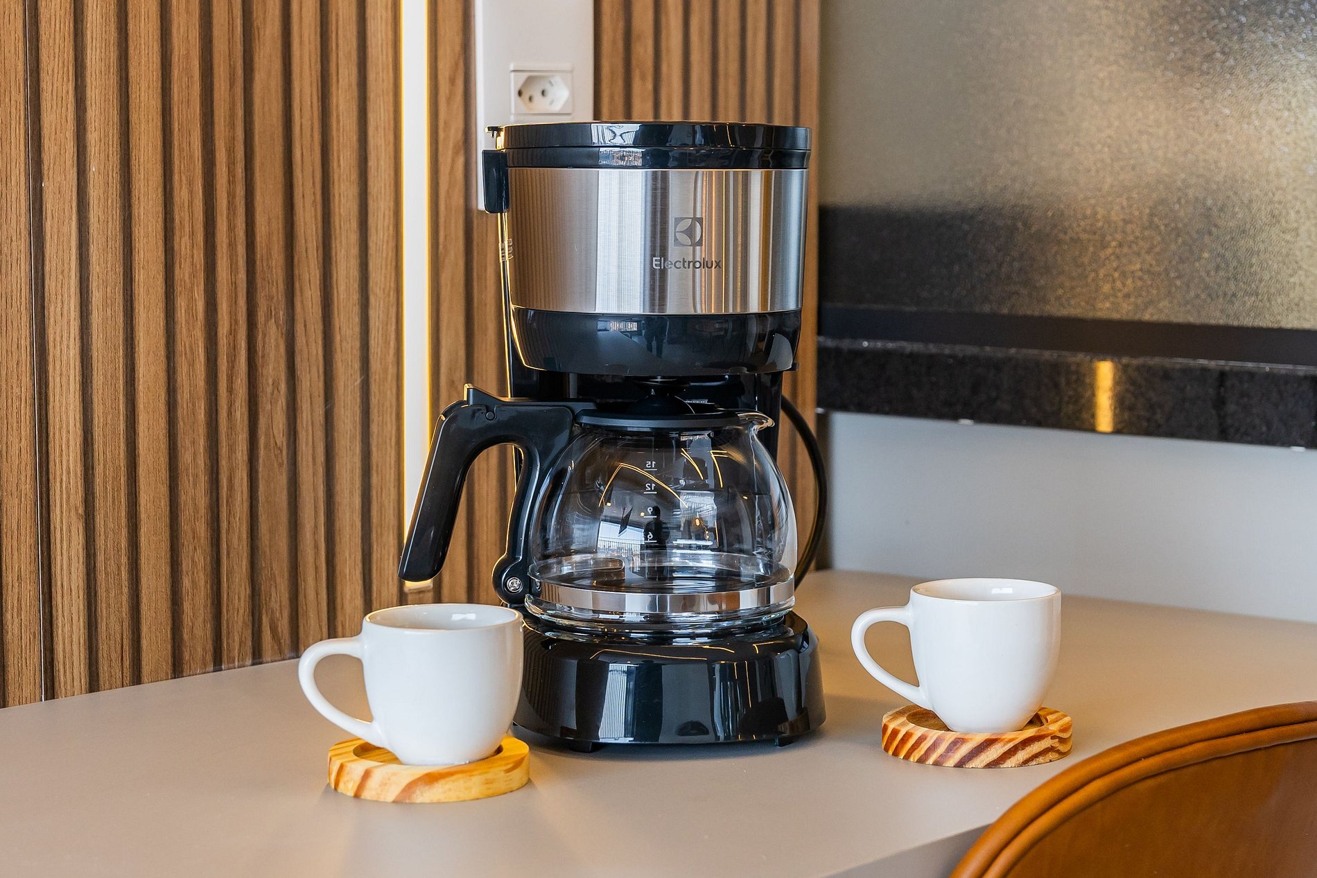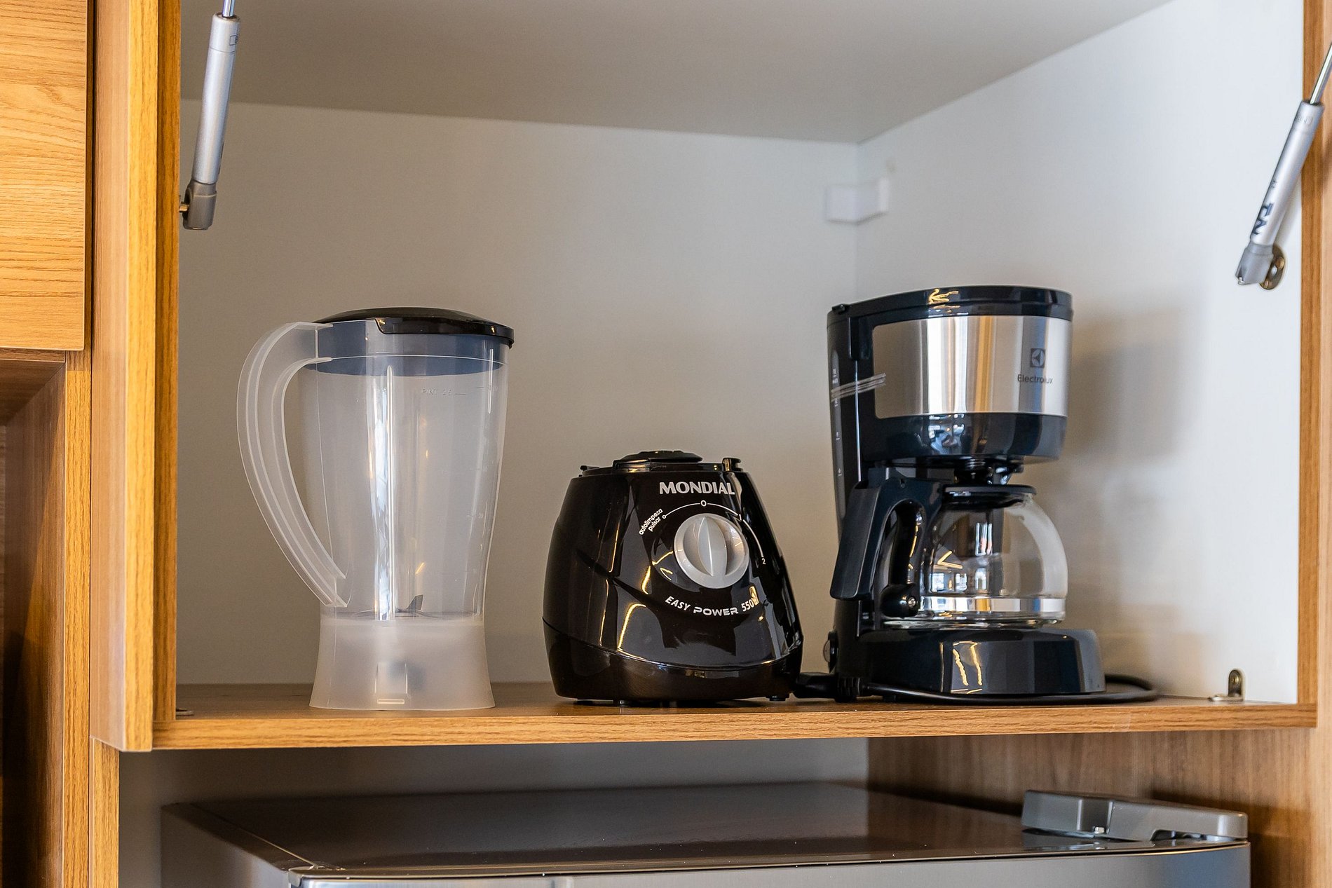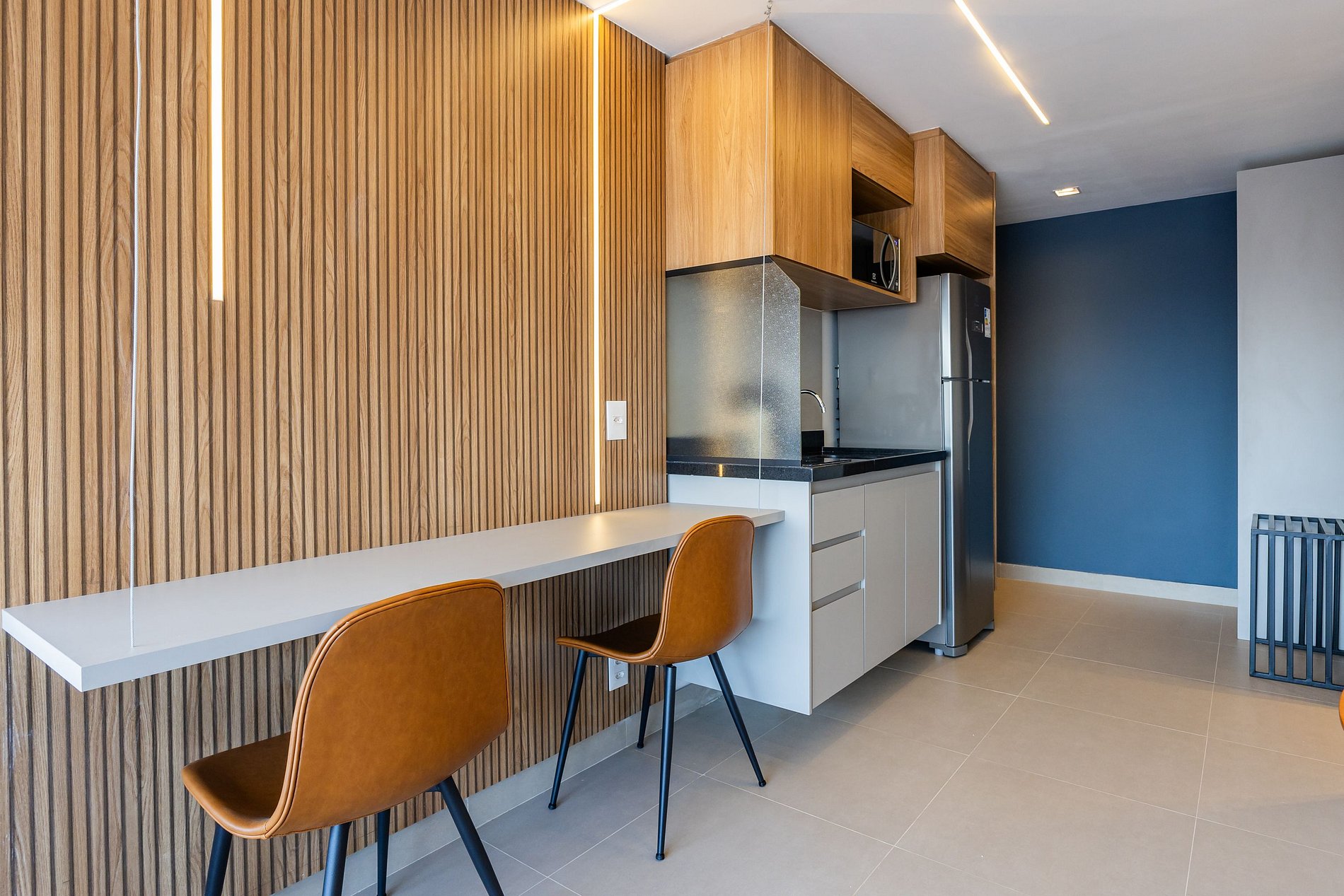 A cozinha equipada com itens básicos permite o preparo de pequenas refeições, garantindo mais autonomia no dia a dia.