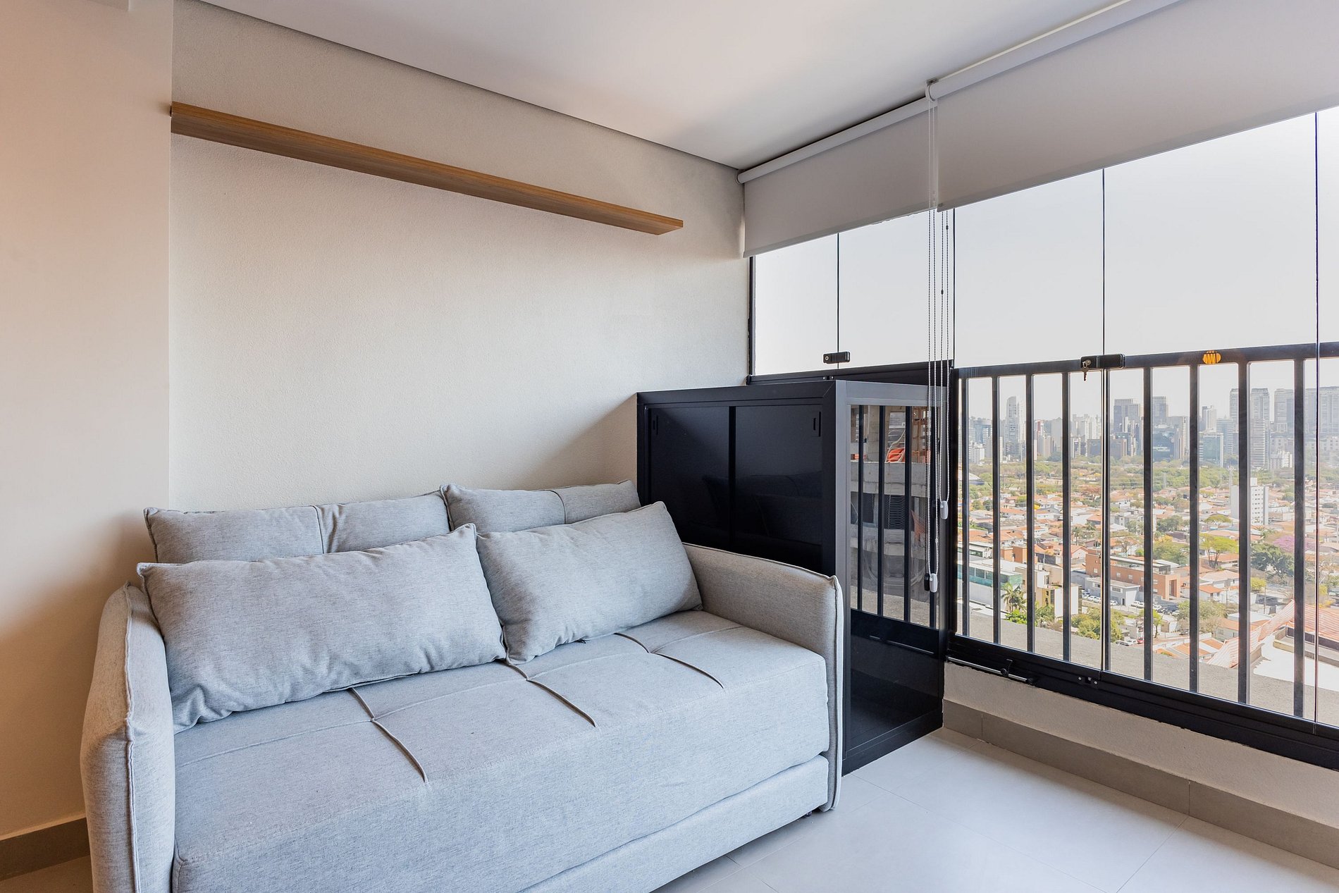 O espaço também conta com ar-condicionado (somente refrigeração) e uma charmosa varanda, que deixa o ambiente mais agradável com a entrada de luz natural.