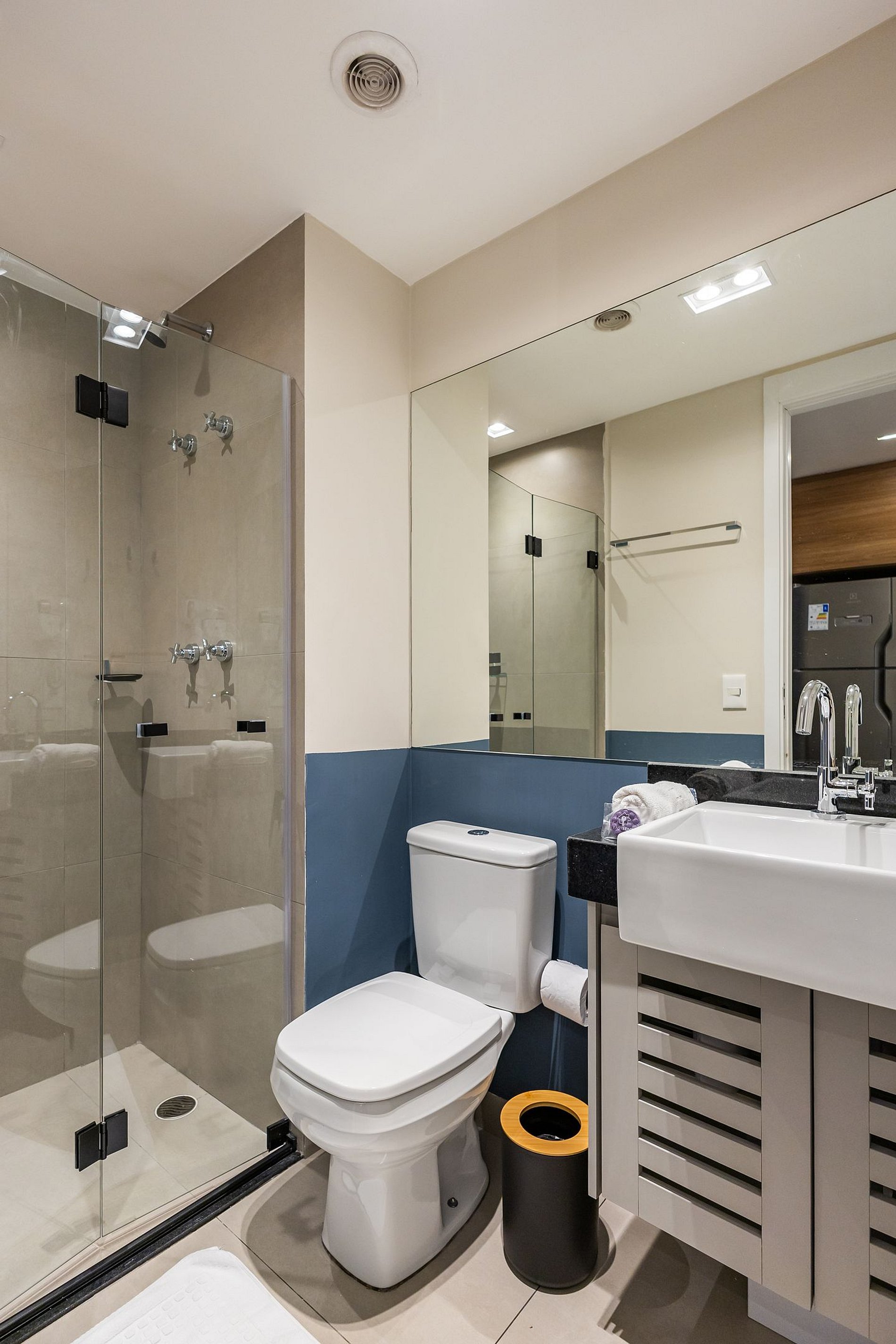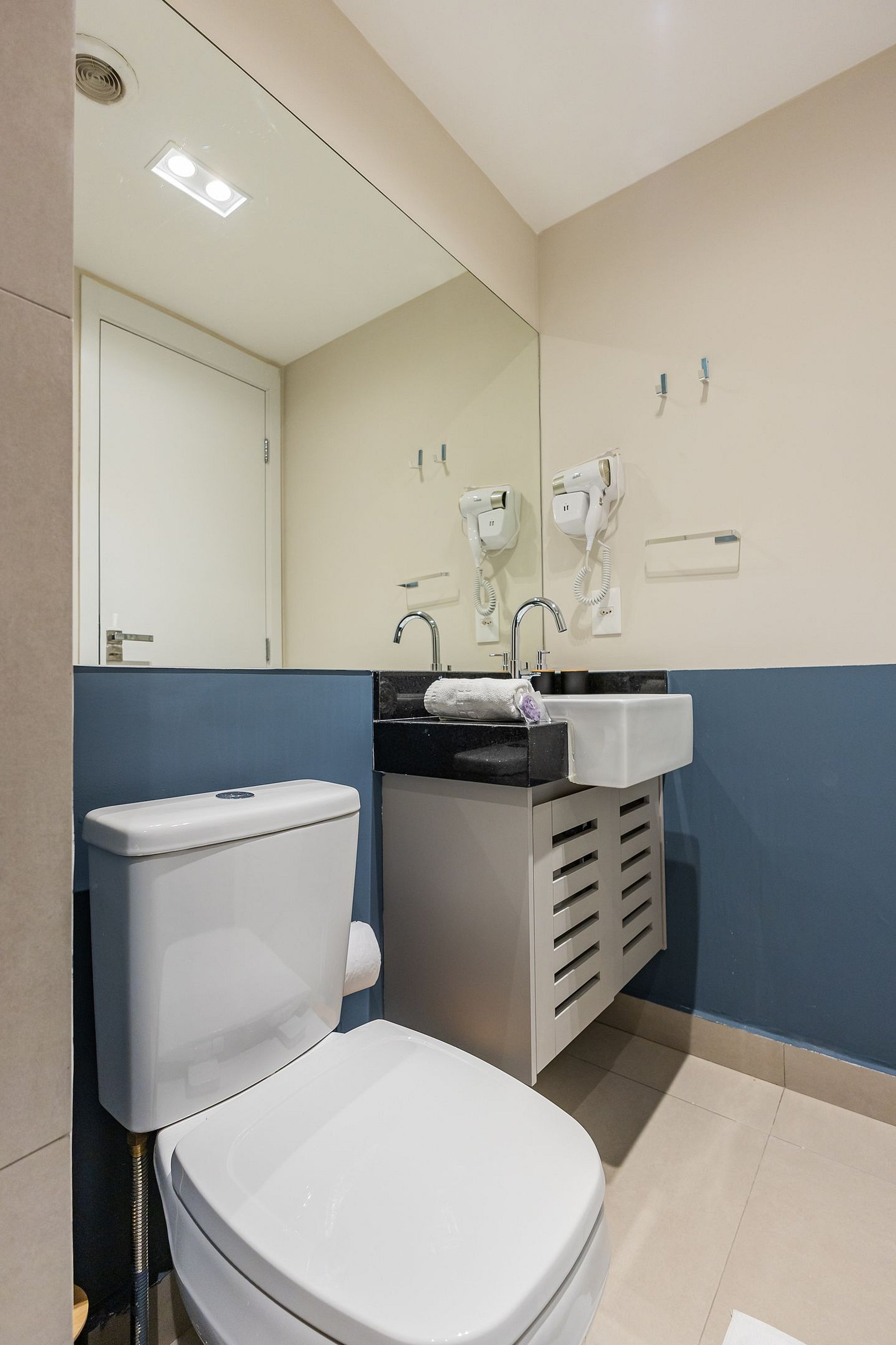 Por fim, o banheiro com secador de cabelo traz ainda mais praticidade para a sua rotina.